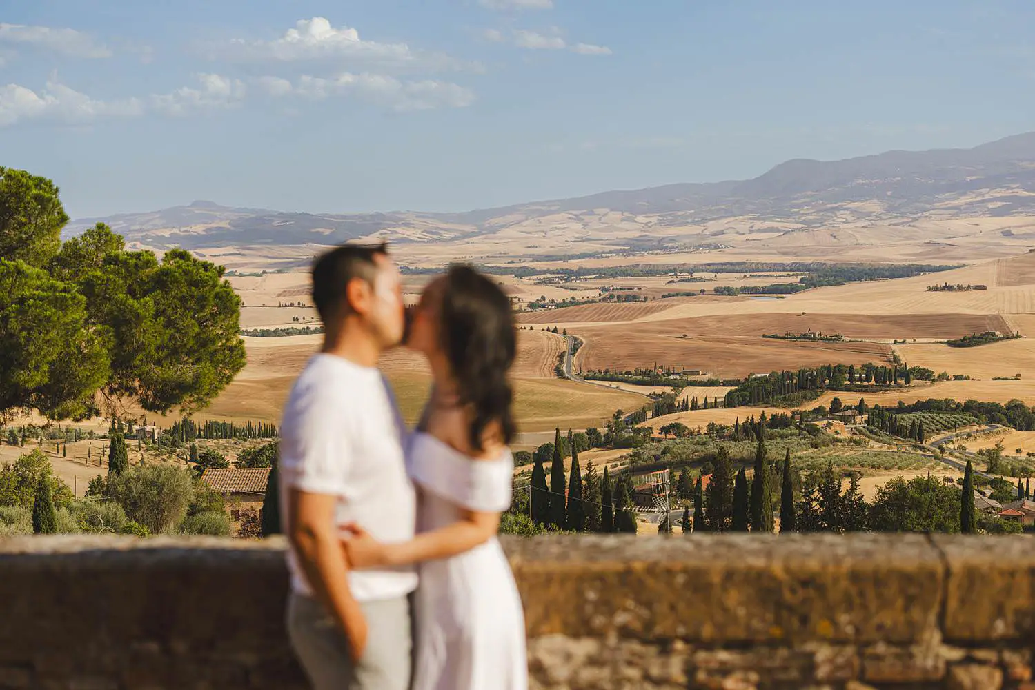 Unforgettable couple photo shoot in Pienza iconic panoramic site. Photo by the Italian creative and modern engagement photographer in Tuscany Gabriele Fani