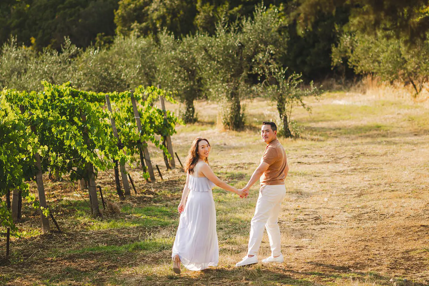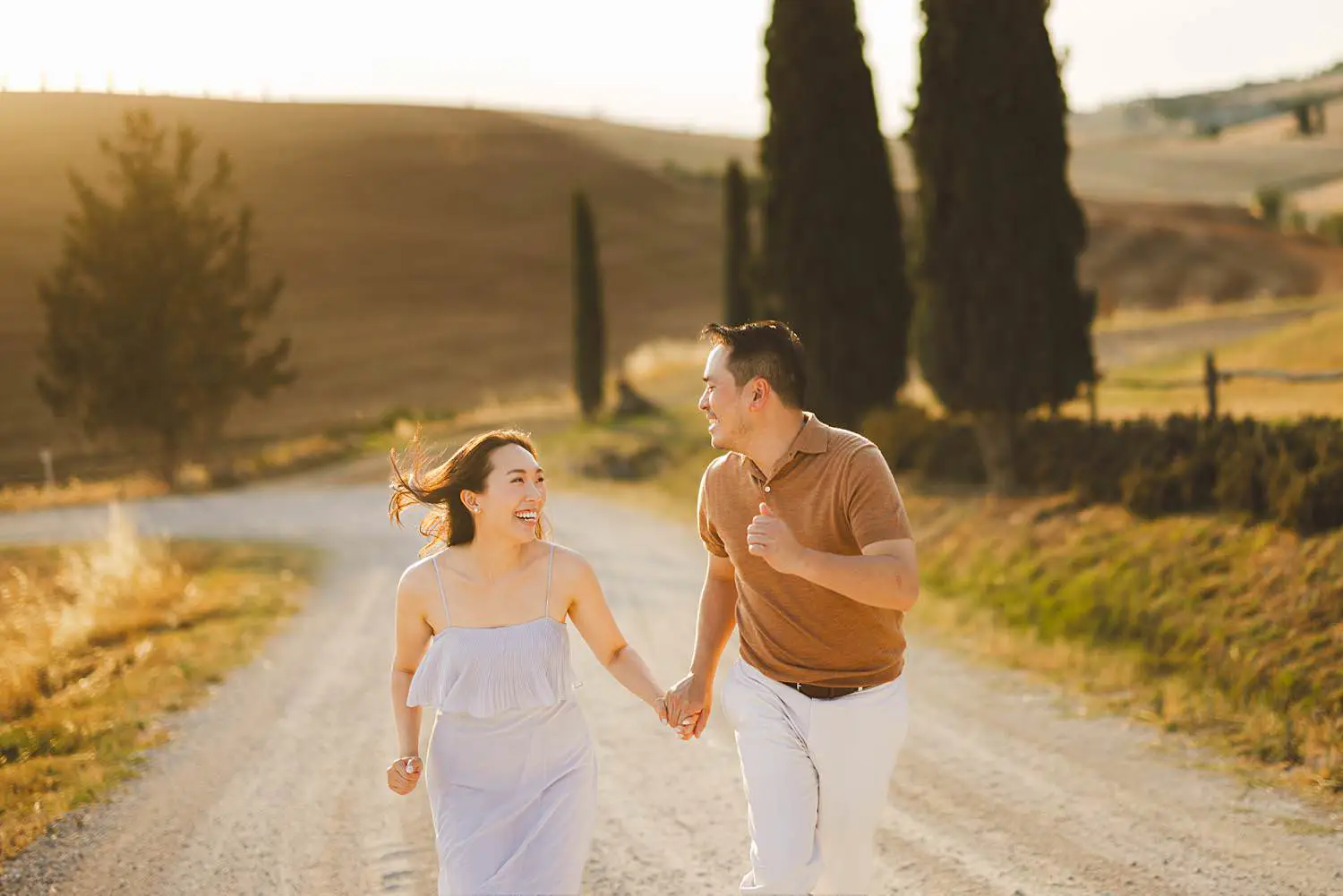 Exciting couple photo shoot under warm golden light near Vitaleta Chapel. Photo by the Italian creative and modern engagement photographer in Tuscany Gabriele Fani