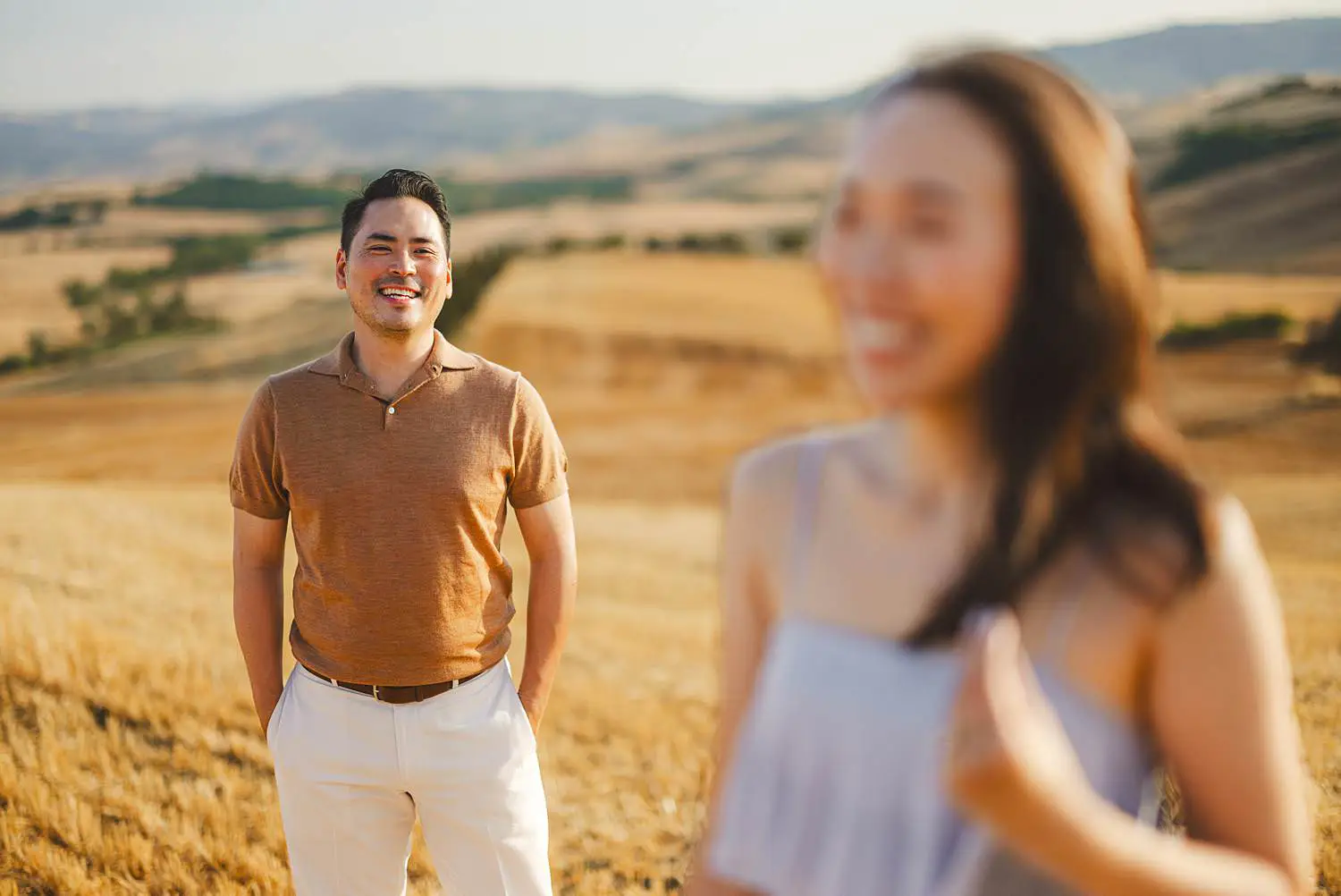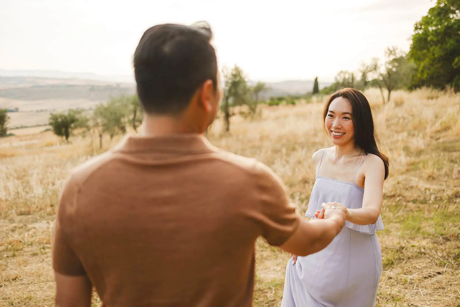 Engagement photo shoot experience filled with laughter, connection, and genuine emotion in the countryside of Pienza. Photo by the Italian creative and modern engagement photographer in Tuscany Gabriele Fani