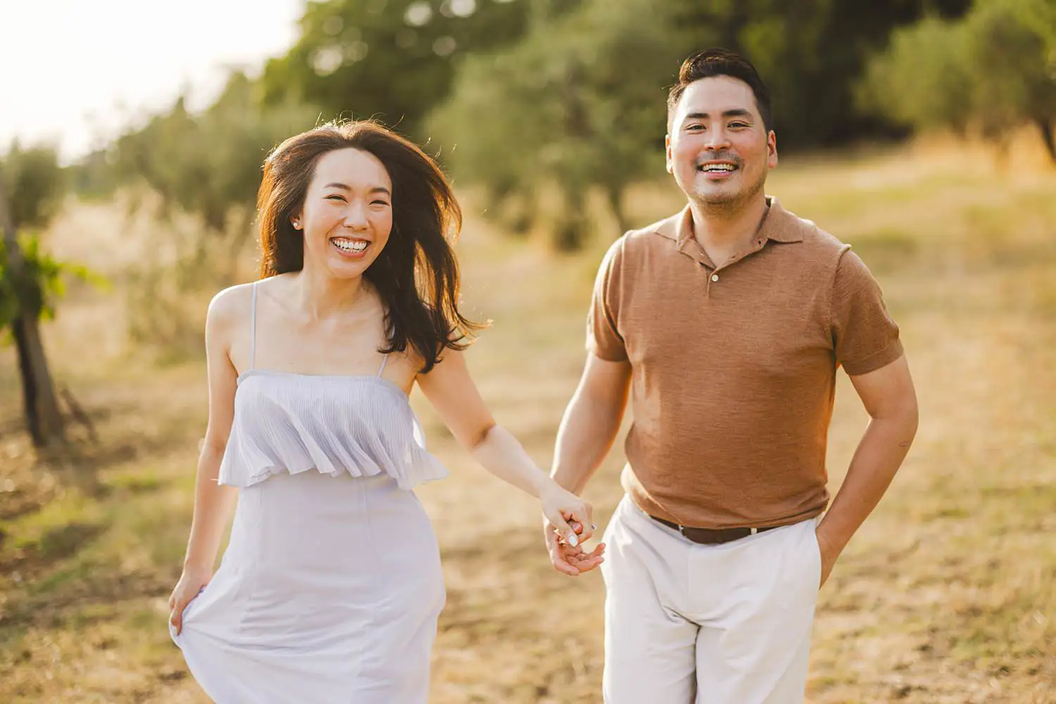 Spontaneous couple photo shoot under warm golden light near Vitaleta Chapel. Photo by the Italian creative and modern engagement photographer in Tuscany Gabriele Fani