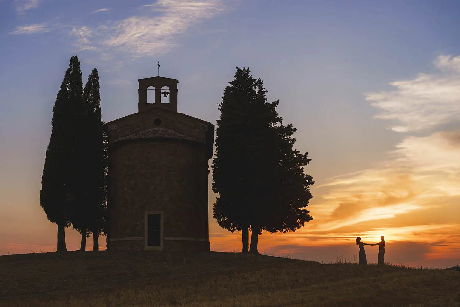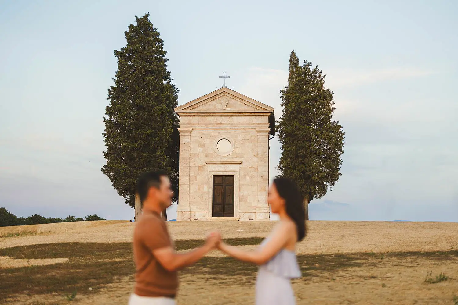 Engagement photo shoot at Chapel of Vitaleta at sunset. Photo by the Italian creative and modern engagement photographer in Tuscany Gabriele Fani