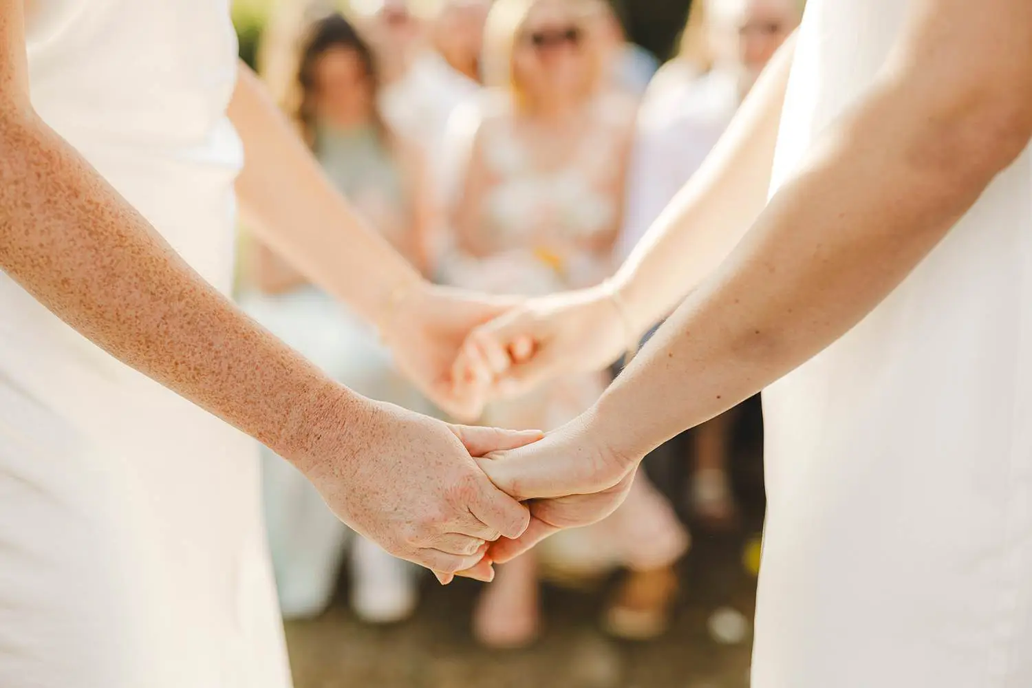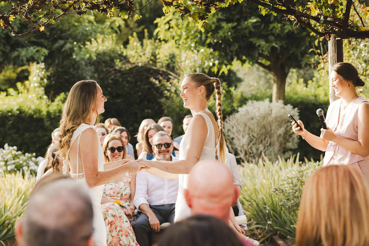 Borgo di Petrognano outdoor same sex wedding ceremony among a natural archway of greenery, with guests seated close, creating an atmosphere that felt warm and deeply connected. Photo by the Italian documentary wedding photographer in Tuscany based Florence Gabriele Fani