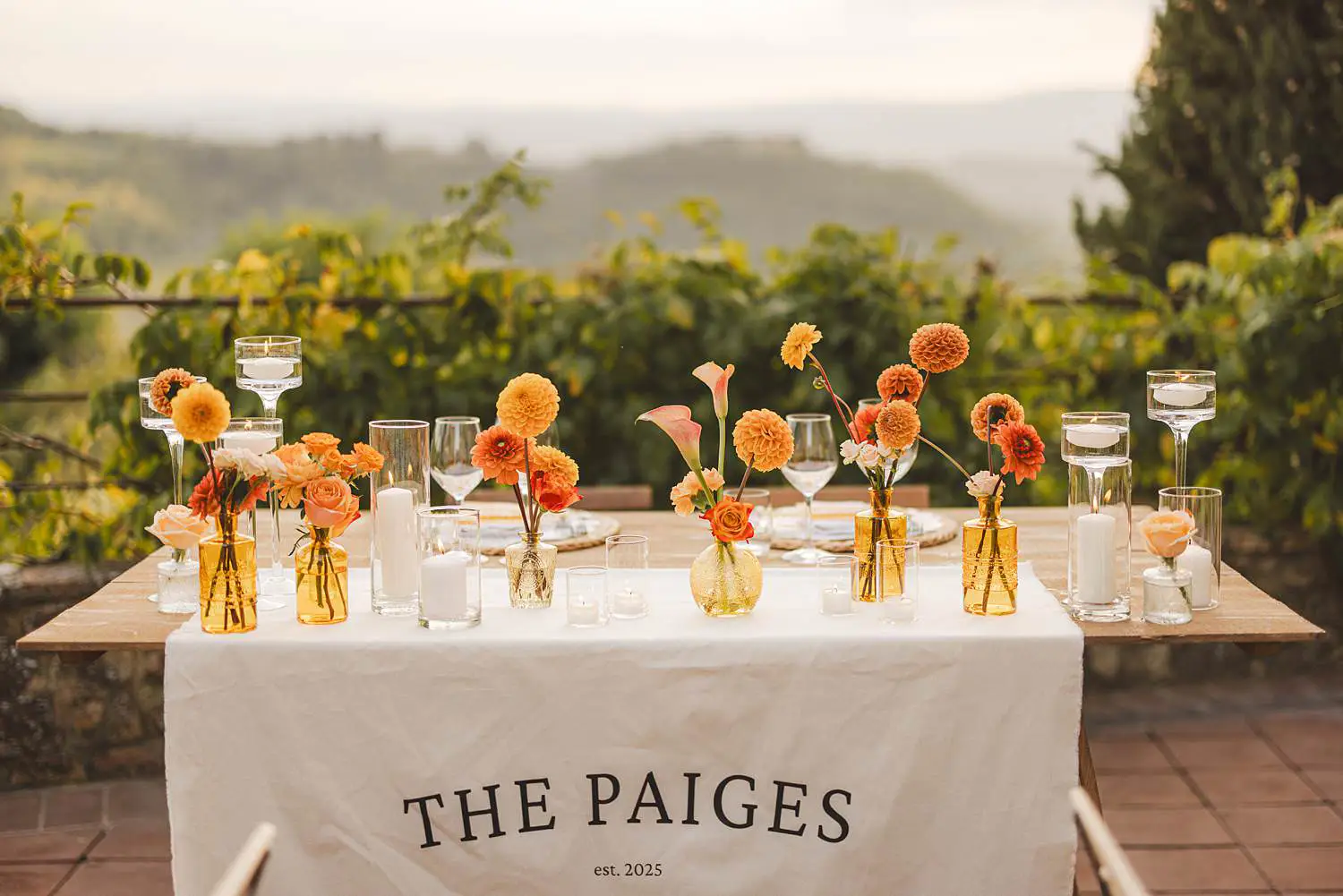 A personalized table for the brides, marked “The Paiges,” overlooked the landscape, creating a stunning focal point for the evening.