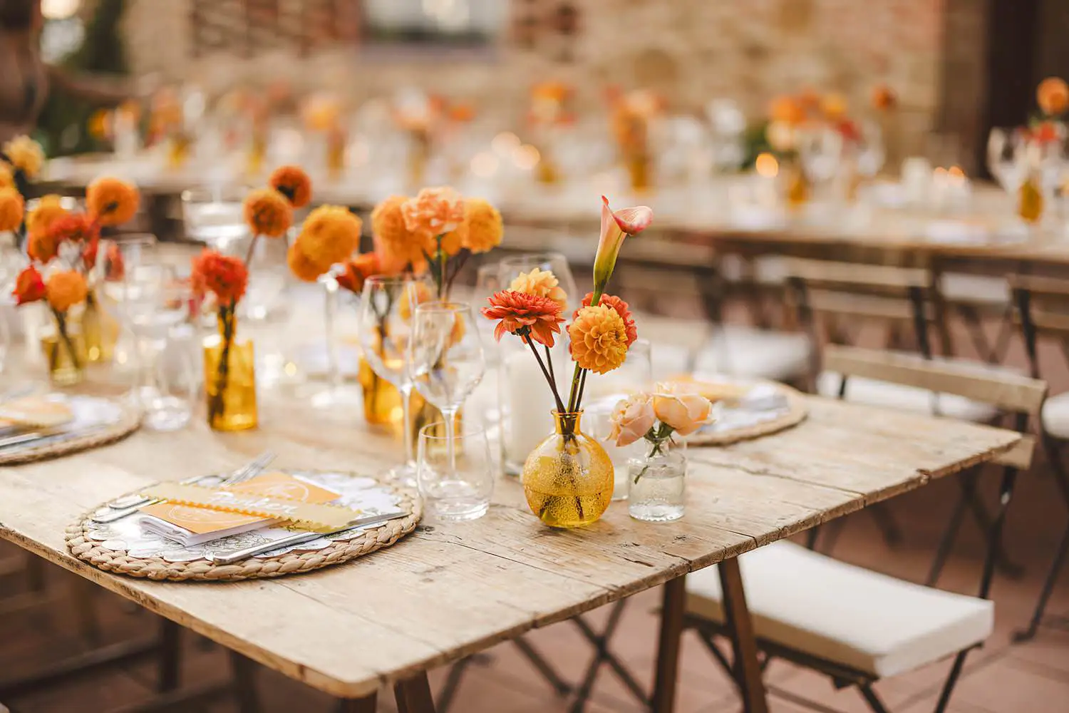 Elegant wedding dinner table decoration with warm seasonal florals in shades of orange at Borgo di Petrognano. Photo by the Italian documentary wedding photographer in Tuscany based Florence Gabriele Fani