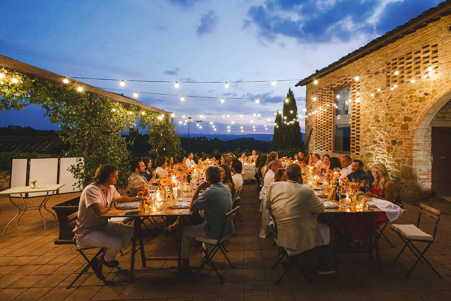 A joyful same sex dinner celebration beneath warm lights and blue sky at Borgo di Petrognano. Photo by the Italian documentary wedding photographer in Tuscany based Florence Gabriele Fani
