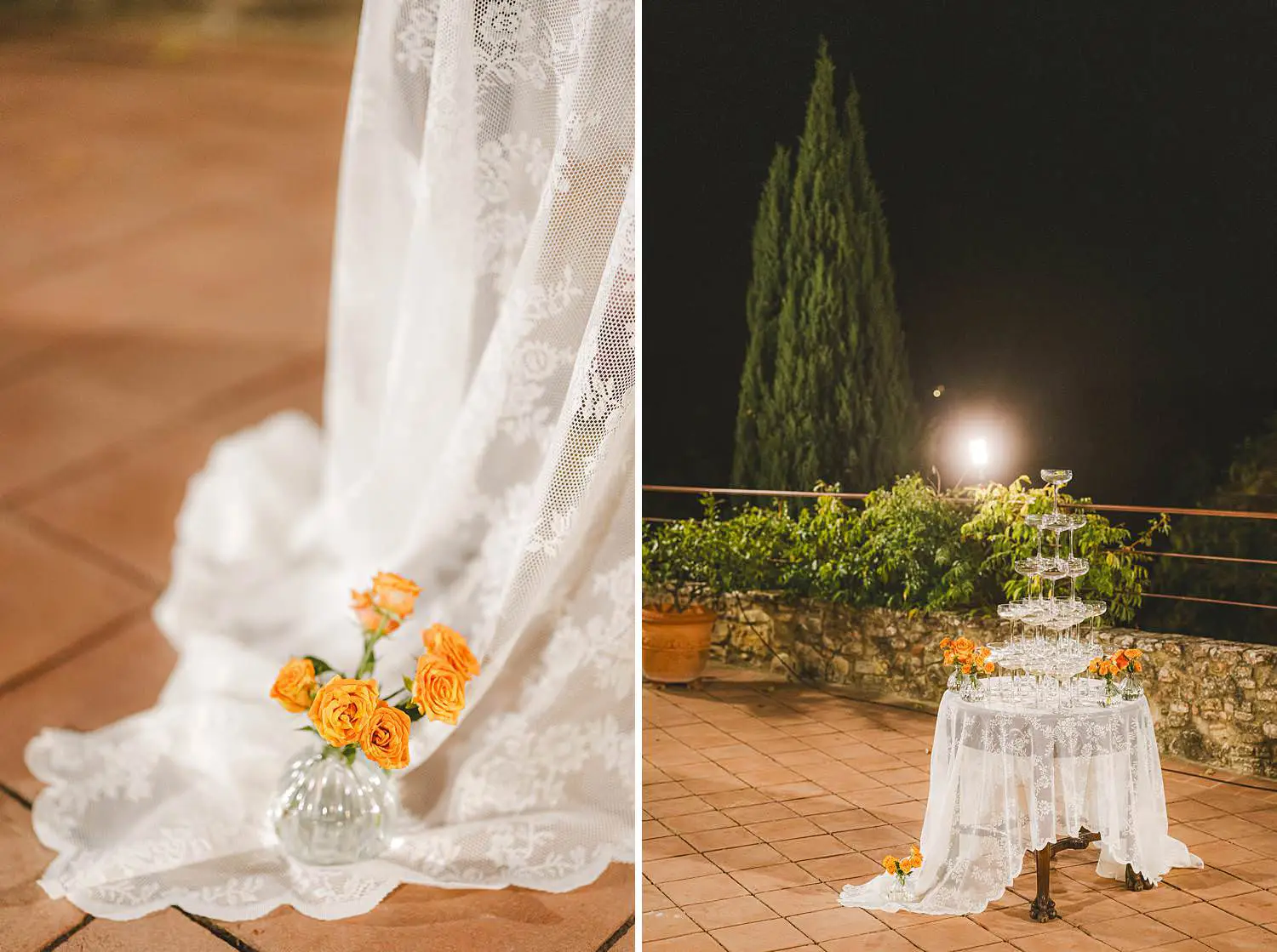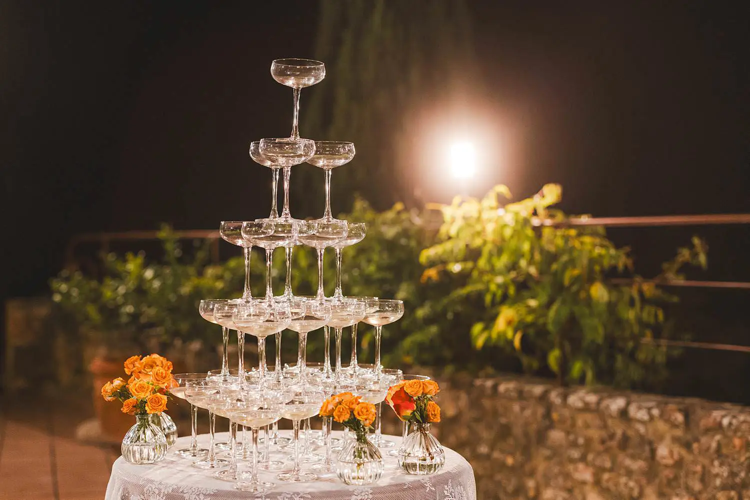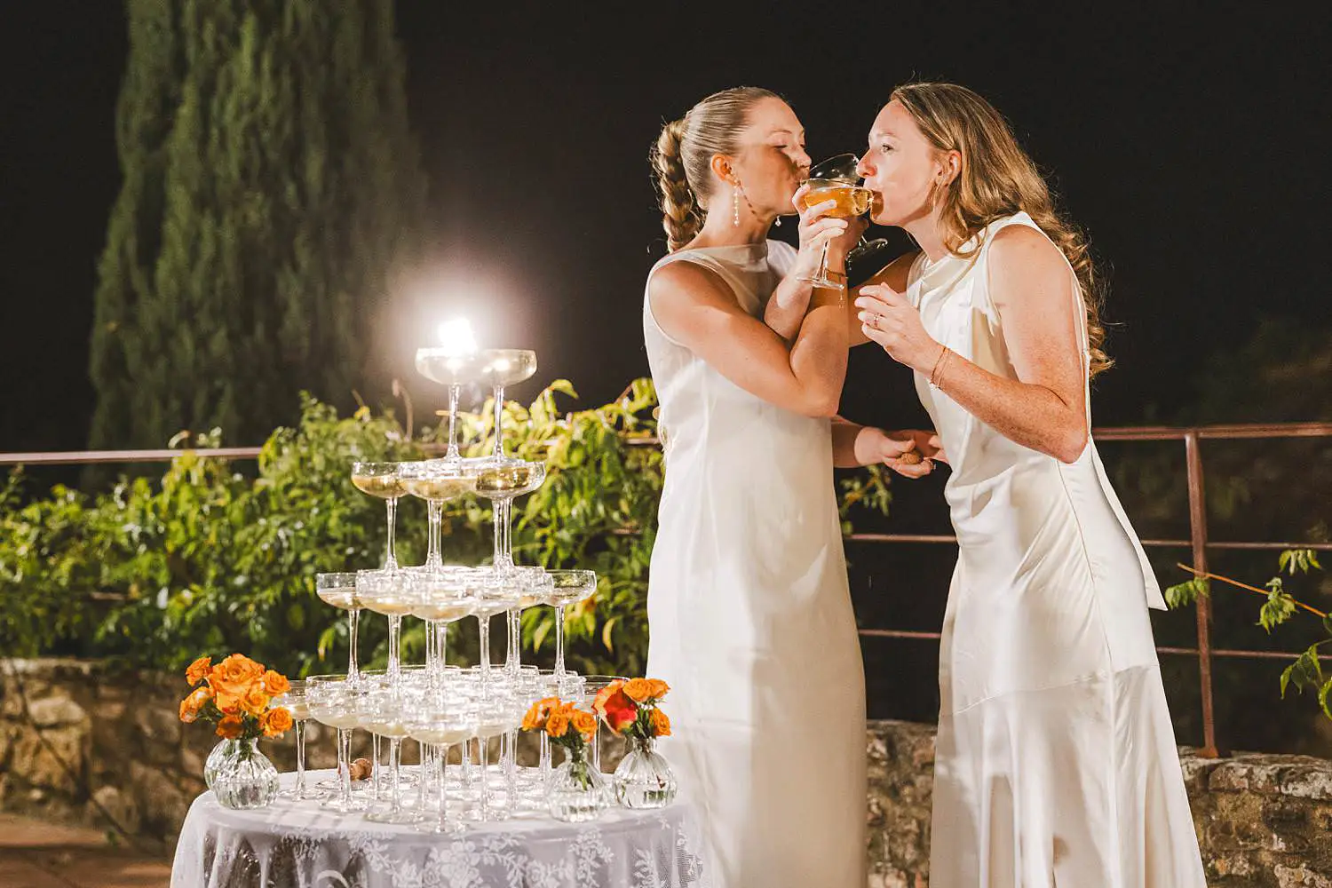 Lovely and exciting champagne tower celebration for a same sex destination wedding to remember in Tuscany at Borgo di Petrognano. Photo by the Italian documentary wedding photographer in Tuscany based Florence Gabriele Fani