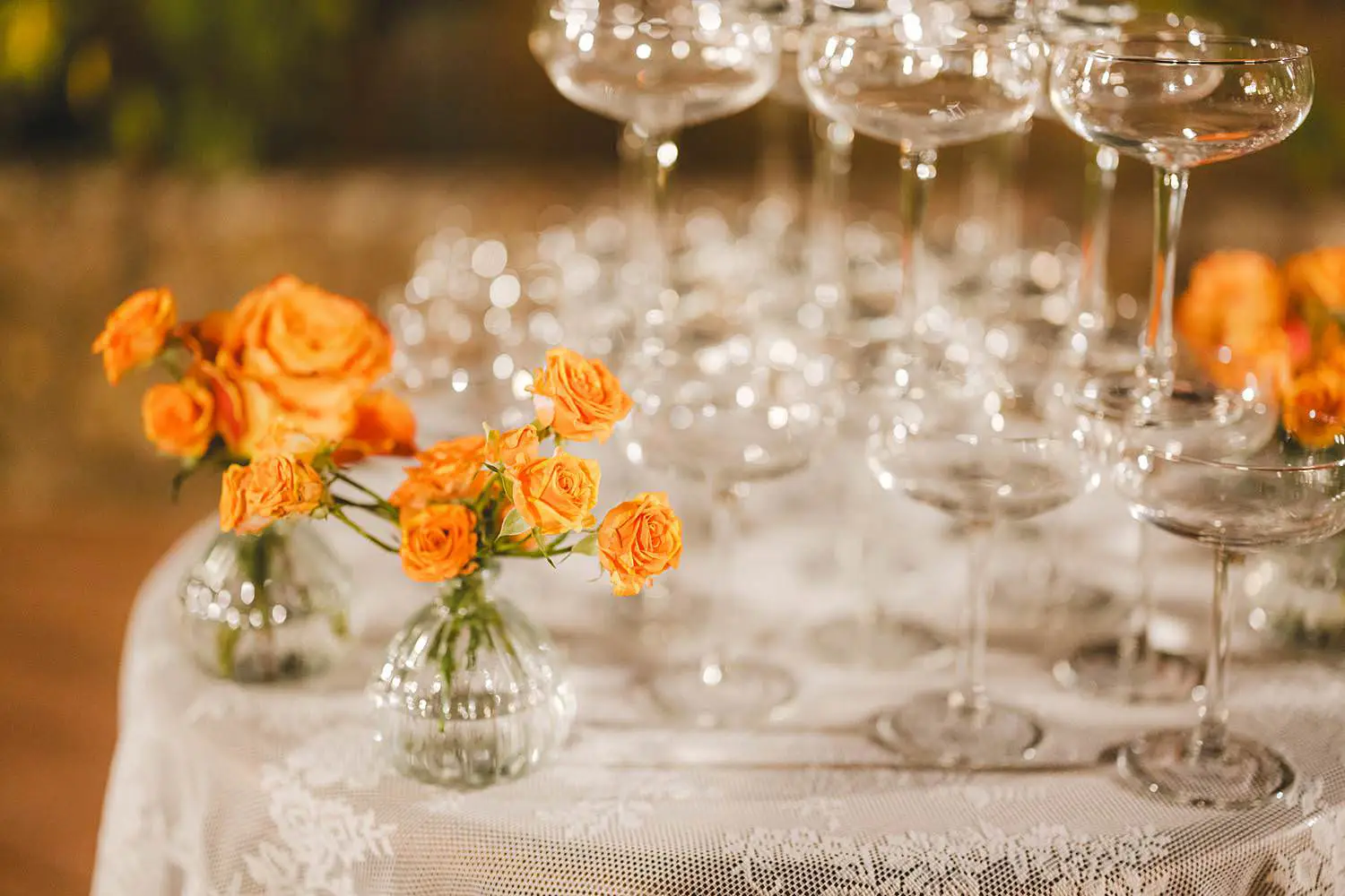 Elegant wedding dinner table decoration under Tuscan golden light with warm seasonal florals in shades of orange at Borgo di Petrognano. Photo by the Italian documentary wedding photographer in Tuscany based Florence Gabriele Fani
