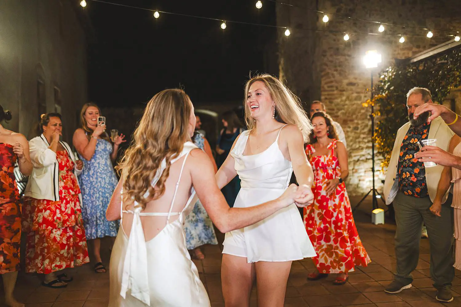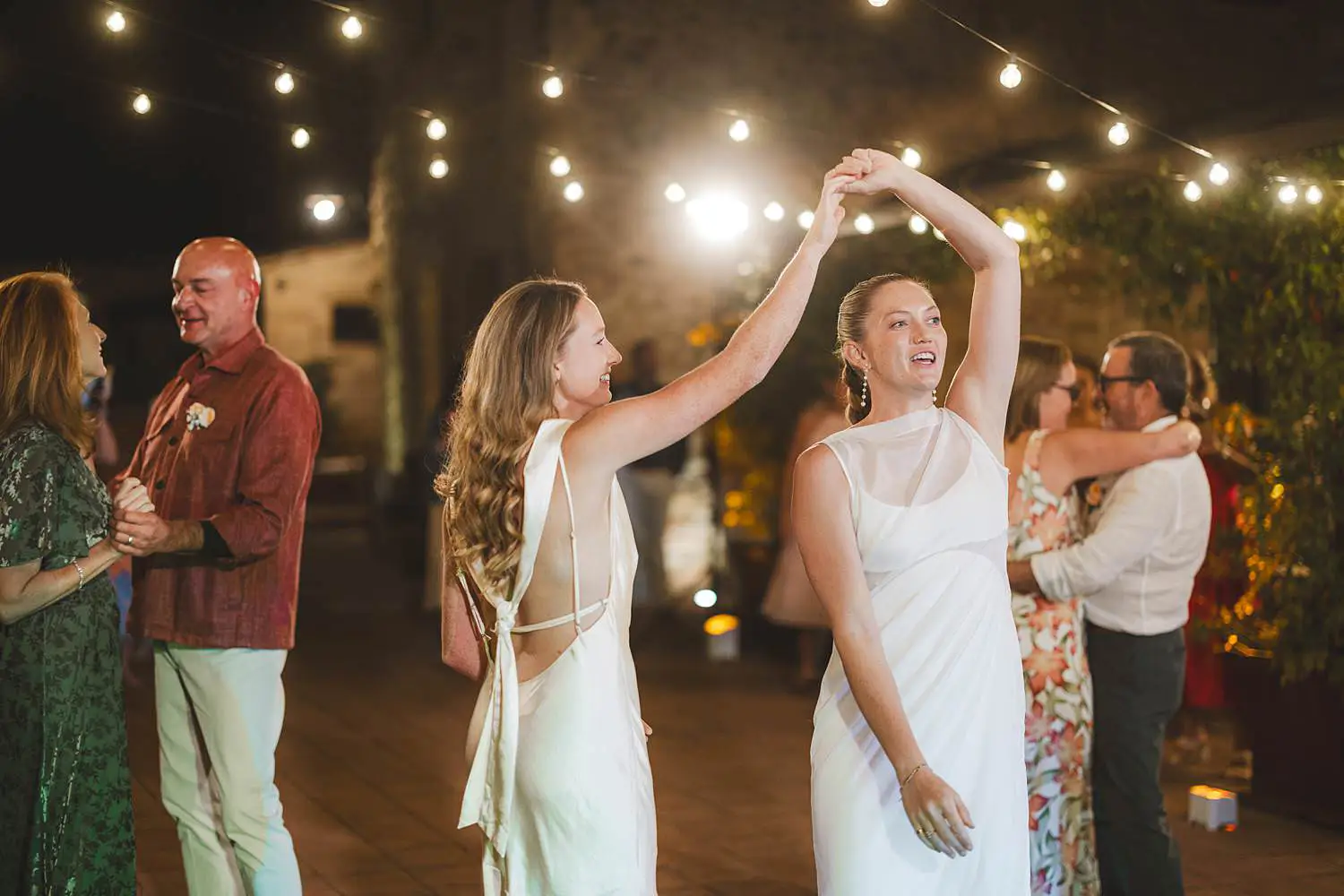 Exciting dancing under the Tuscan night at Borgo di Petrognano same sex wedding, surrounded by people who feel like home. Photo by the Italian documentary wedding photographer in Tuscany based Florence Gabriele Fani