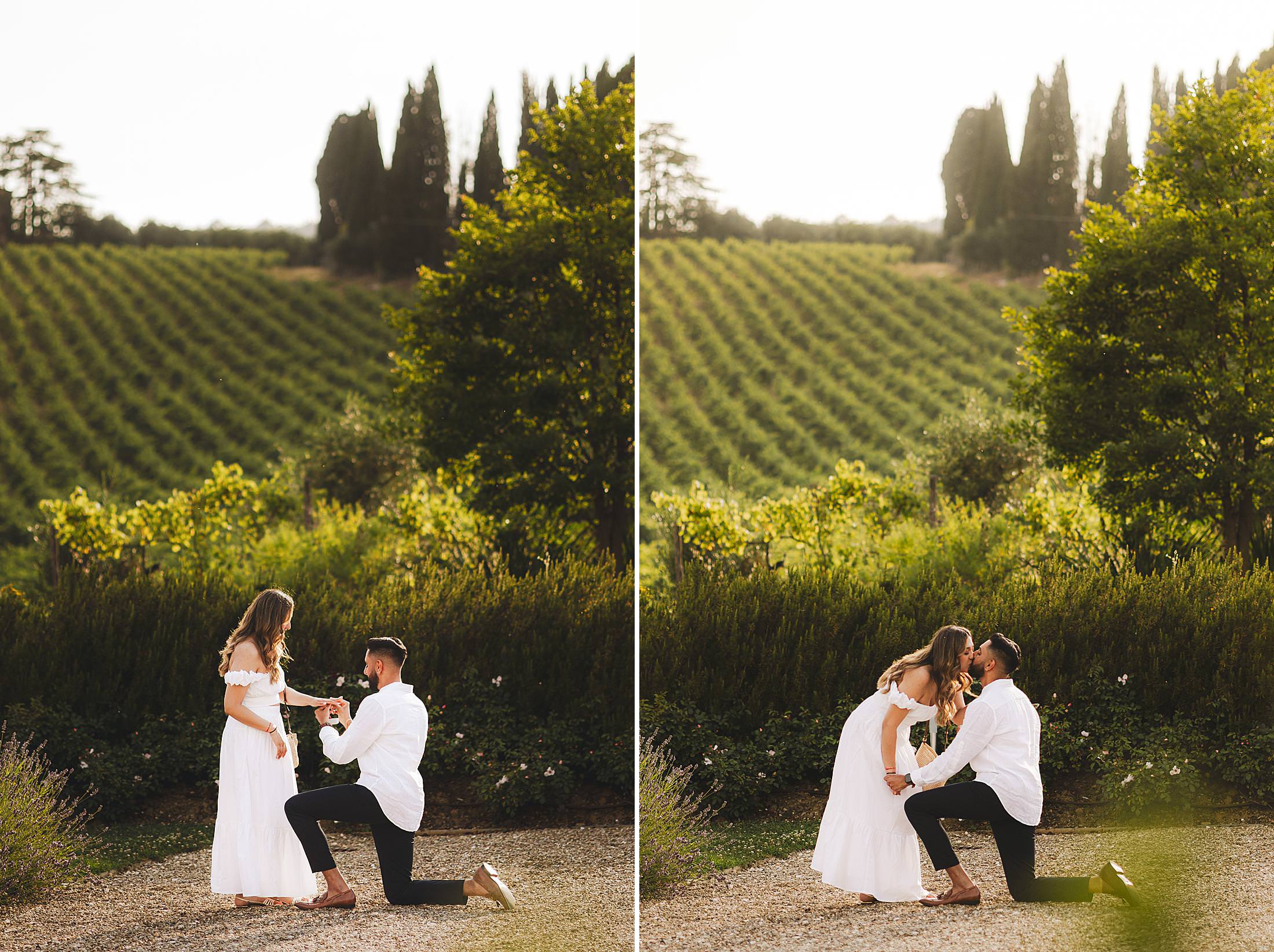 Elegant and classic wedding secret proposal in Chianti countryside at Borgo del Cabreo during golden hour. Photo by the Italian elegant creative and modern engagement photographer in Tuscany based Florence Gabriele Fani