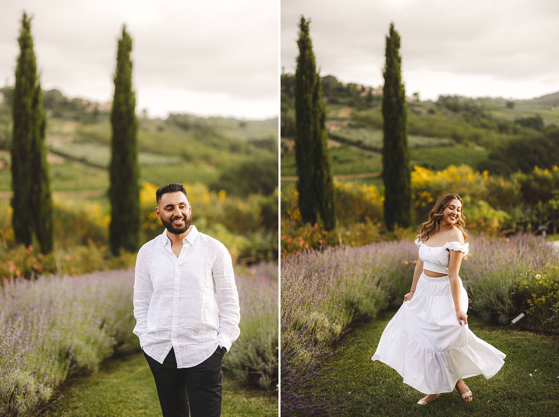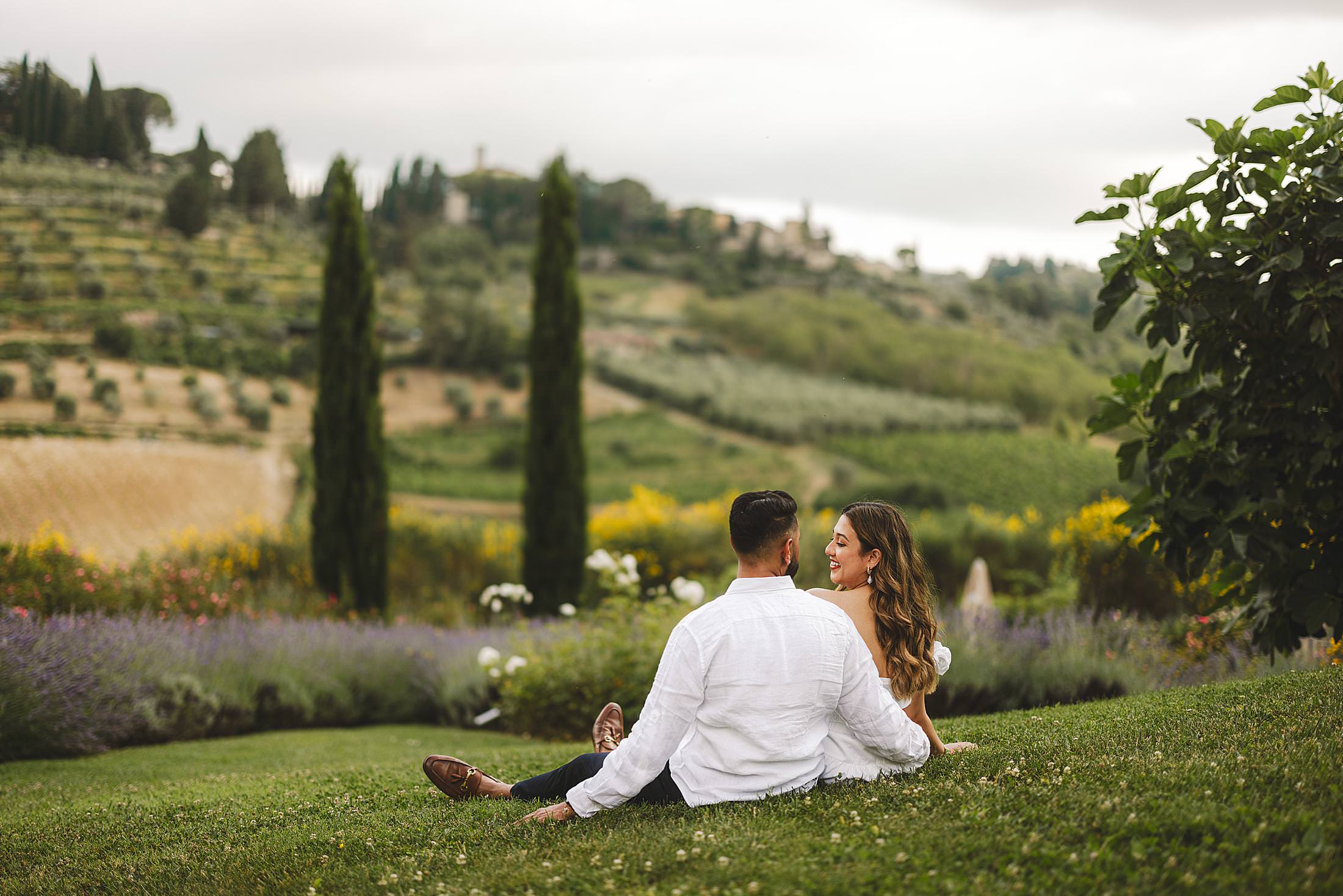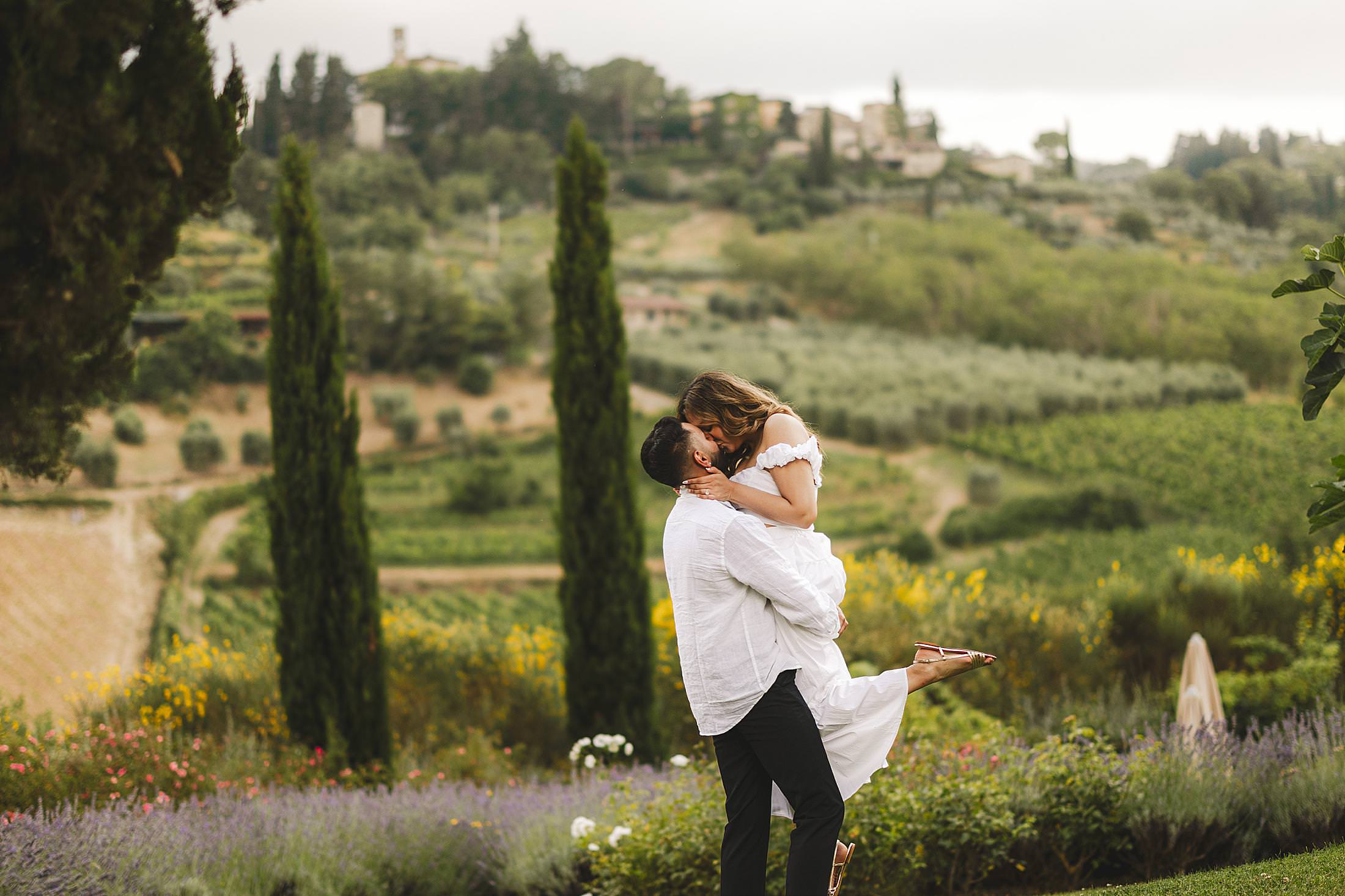 Borgo del Cabreo, with its many photographic spots, was the most graceful frame one could think of. From the rustic exposed stone walls to the romantic lavender bushes, not forgetting the garden facing the hills of Chianti and the dreamy hammock for two: every puzzle piece combined to create a narration of that unrepeatable situation. Every picture I took of them is infused with spontaneity and tells a tale of a promise sealed under the Tuscan sky: a surprise that turned into a memory to treasure for the years to come.