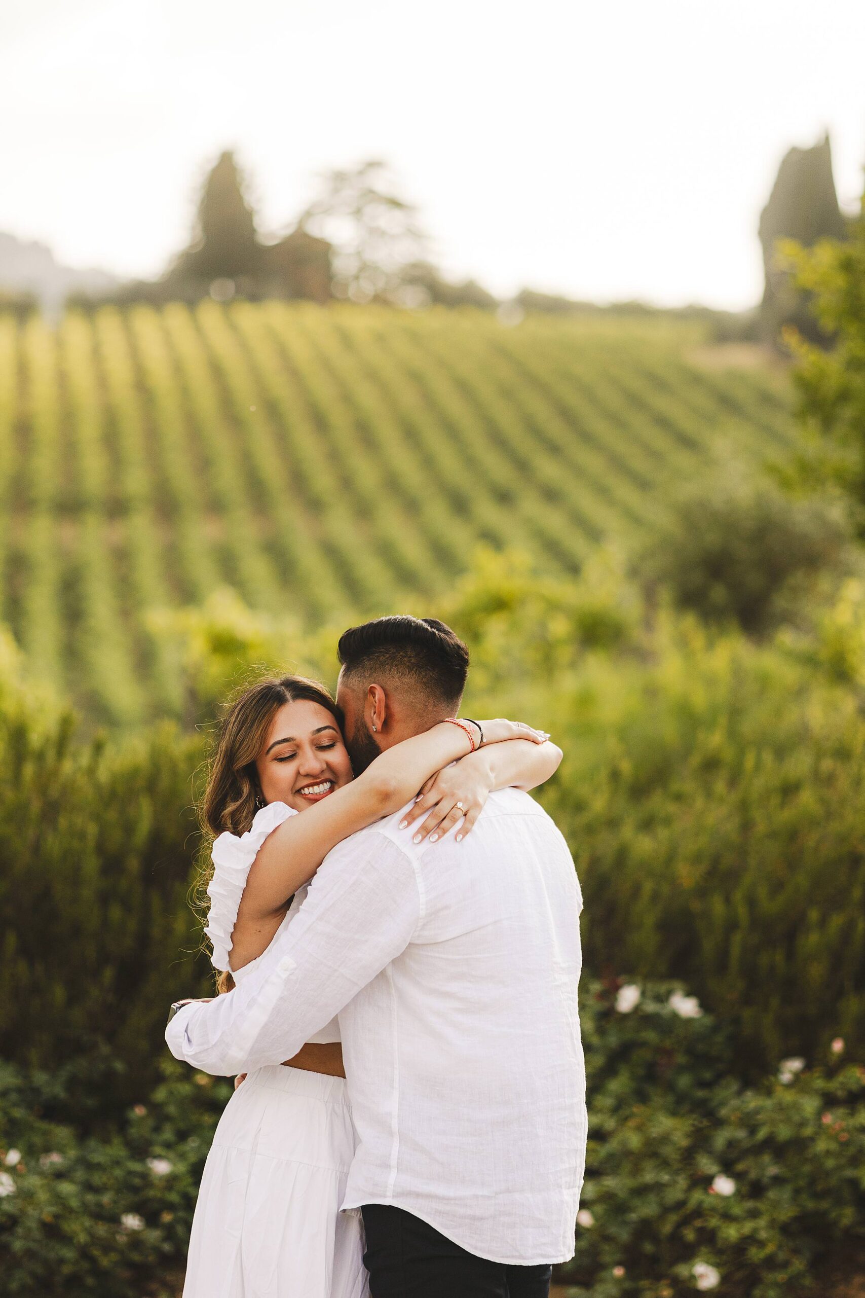 As the stage was set, Rahul led Ridhie into the heart of Borgo del Cabreo, where the secret wedding proposal unfolded seamlessly. Against a backdrop of vineyards and green rolling hills, he kneeled with the excuse of taking a picture of her… and then, out of the blue, he popped out a ring – and The Question, of course. And I, well positioned although unseen, was there to immortalize it all: the genuine surprise, the unbridled joy that followed, and the sweet effusions of love.