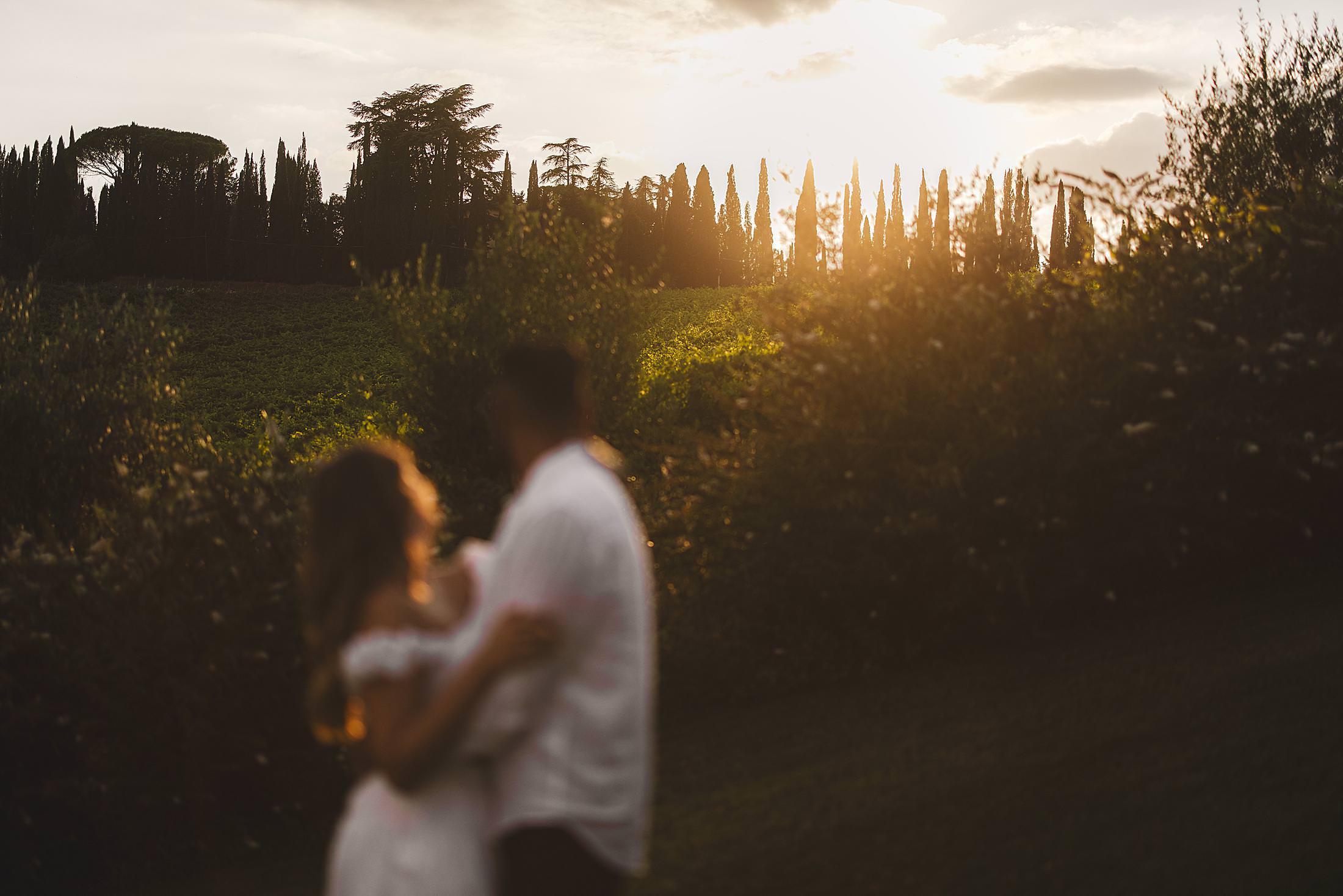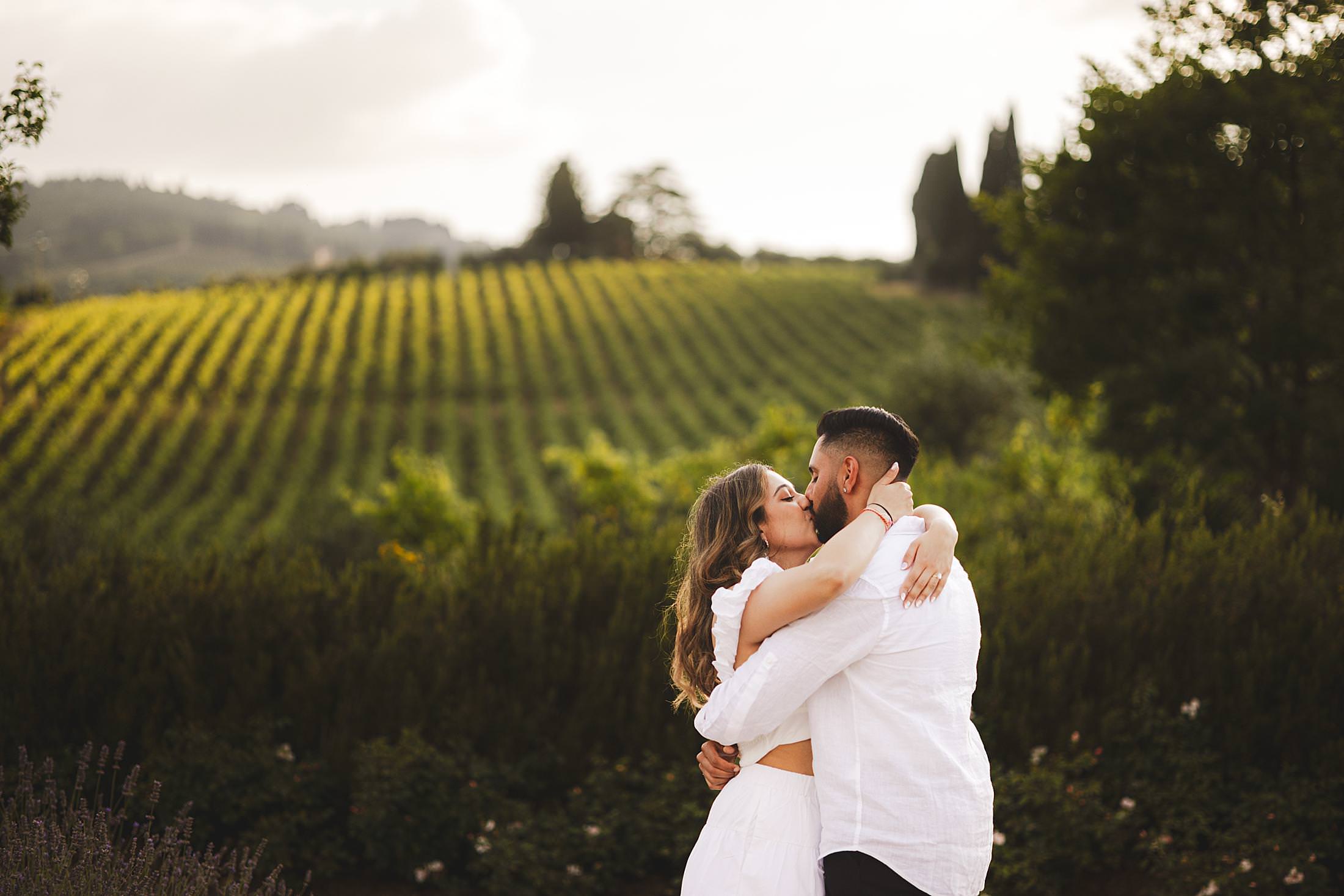 Romantic couple photo session in Chianti countryside during golden hour at Borgo del Cabreo. Photo by the Italian elegant creative and modern engagement photographer in Tuscany based Florence Gabriele Fani