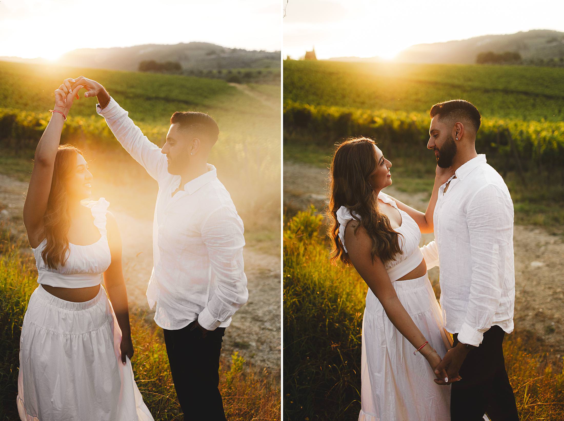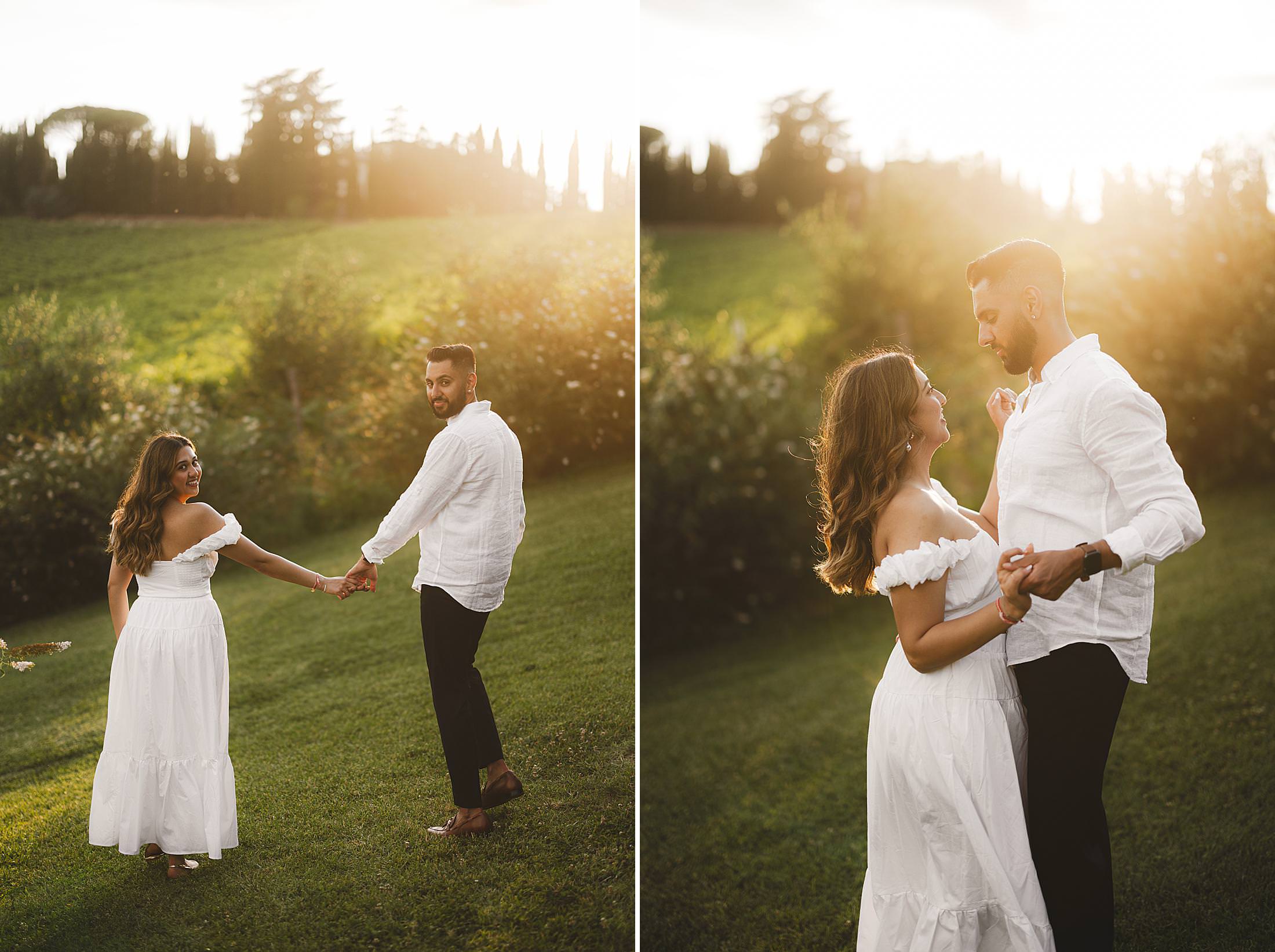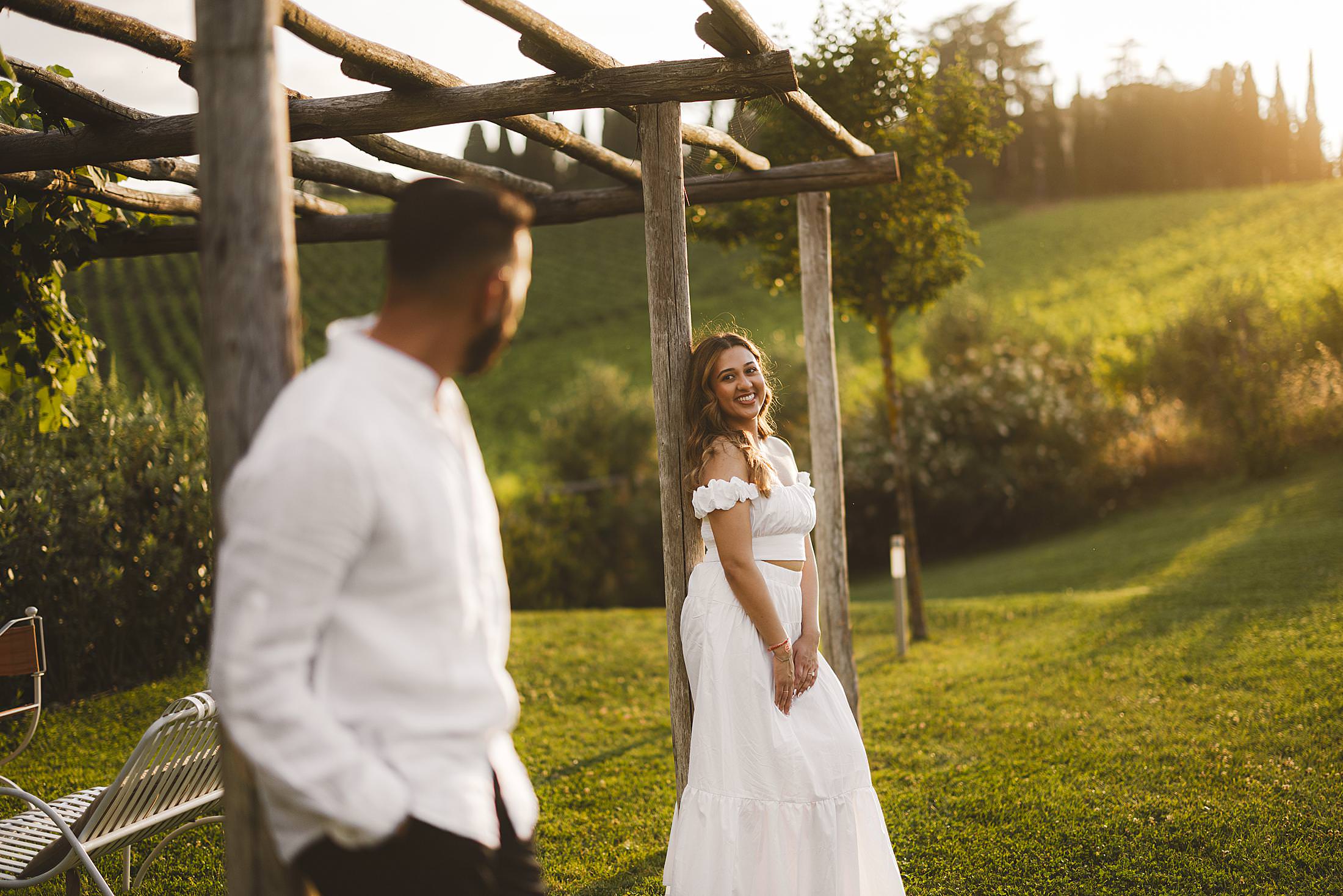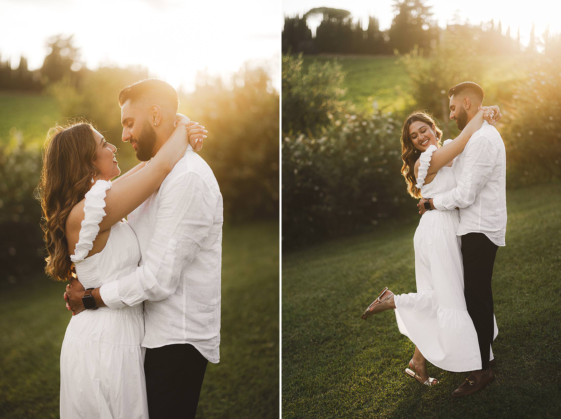 The photographic journey of Ridhie and Rahul continued beyond the secret wedding proposal, capturing the couple in a spontaneous dance of laughter and love. The positive vibrations of the day extended to the weather, which graced the session with the ideal blend of soft sunshine and a golden sunset. Each photograph emanates the warmth of the Tuscan light, perfectly mirroring the radiant happiness of the two fiancés.
