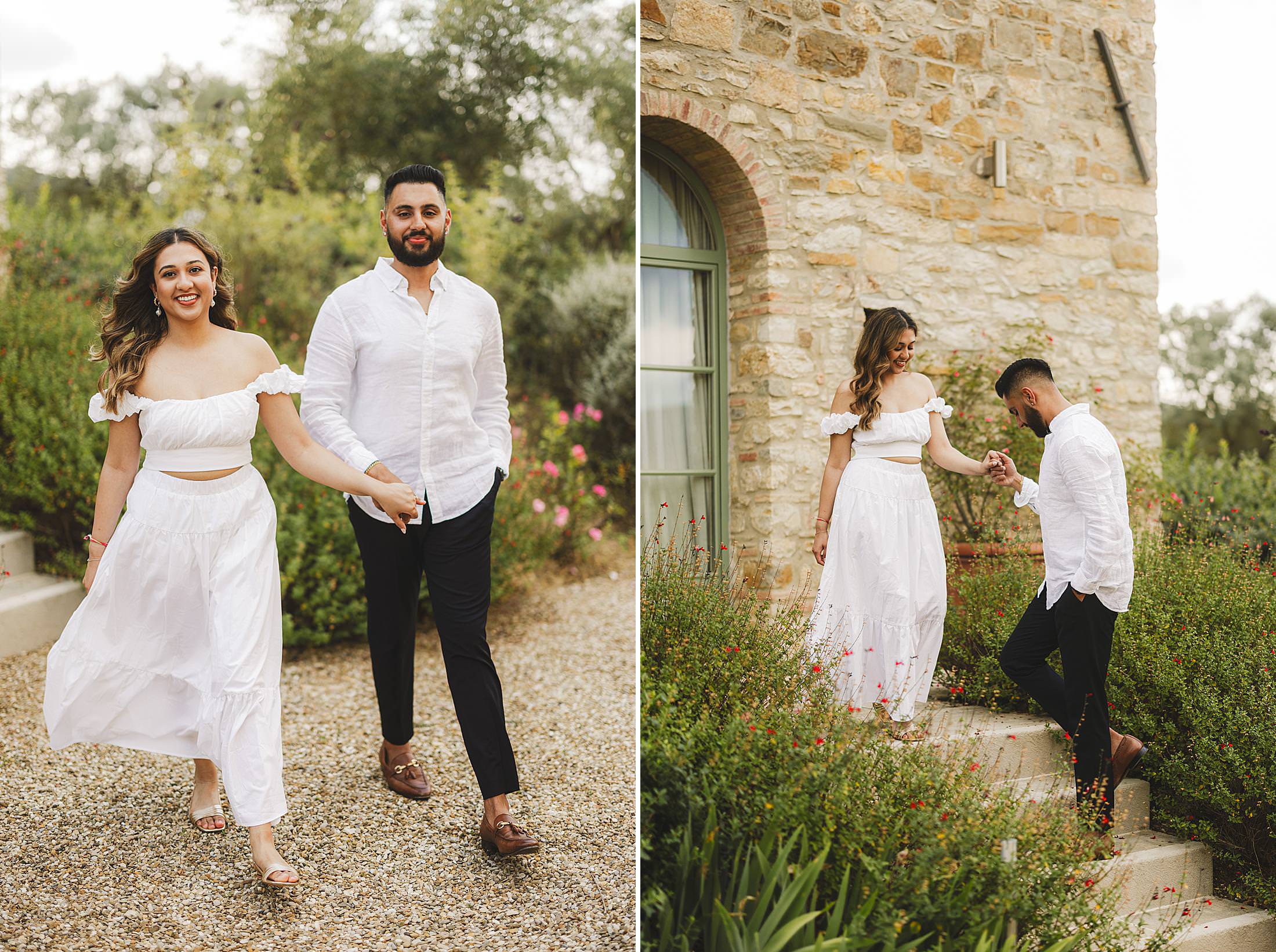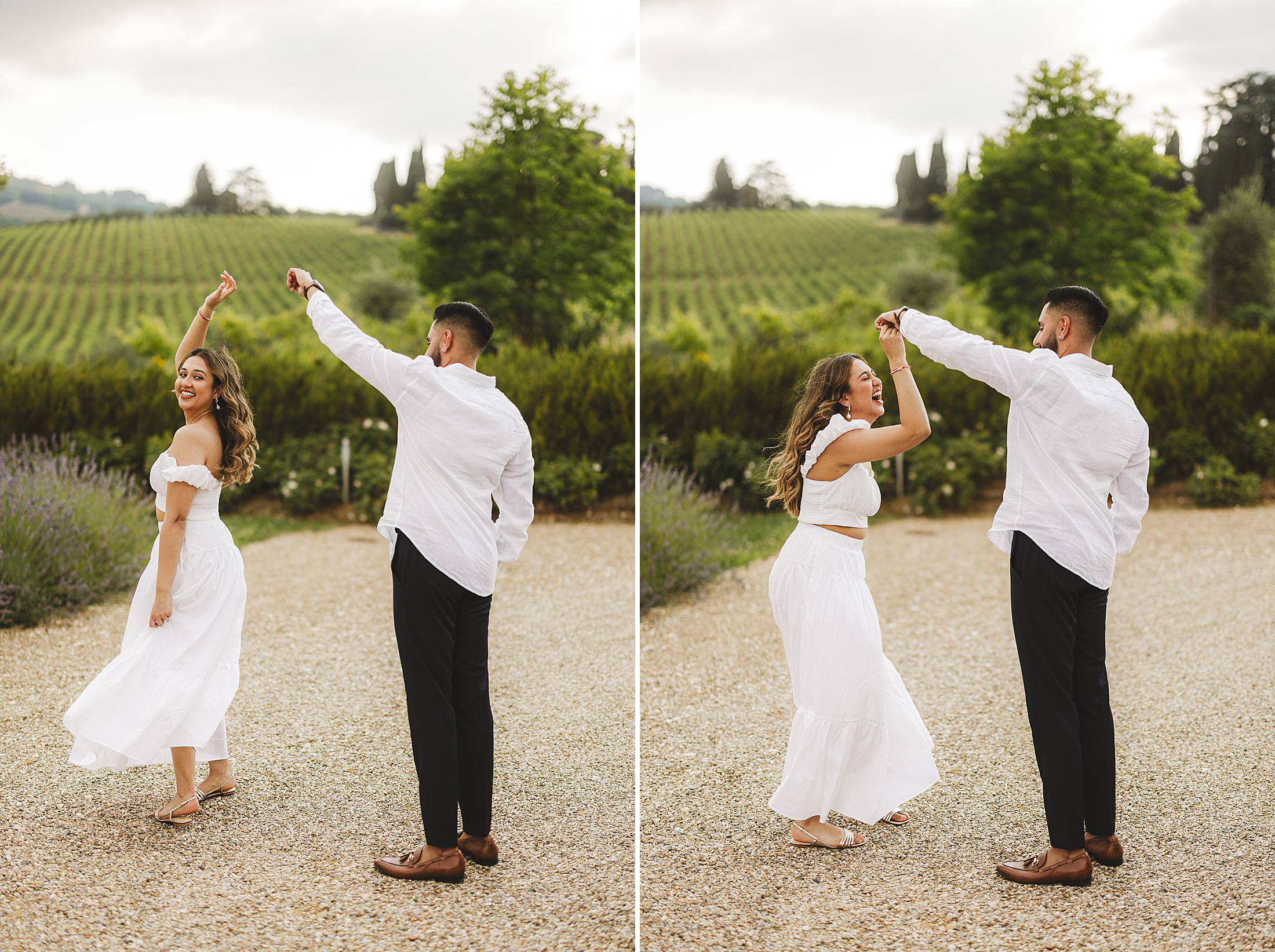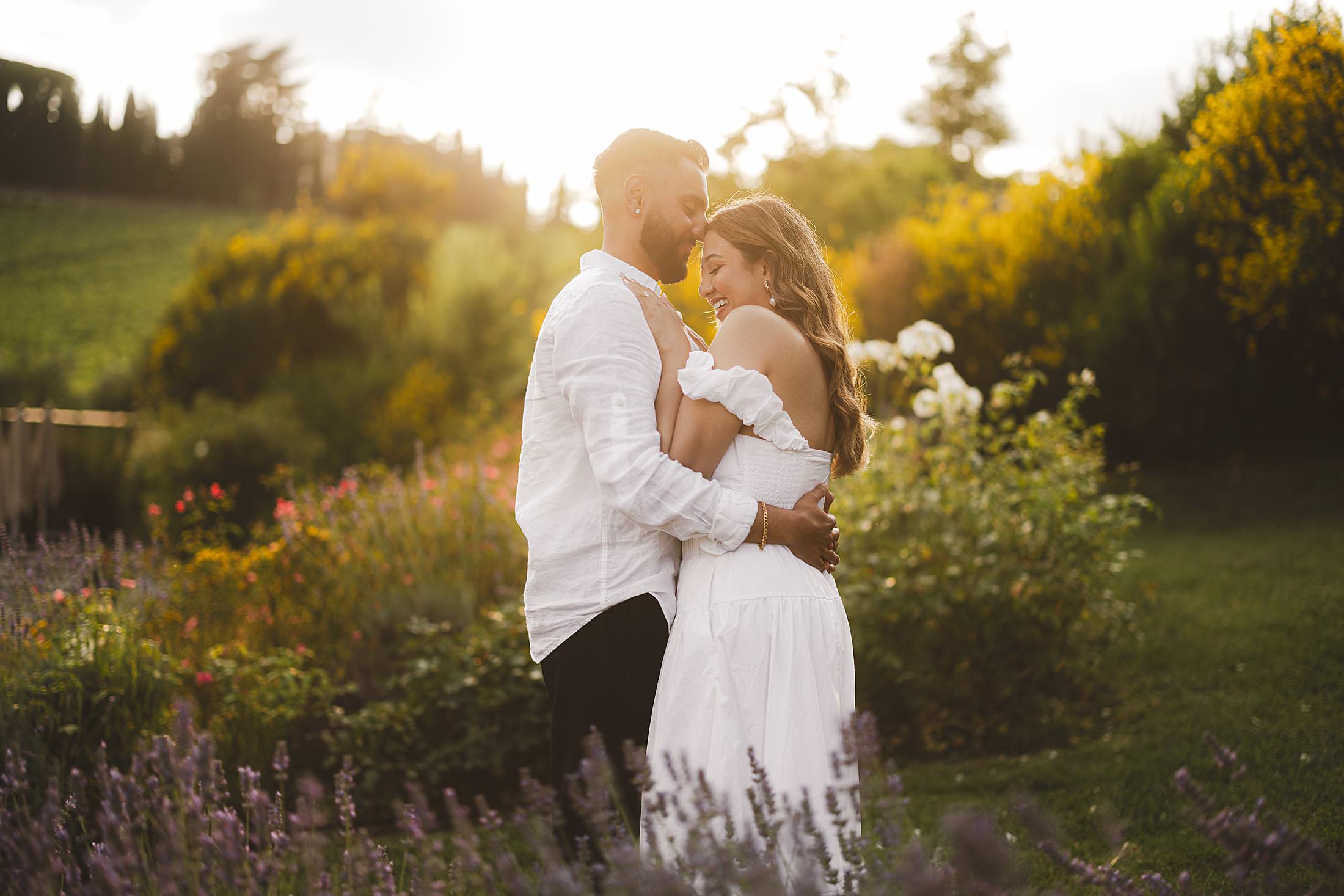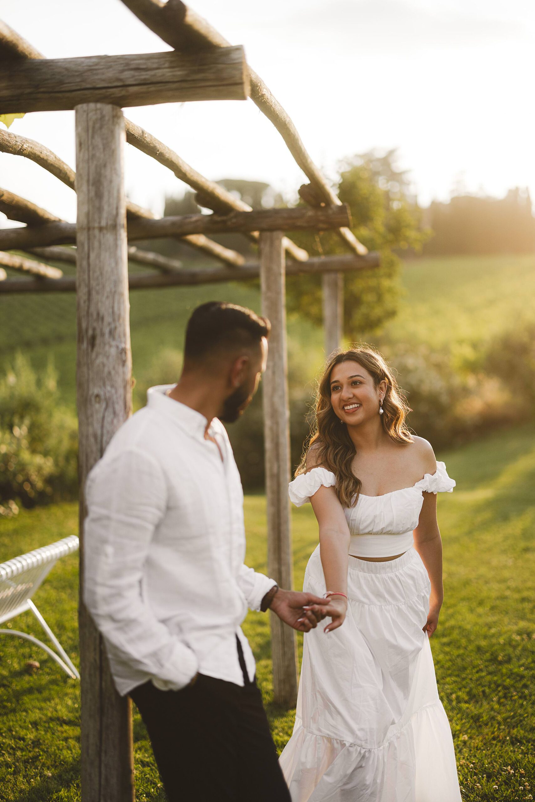 The photographic journey of Ridhie and Rahul continued beyond the secret wedding proposal, capturing the couple in a spontaneous dance of laughter and love. The positive vibrations of the day extended to the weather, which graced the session with the ideal blend of soft sunshine and a golden sunset. Each photograph emanates the warmth of the Tuscan light, perfectly mirroring the radiant happiness of the two fiancés.