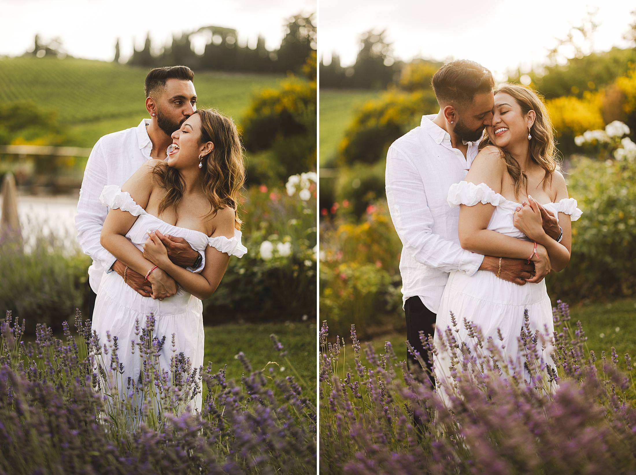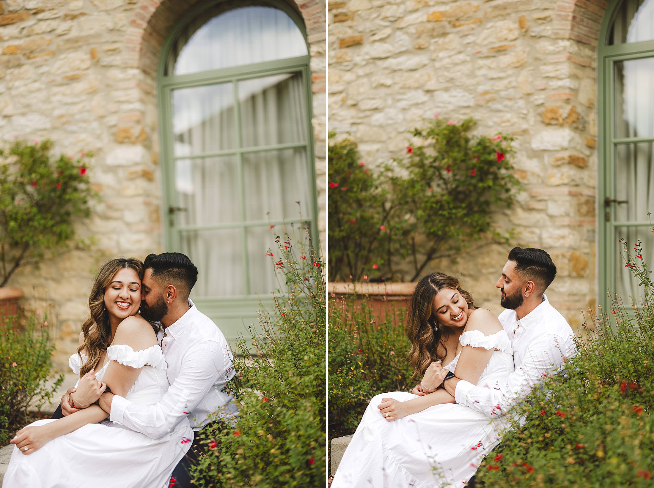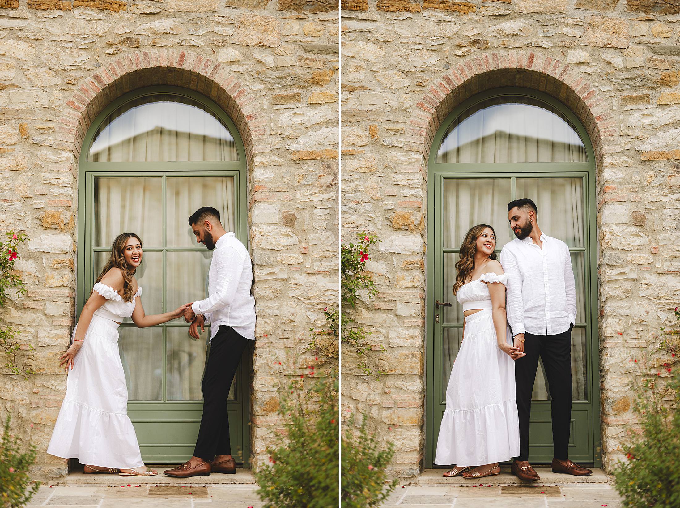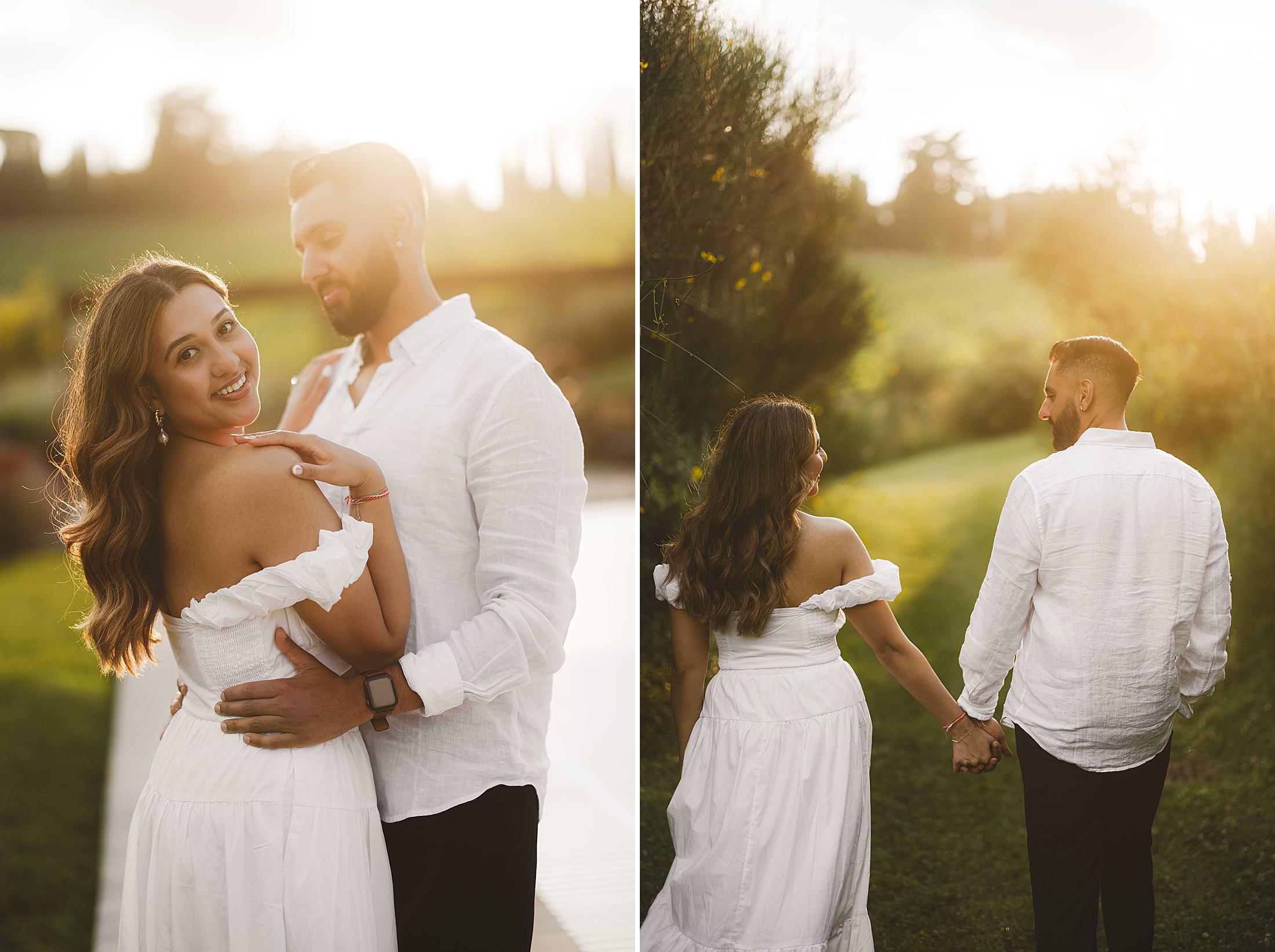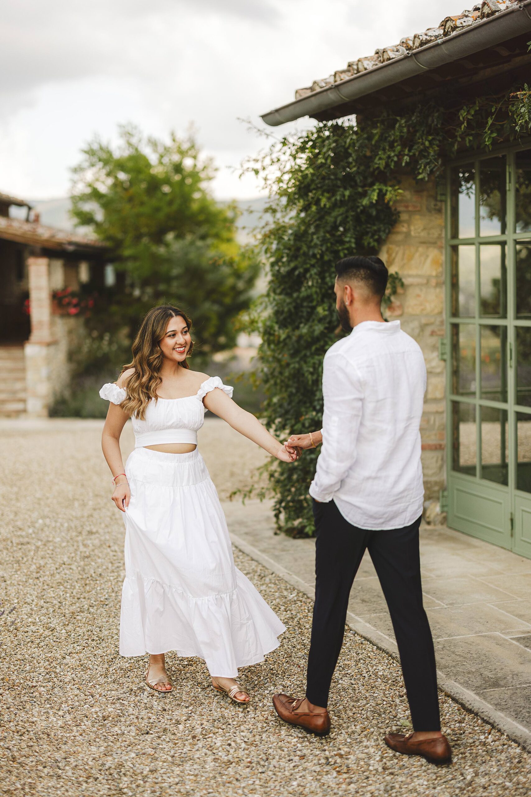 The photographic journey of Ridhie and Rahul continued beyond the secret wedding proposal, capturing the couple in a spontaneous dance of laughter and love. The positive vibrations of the day extended to the weather, which graced the session with the ideal blend of soft sunshine and a golden sunset. Each photograph emanates the warmth of the Tuscan light, perfectly mirroring the radiant happiness of the two fiancés.