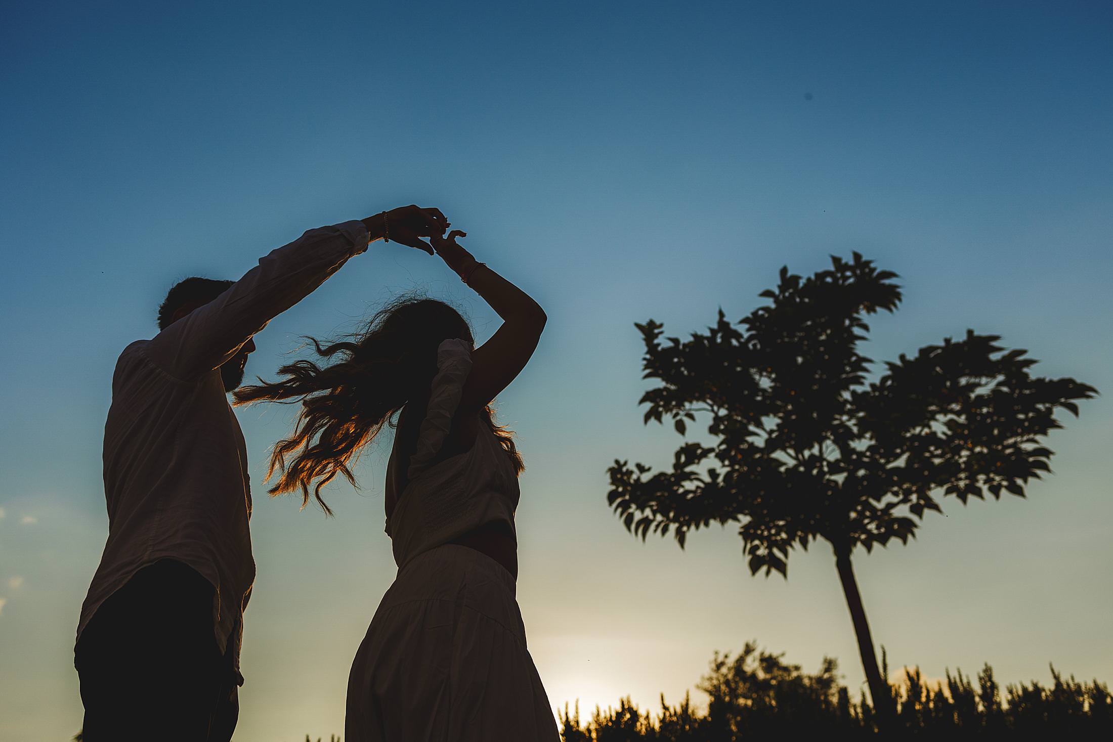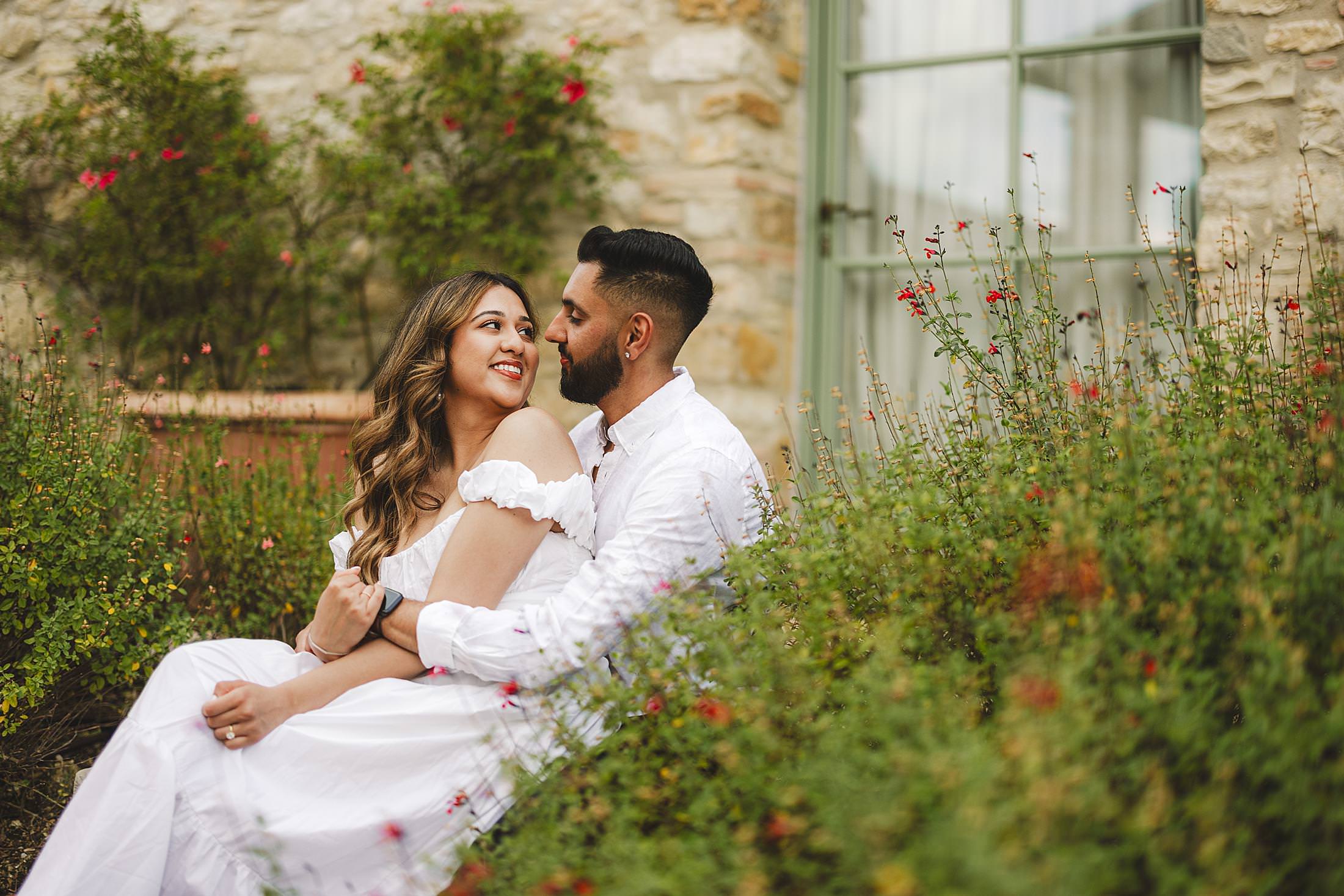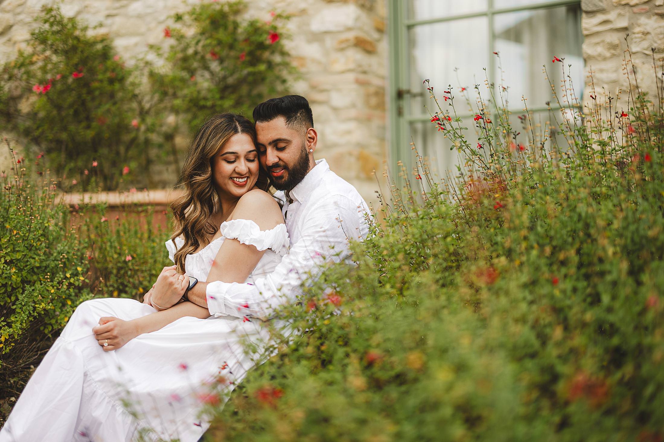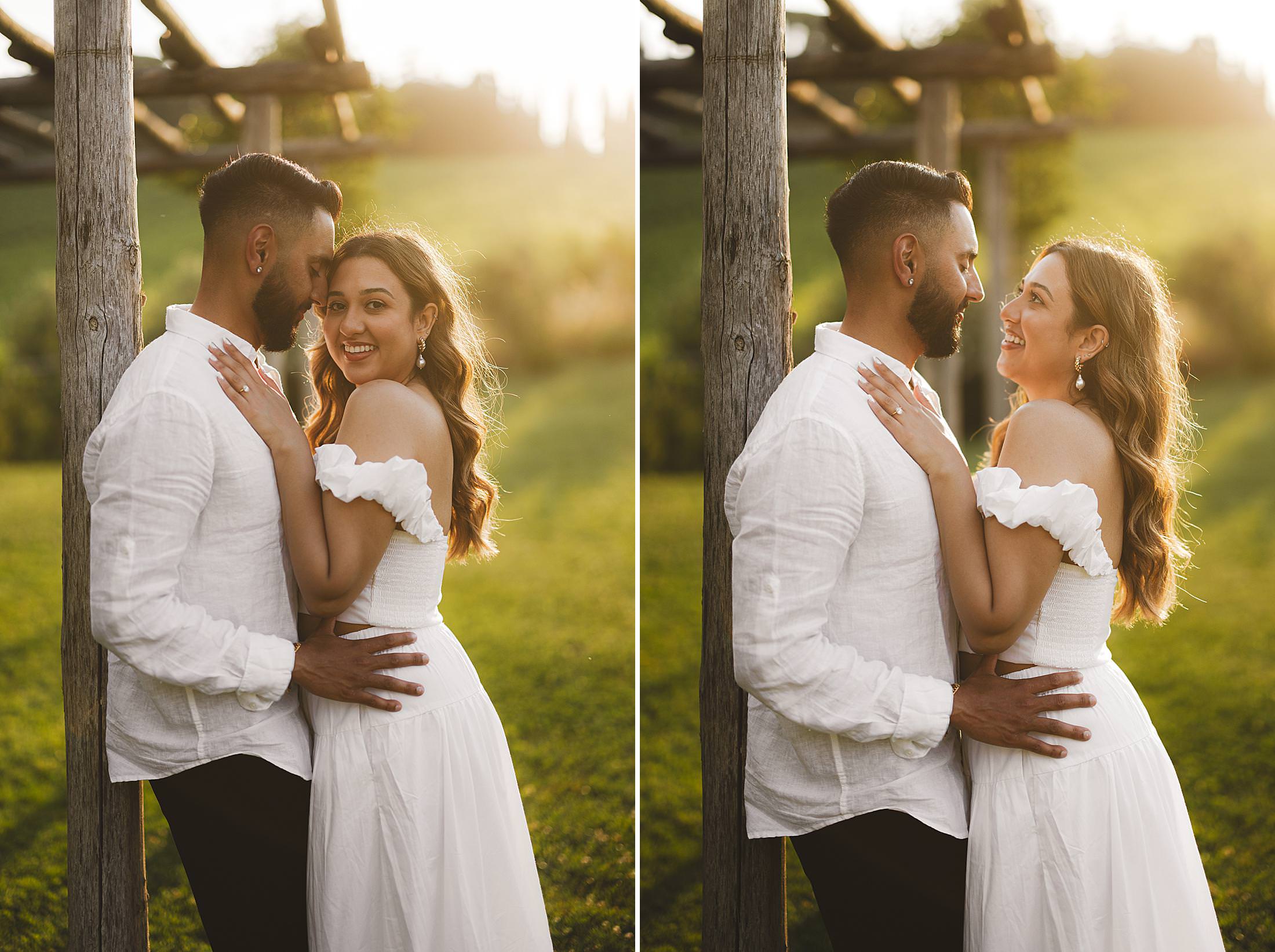 The photographic journey of Ridhie and Rahul continued beyond the secret wedding proposal, capturing the couple in a spontaneous dance of laughter and love. The positive vibrations of the day extended to the weather, which graced the session with the ideal blend of soft sunshine and a golden sunset. Each photograph emanates the warmth of the Tuscan light, perfectly mirroring the radiant happiness of the two fiancés.