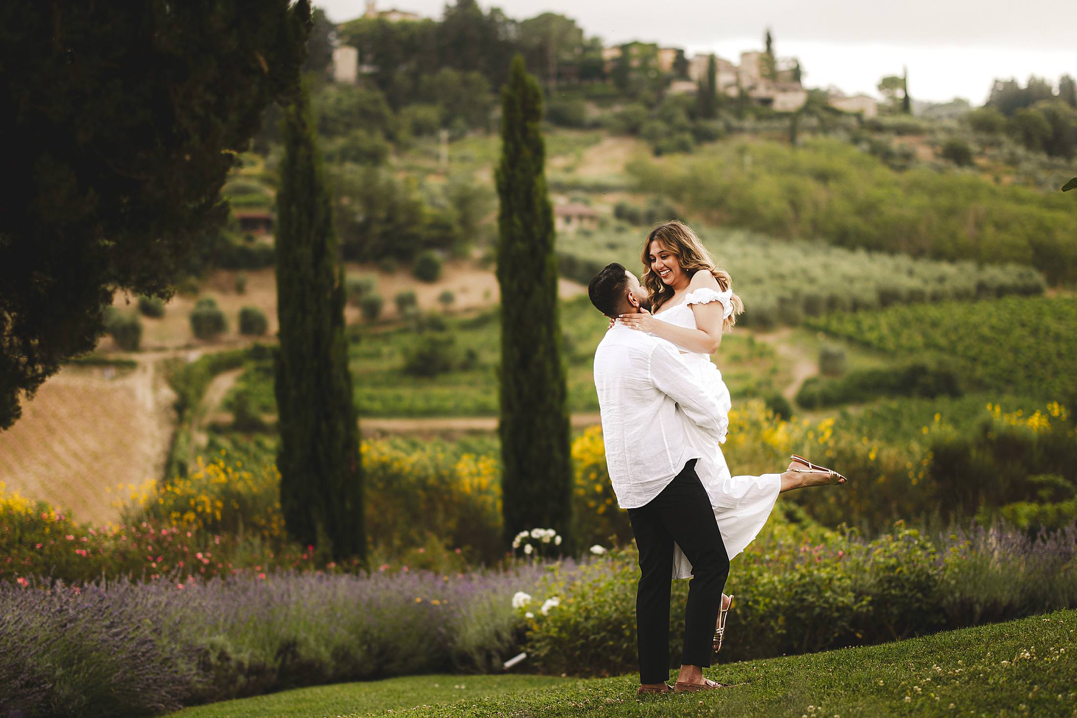 Exciting and fun engagement photo session in the heart of Chianti countryside at Borgo del Cabreo. Photo by the Italian elegant creative and modern engagement photographer in Tuscany based Florence Gabriele Fani