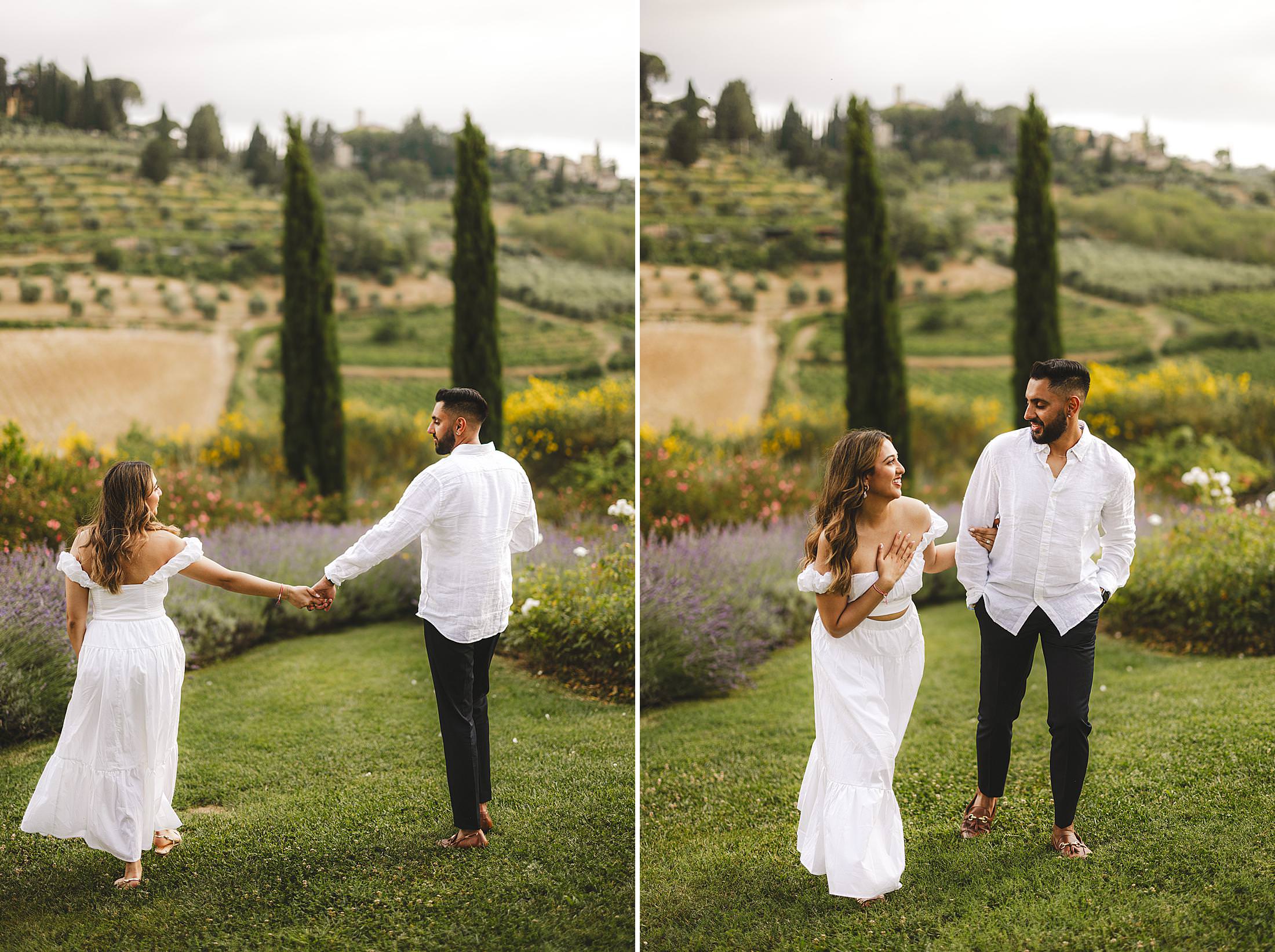 Creative and fun engagement photo shoot at Borgo del Cabreo in the Chianti shire. Photo by the Italian elegant creative and modern engagement photographer in Tuscany based Florence Gabriele Fani