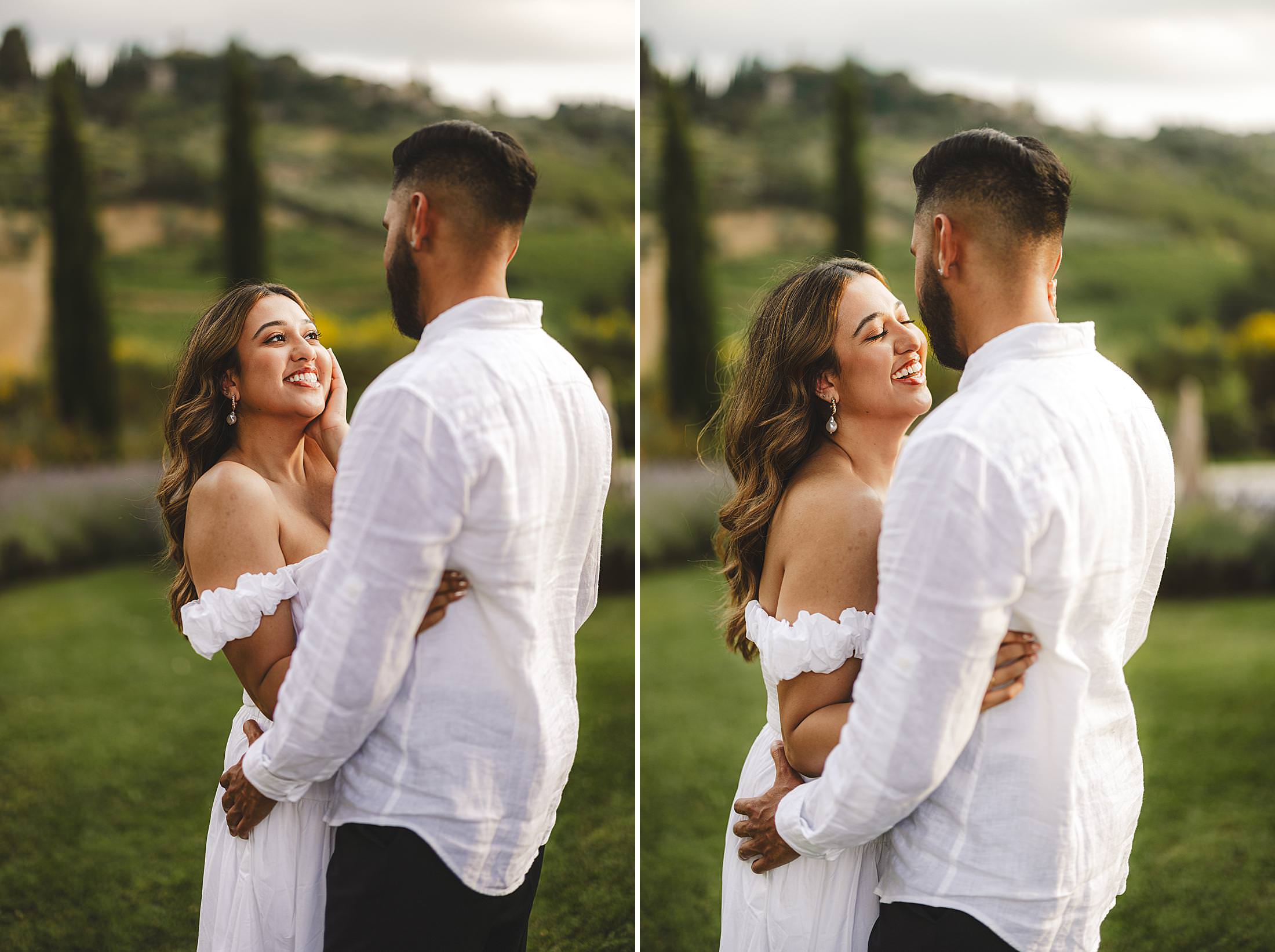 Memorable joyful and spontaneous couple engagement photo shoot in the heart of Tuscany at Borgo del Cabreo. Photo by the Italian elegant creative and modern engagement photographer in Tuscany based Florence Gabriele Fani