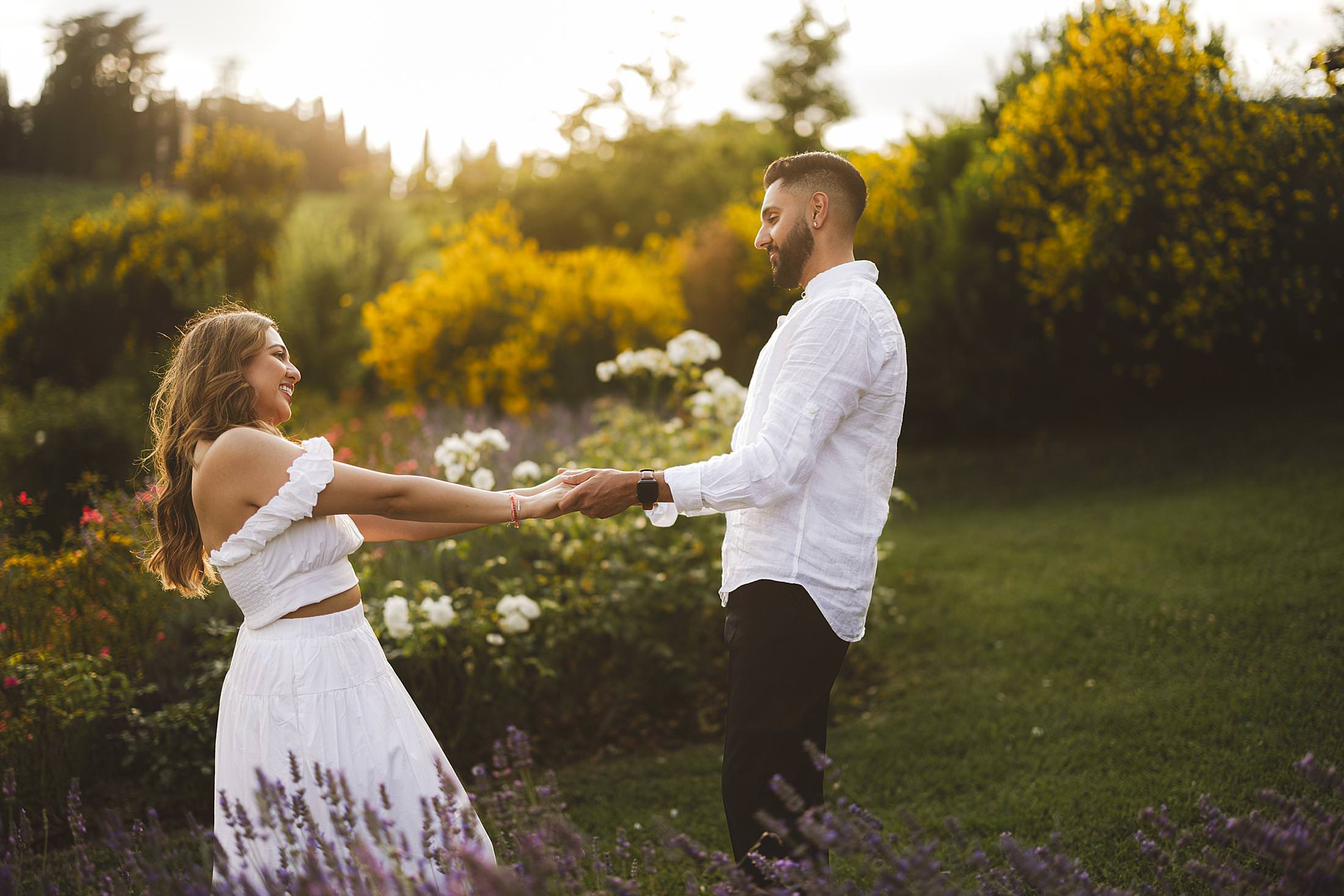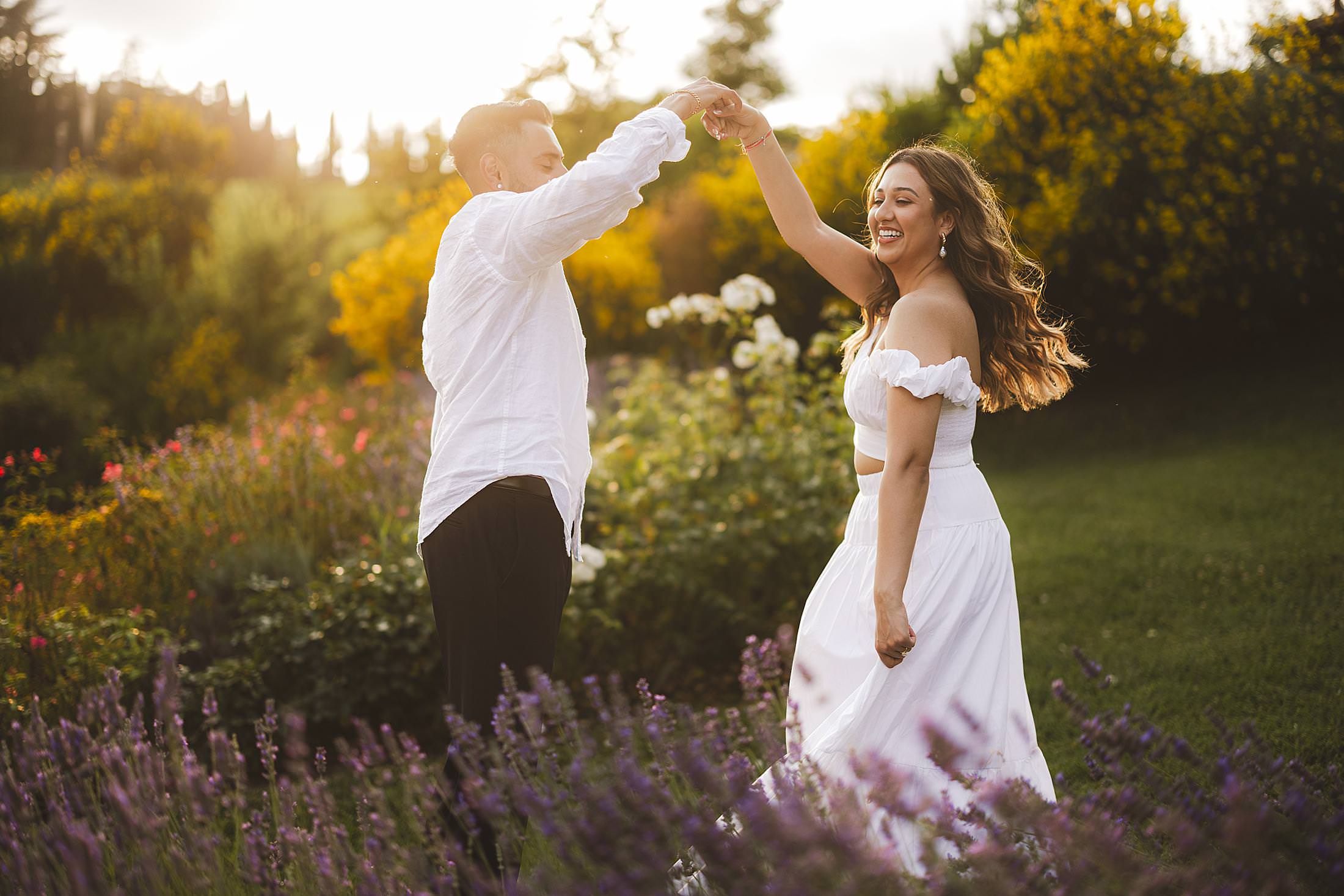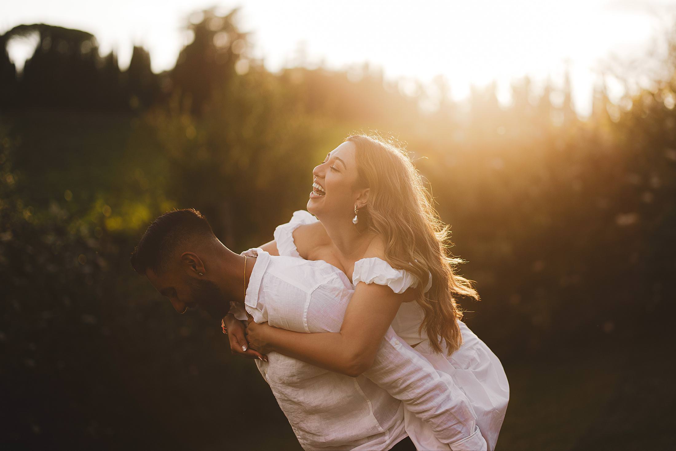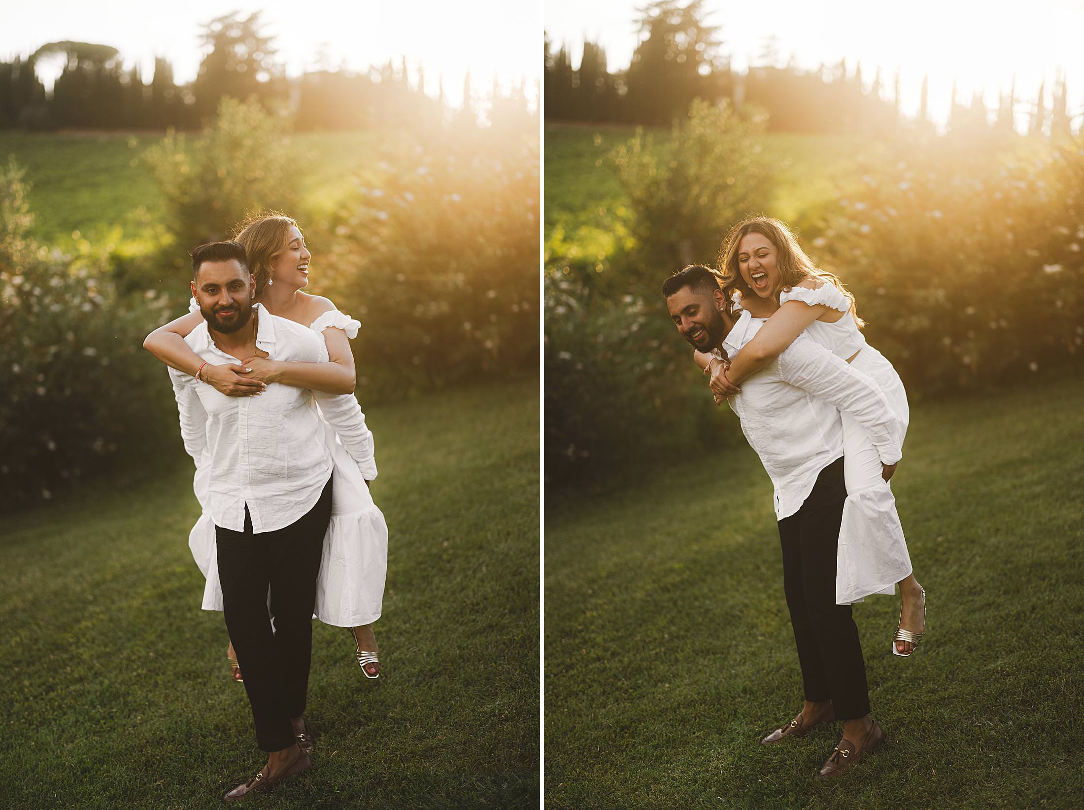 Exciting fun couple shoot with golden hour in the Chianti countryside at Borgo del Cabreo. Photo by the Italian elegant creative and modern engagement photographer in Tuscany based Florence Gabriele Fani
