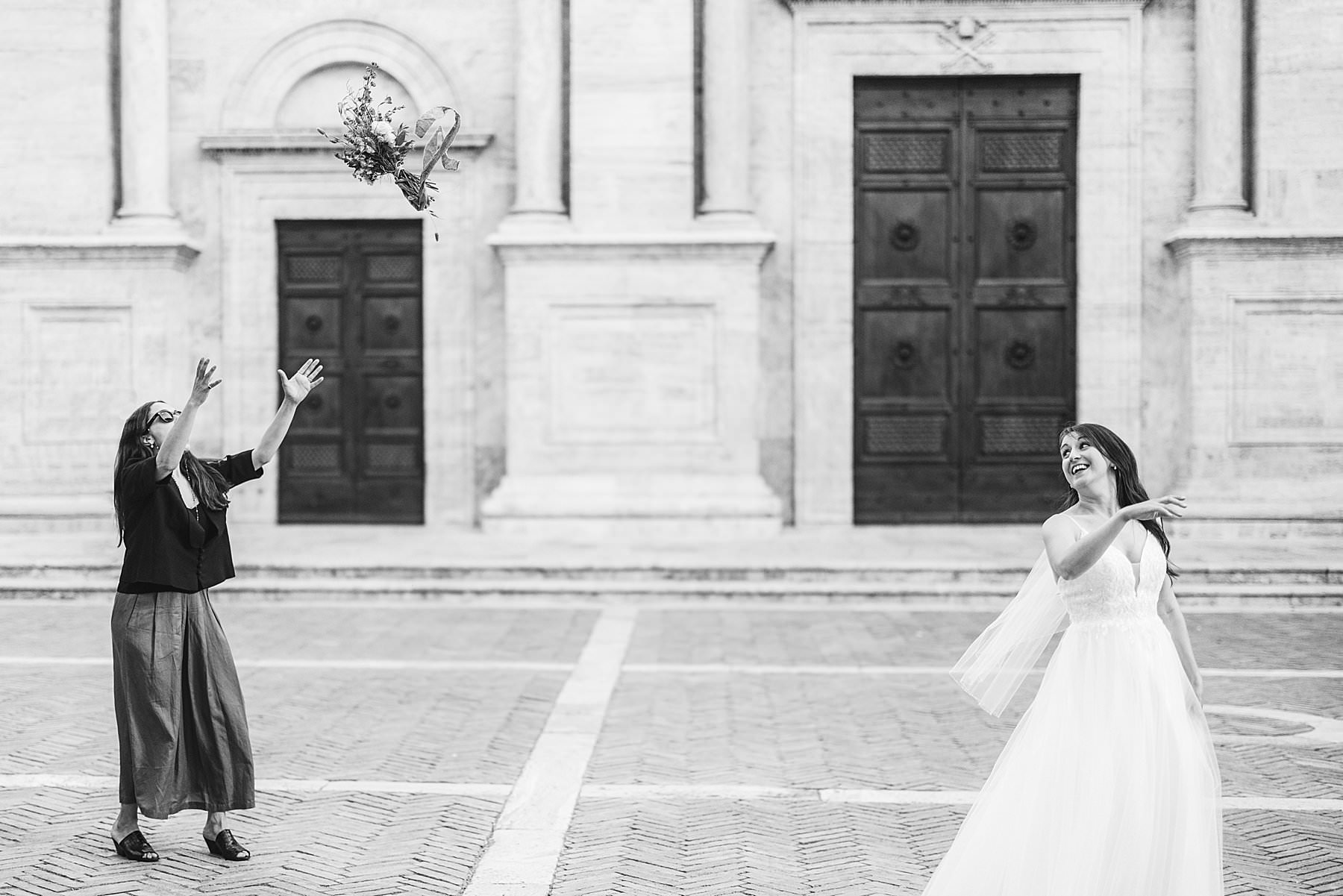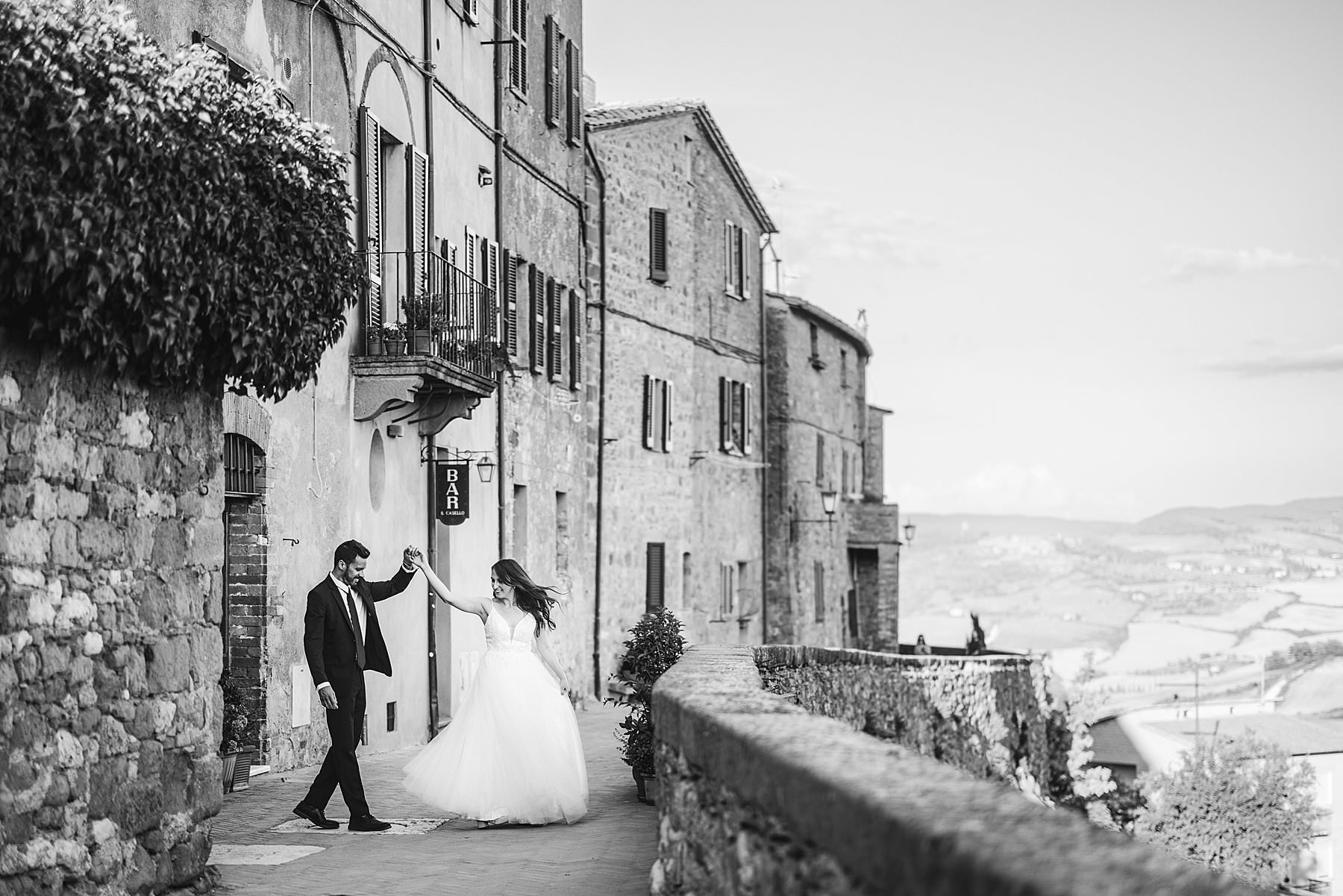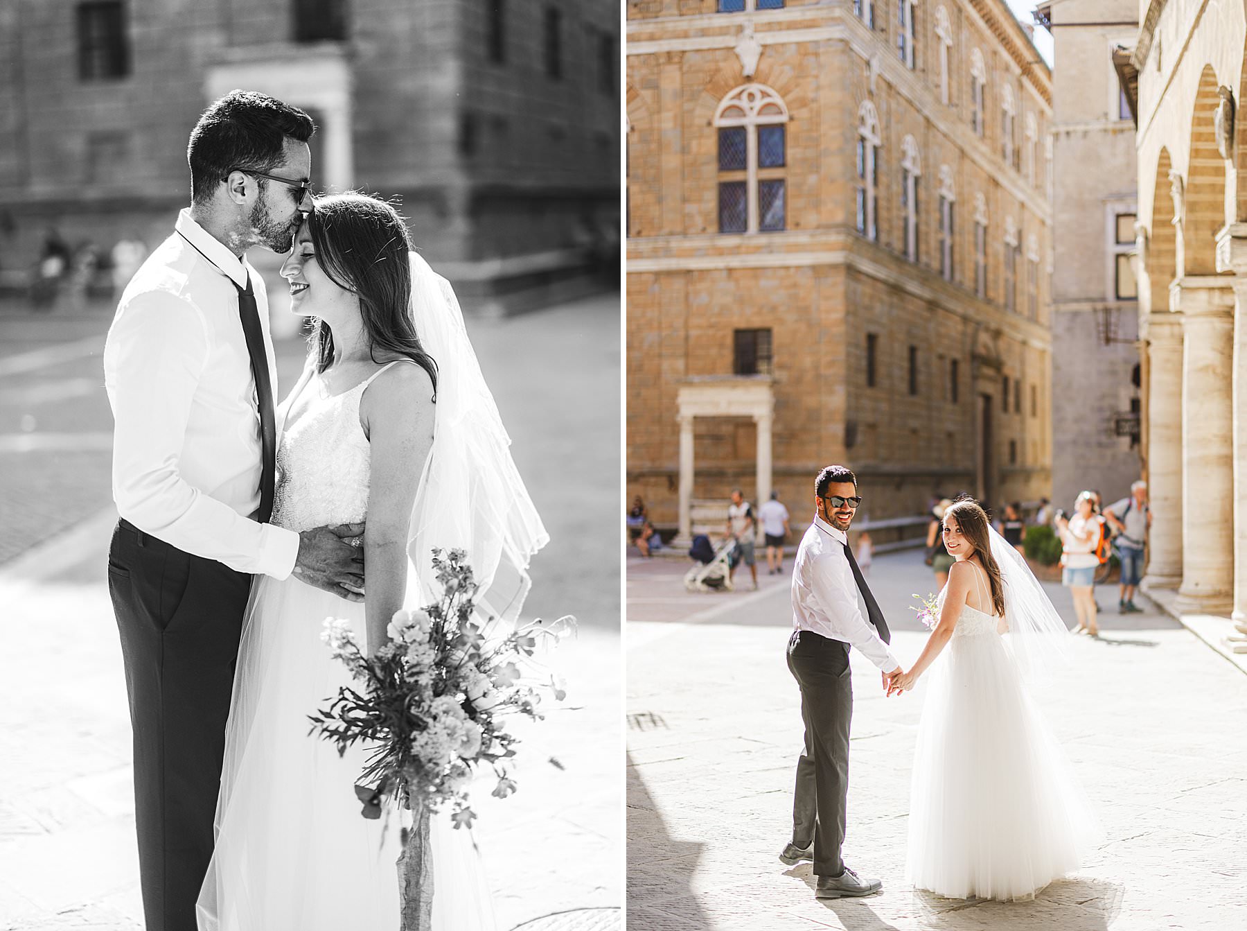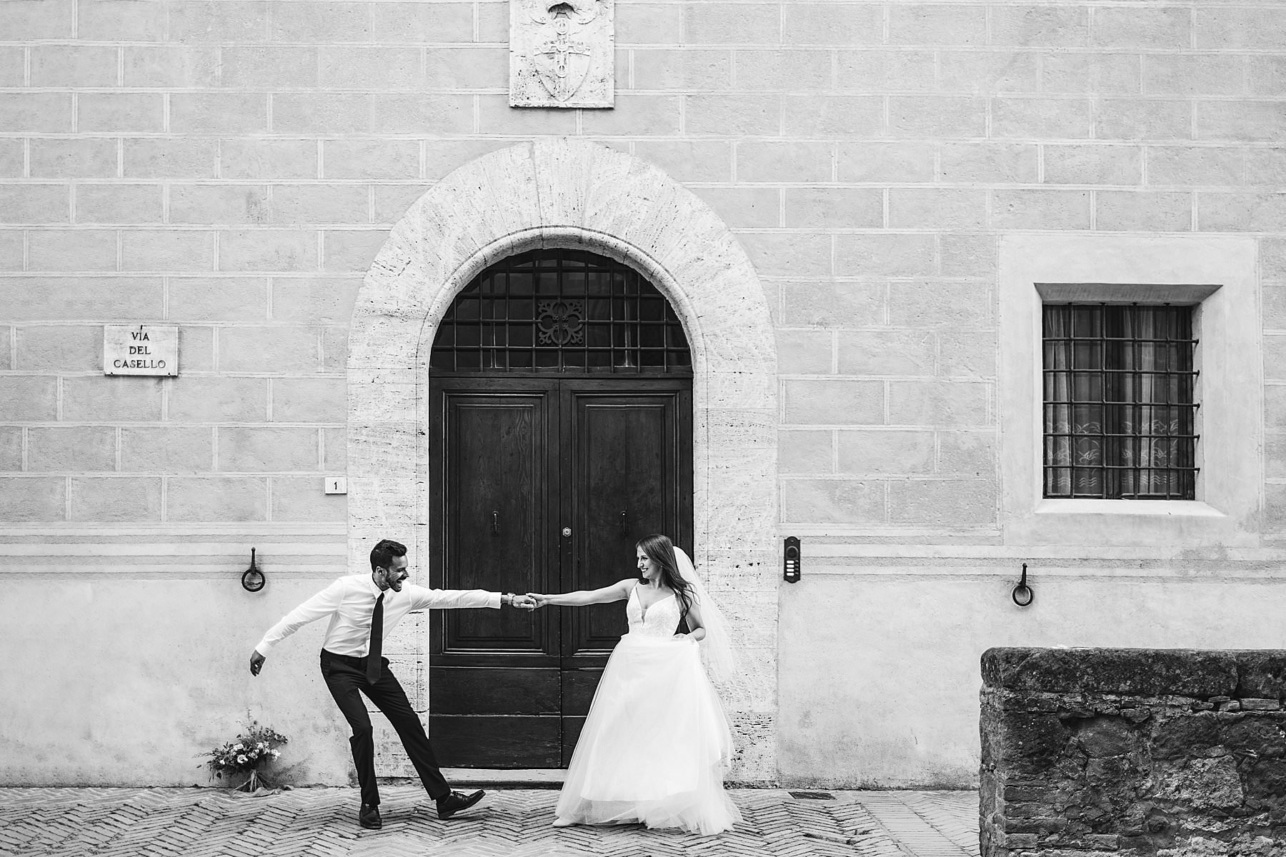 Exciting wedding photo in Pienza the heart of Val d’Orcia for intimate destination elopement. Photo by the Italian elegant wedding photographer in Tuscany based Florence Gabriele Fani