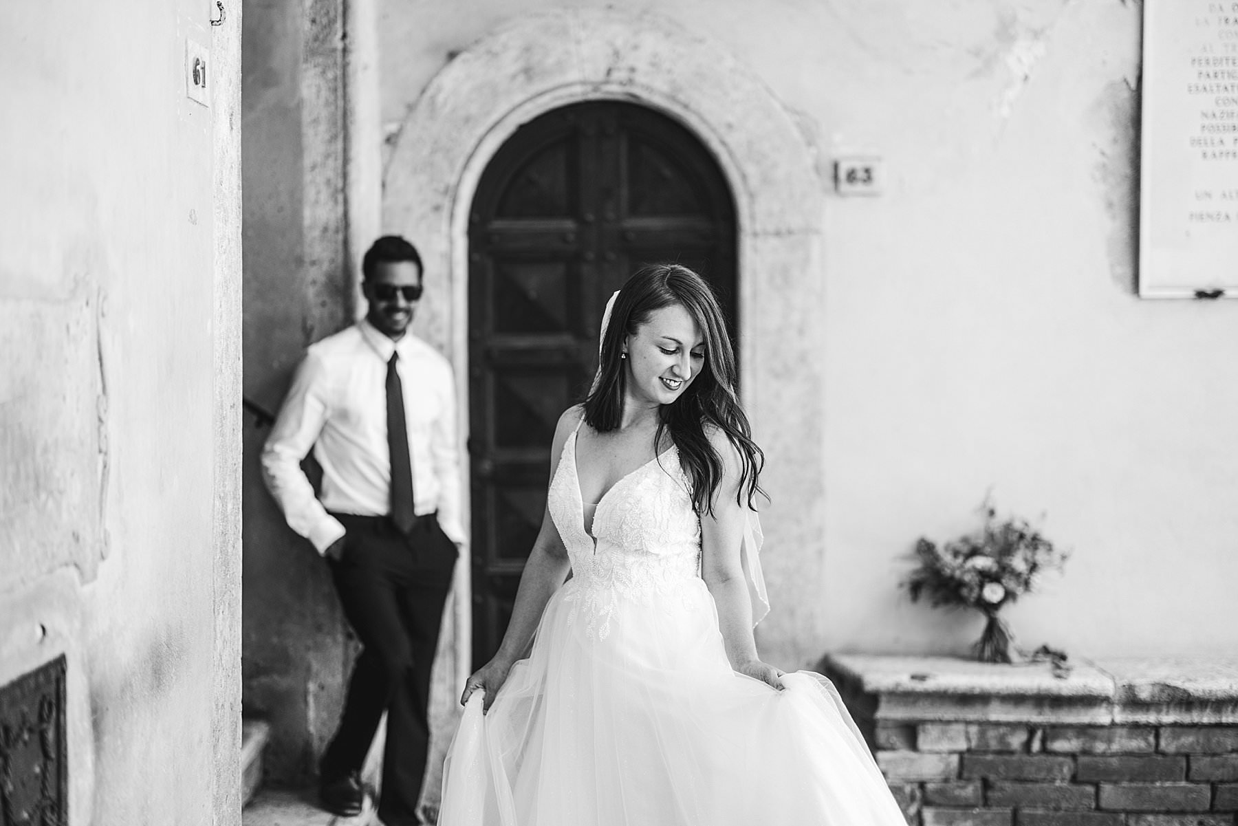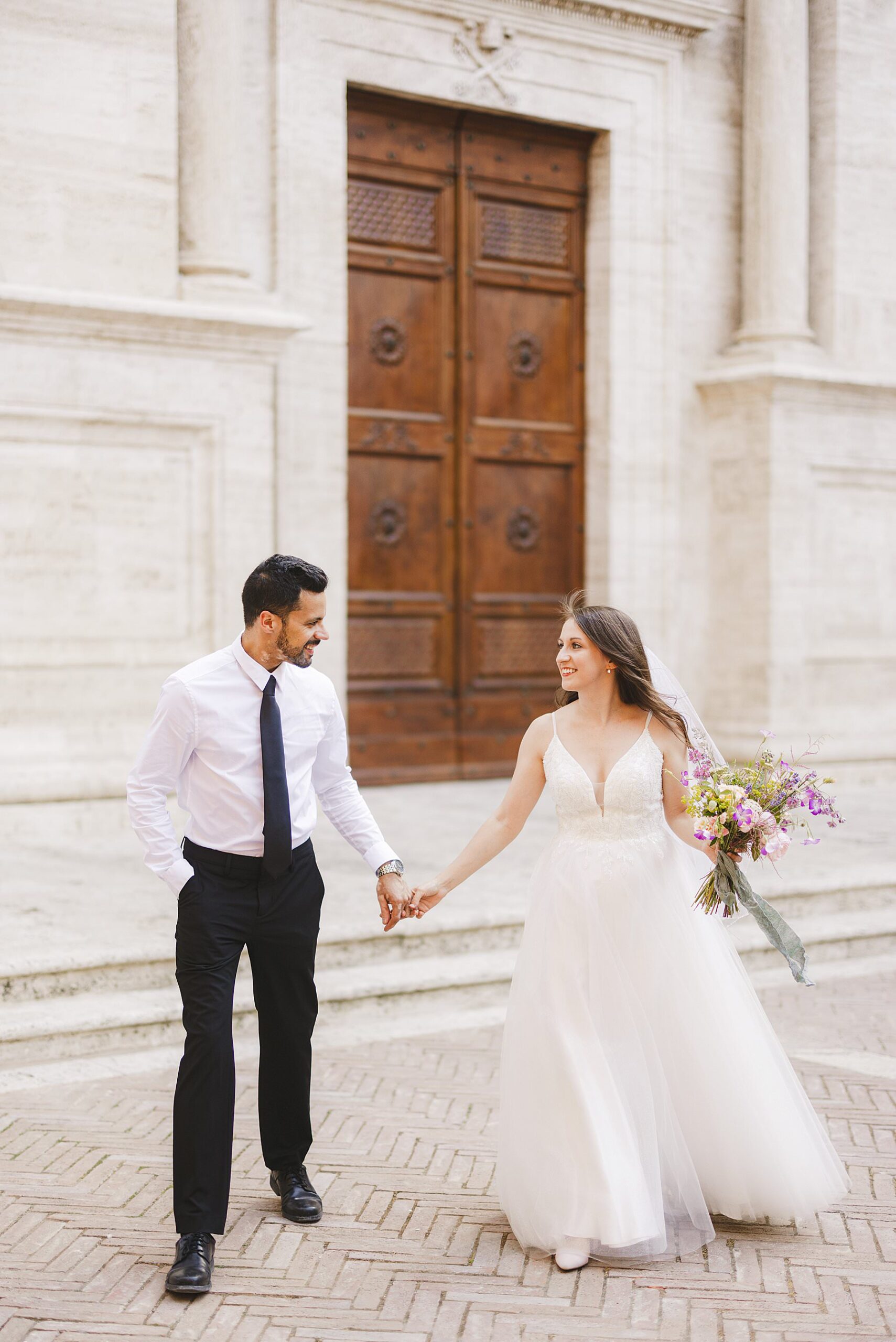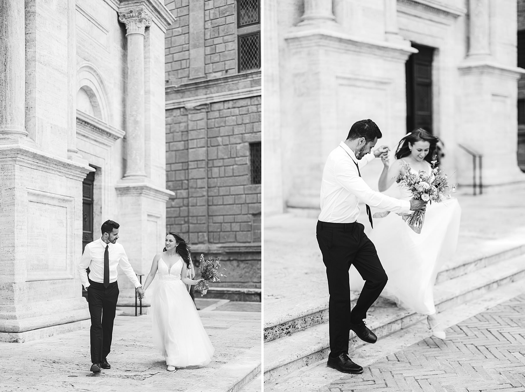 Exciting bride and groom elopement wedding photo in Pienza, Tuscany. Photo by the Italian elegant wedding photographer in Tuscany based Florence Gabriele Fani