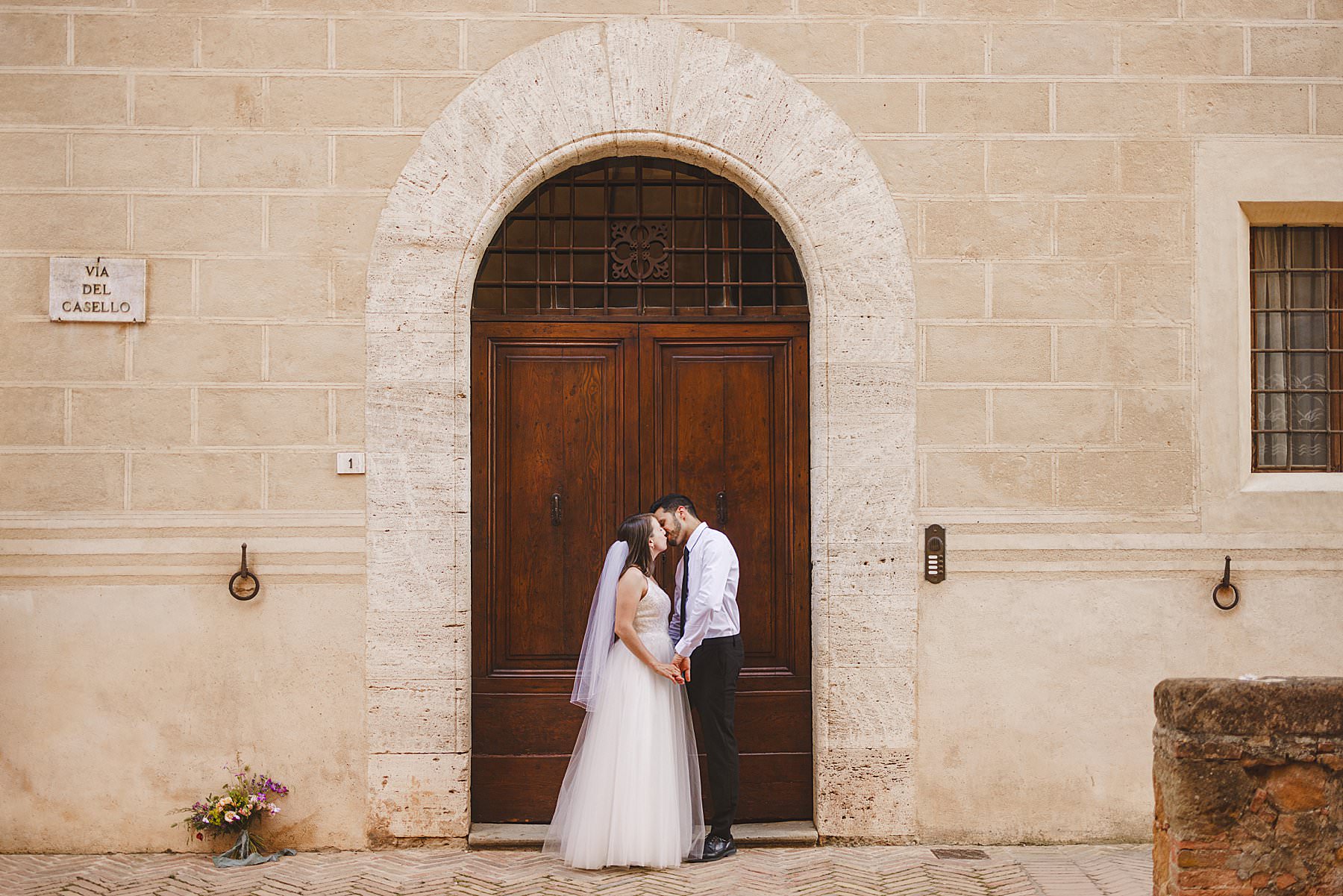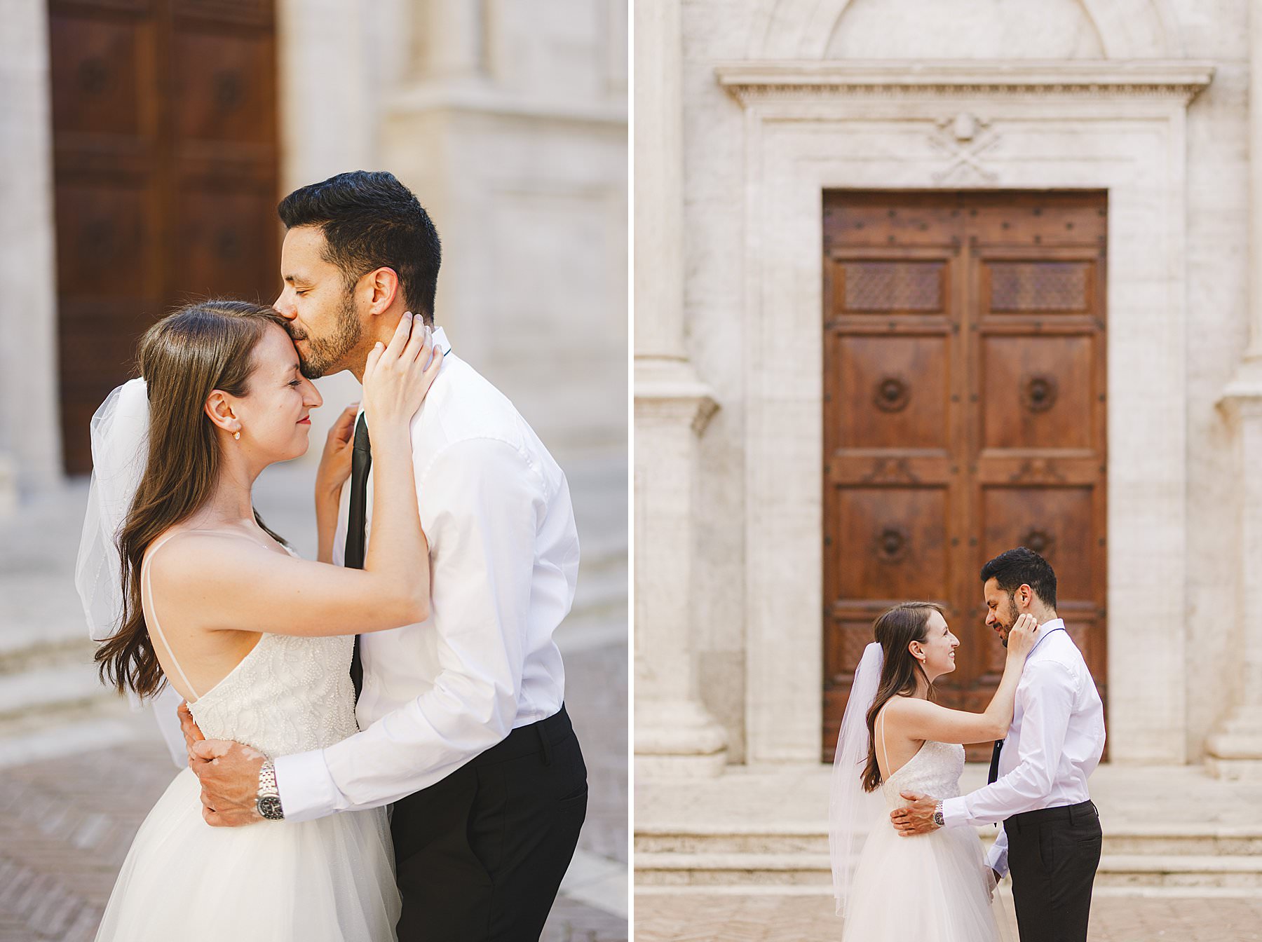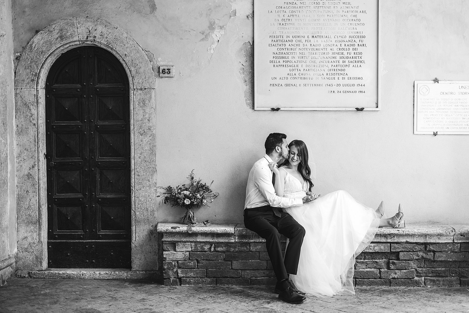 Romantic bride and groom elopement photo in Pienza the heart of Val d’Orcia, Tuscany. Photo by the Italian elegant wedding photographer in Tuscany based Florence Gabriele Fani