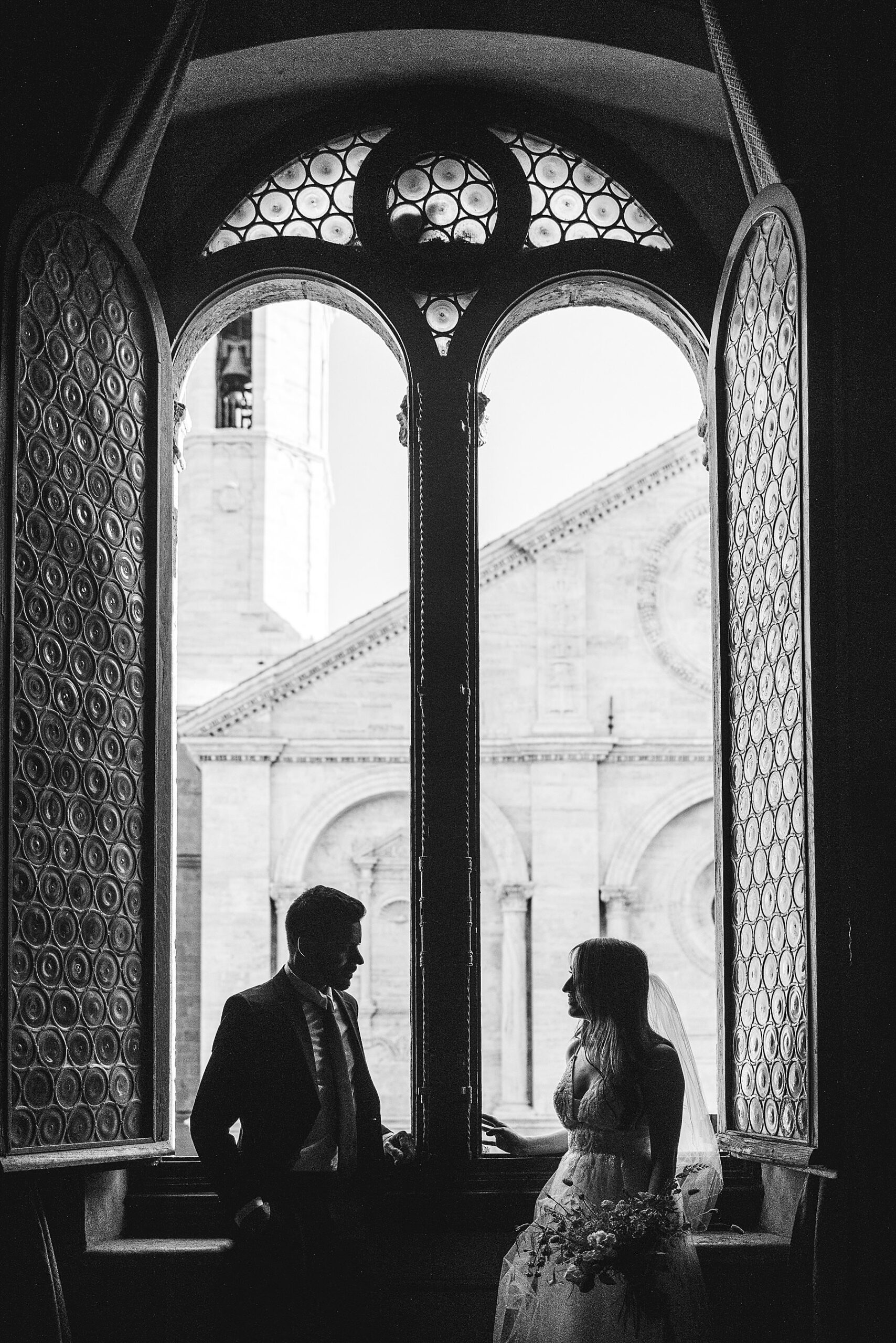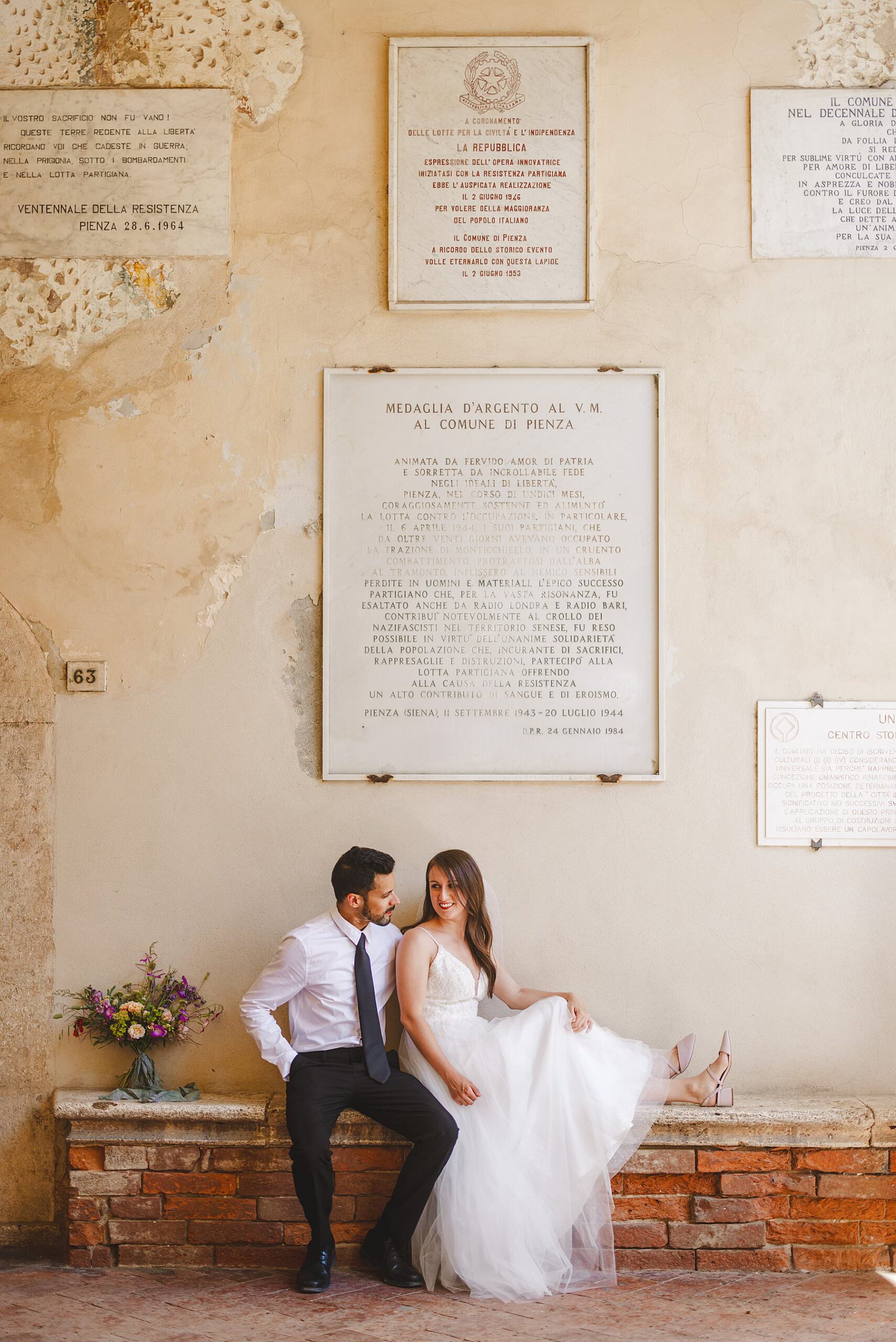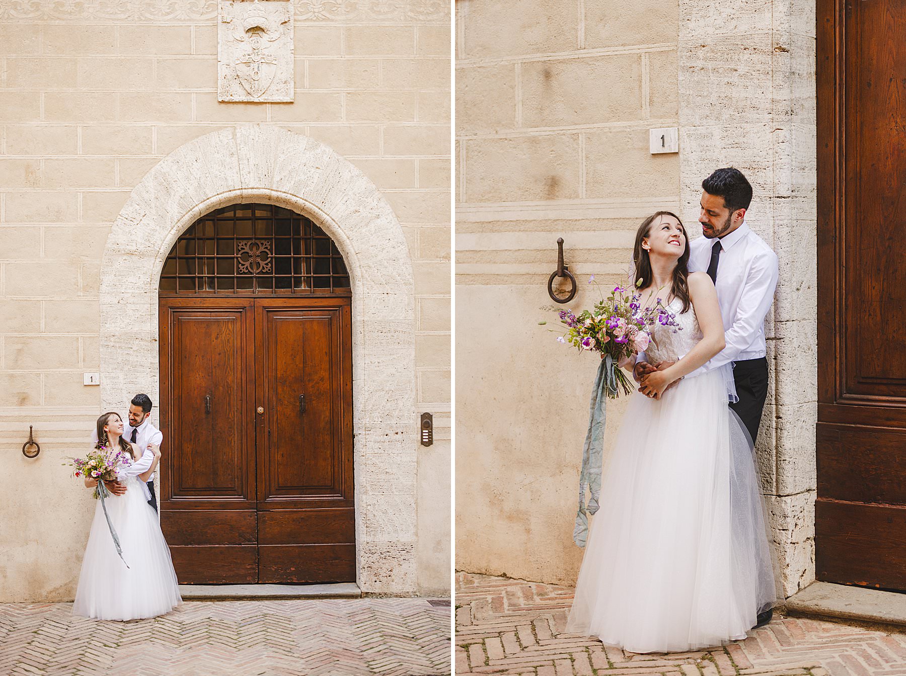 Romantic bride and groom elopement wedding photo Pienza Town Hall. Photo by the Italian elegant wedding photographer in Tuscany based Florence Gabriele Fani