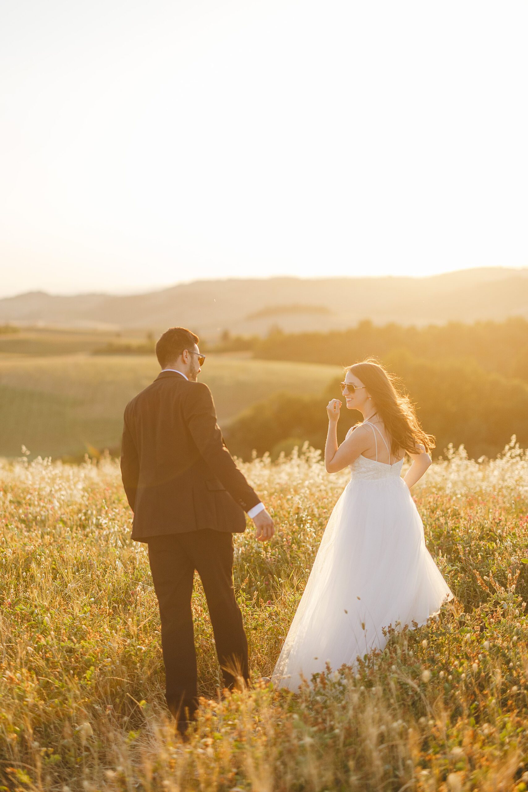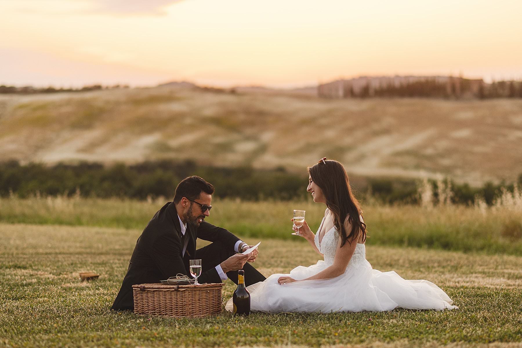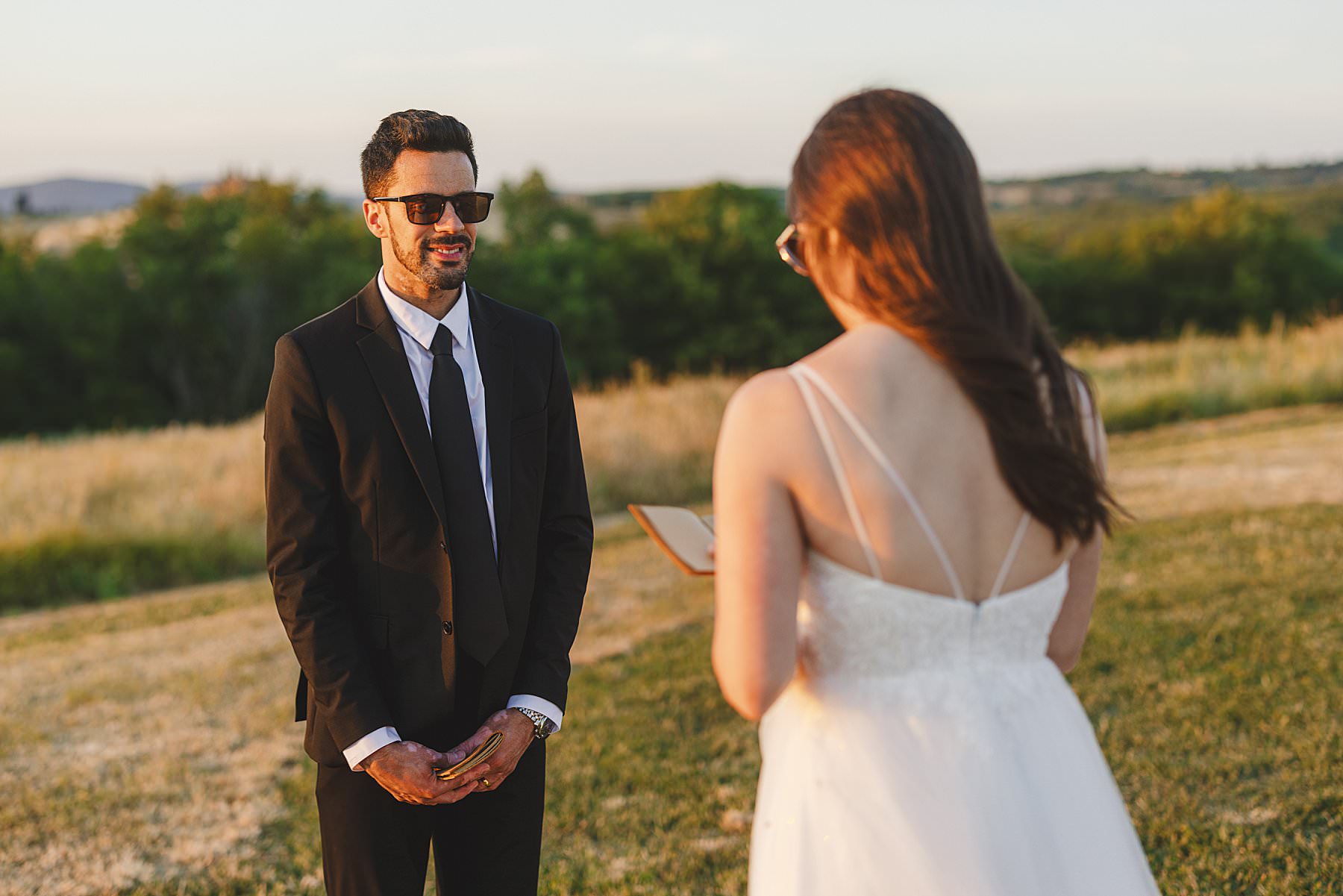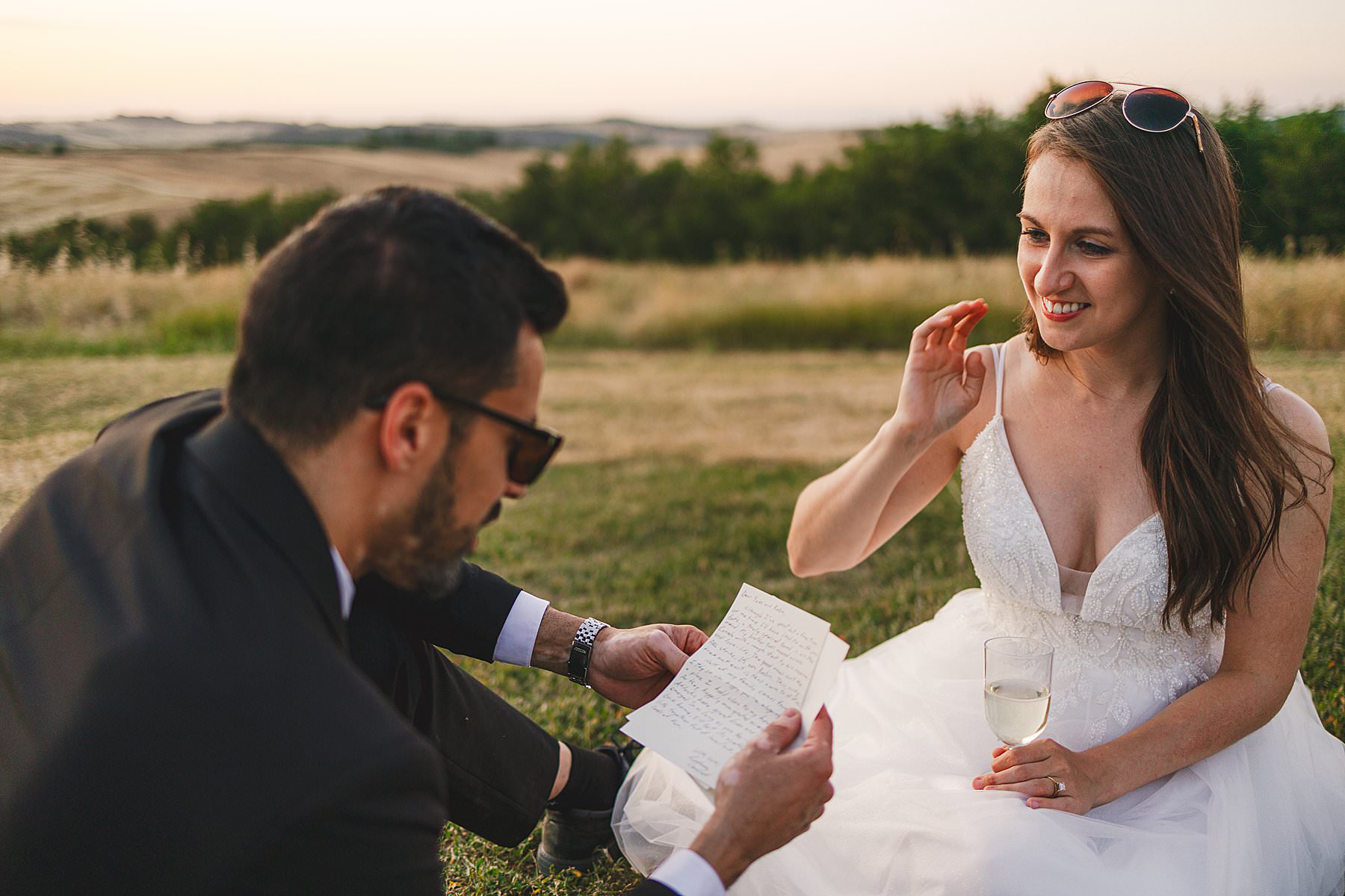 Here, in fact, the bride and groom exchanged their vows again, then opened a bottle of wine, sat on the grass and read the letters and messages of congratulations that their friends and families wrote for the occasion. The golden hour light and the sun setting behind the hills were the icing on this romantic elopement cake: Robin and Yves will surely remember this day forever.