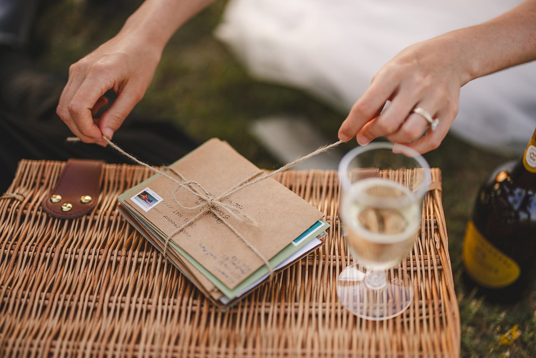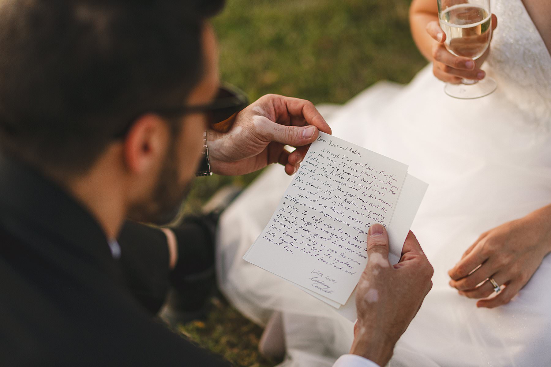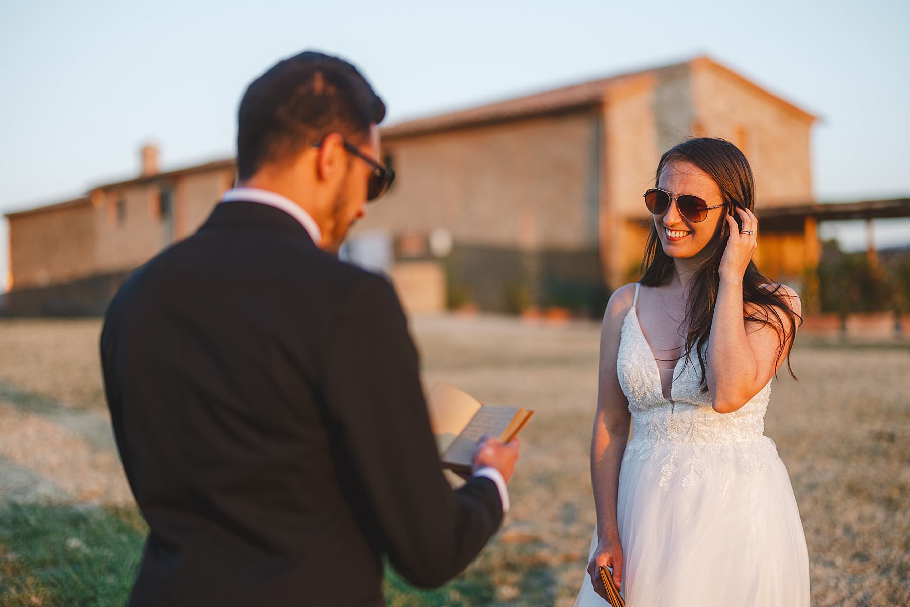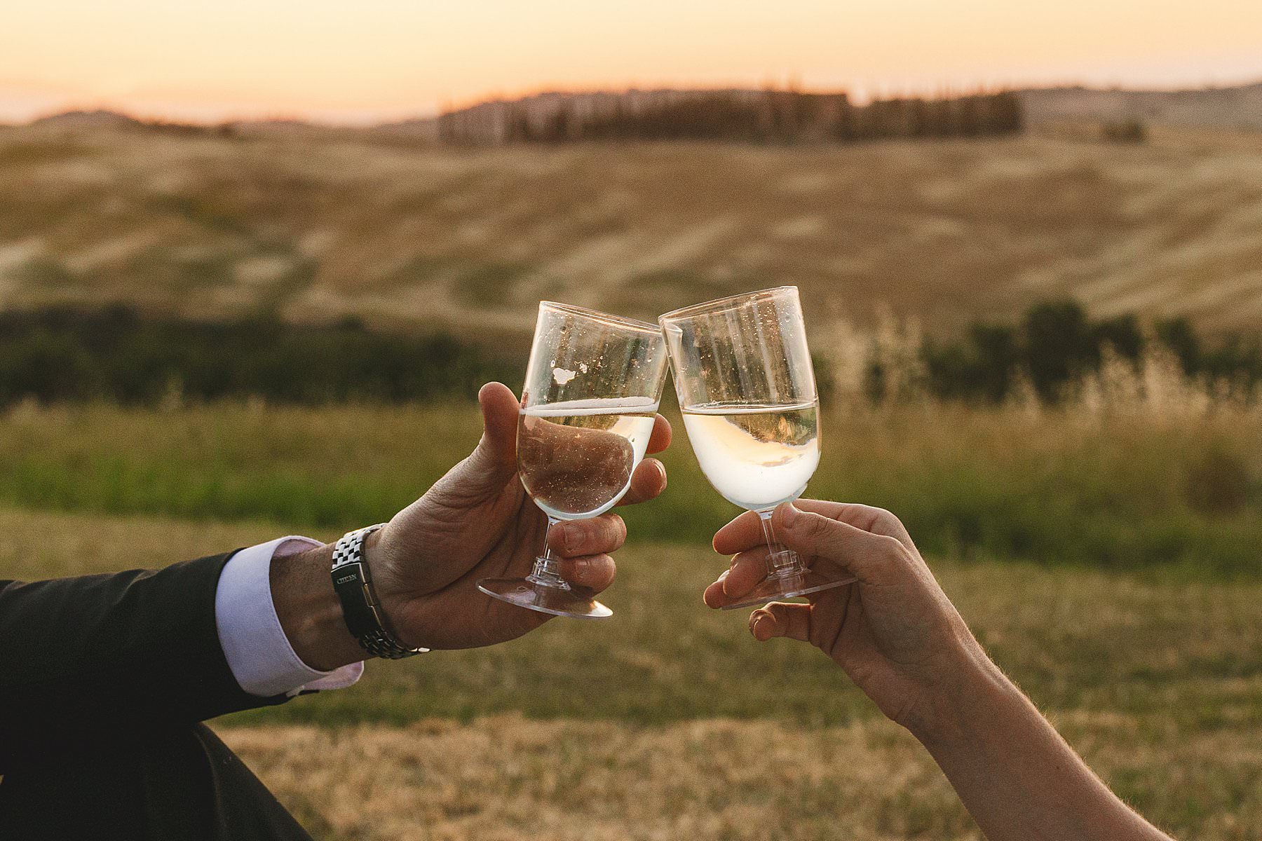 Here, in fact, the bride and groom exchanged their vows again, then opened a bottle of wine, sat on the grass and read the letters and messages of congratulations that their friends and families wrote for the occasion. The golden hour light and the sun setting behind the hills were the icing on this romantic elopement cake: Robin and Yves will surely remember this day forever.