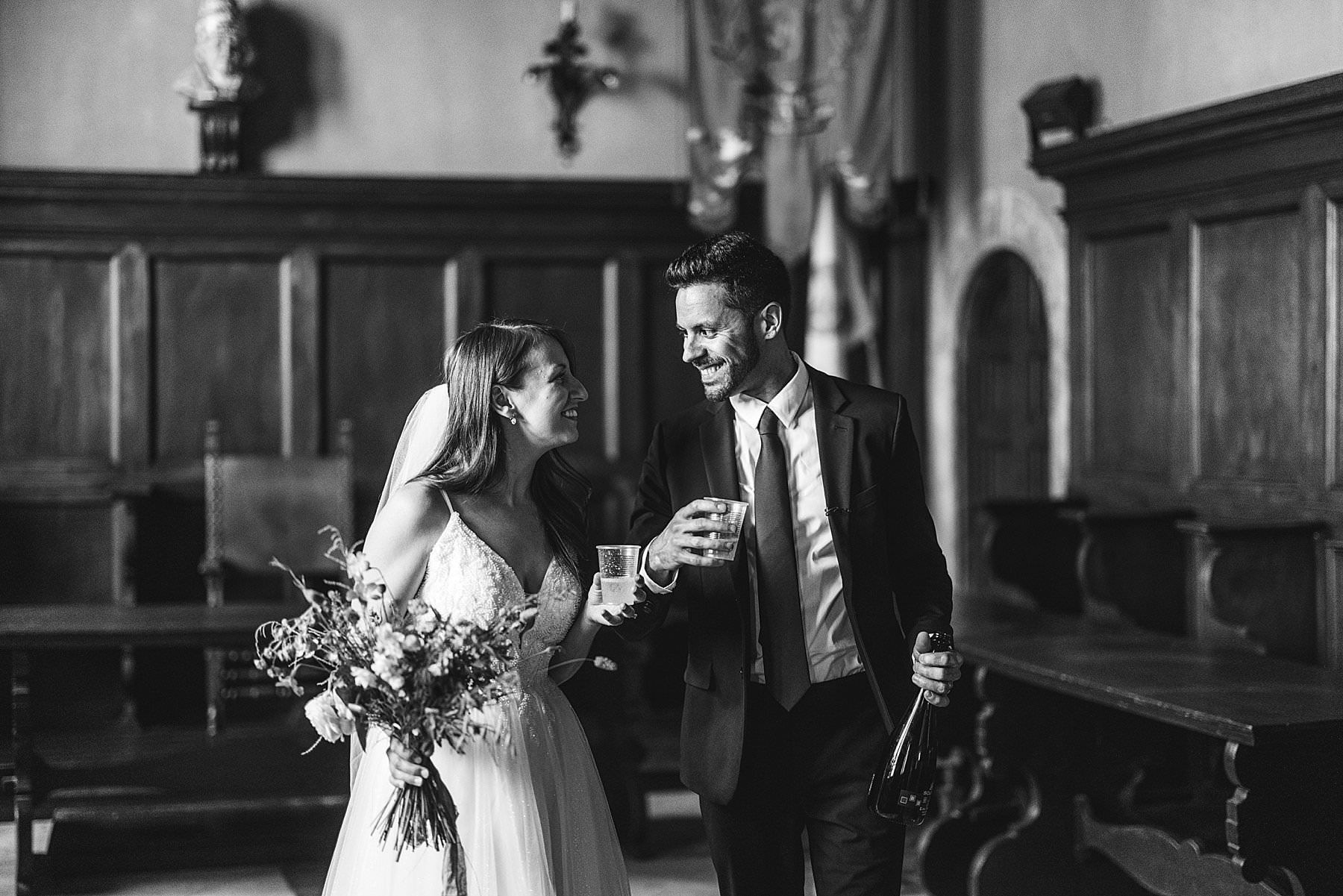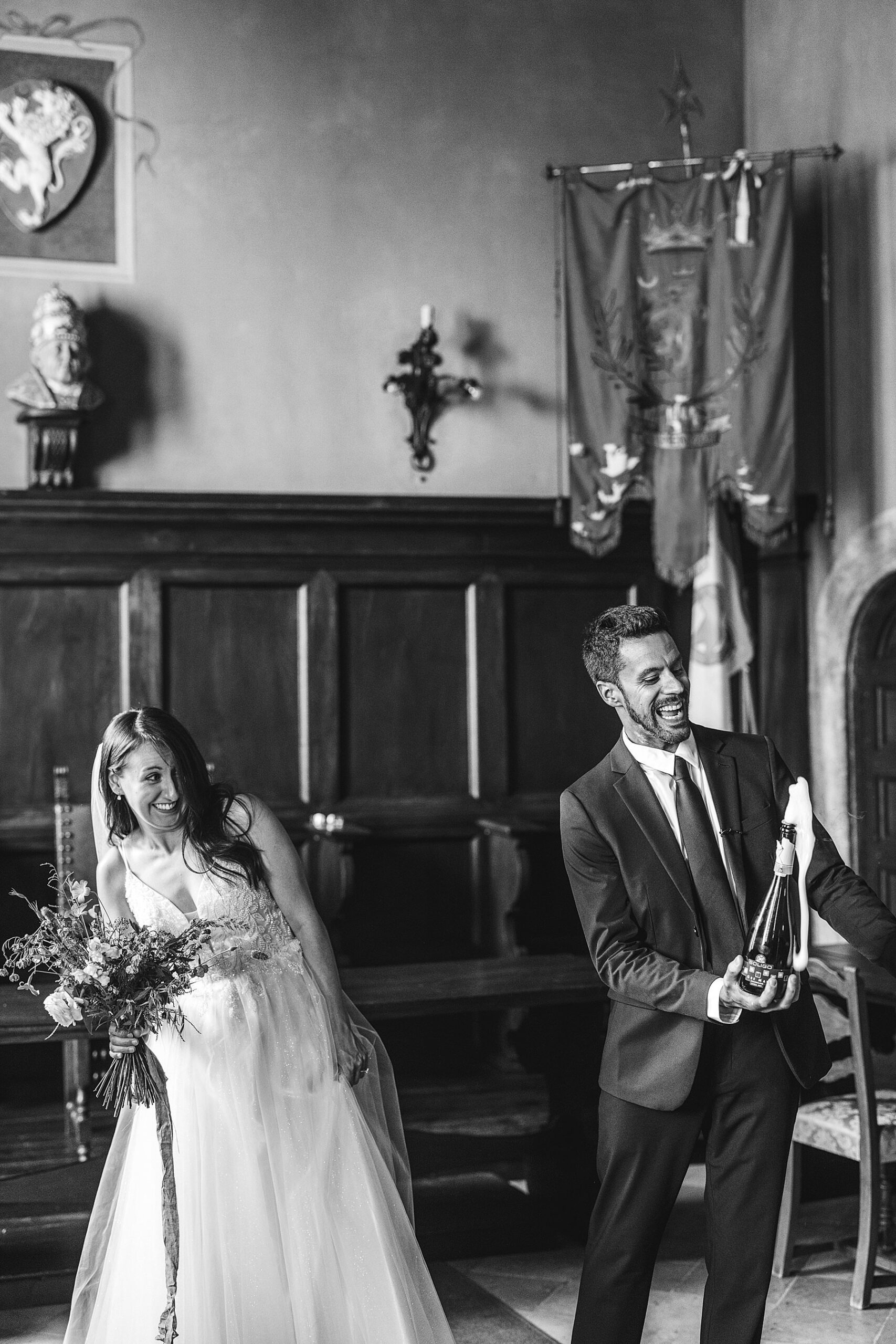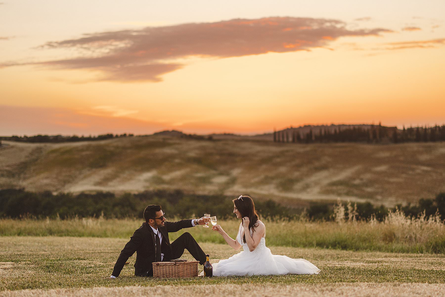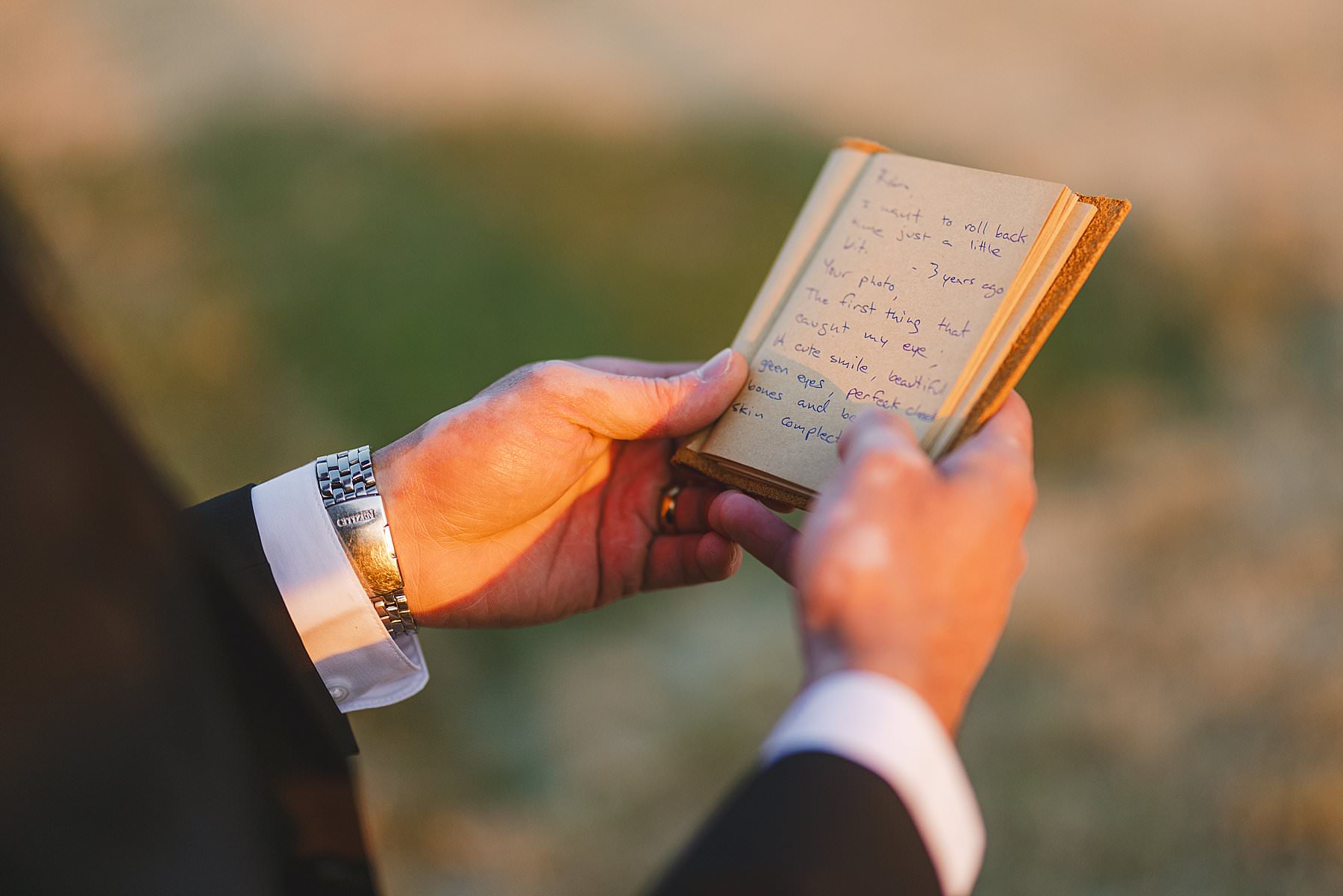 Here, in fact, the bride and groom exchanged their vows again, then opened a bottle of wine, sat on the grass and read the letters and messages of congratulations that their friends and families wrote for the occasion. The golden hour light and the sun setting behind the hills were the icing on this romantic elopement cake: Robin and Yves will surely remember this day forever.