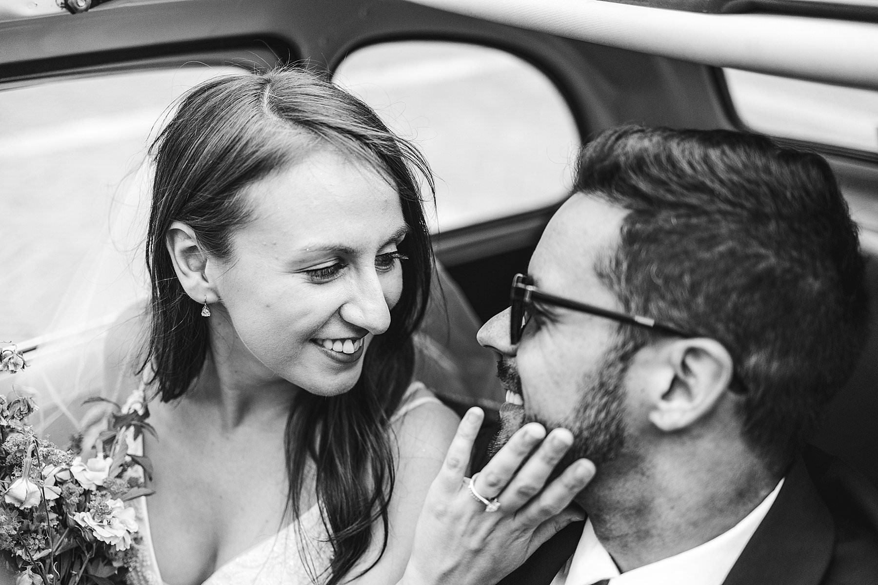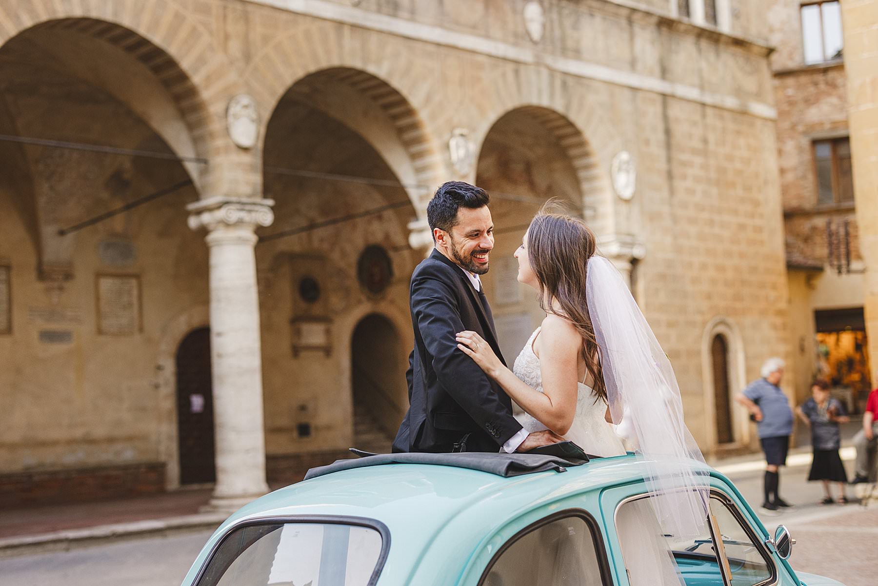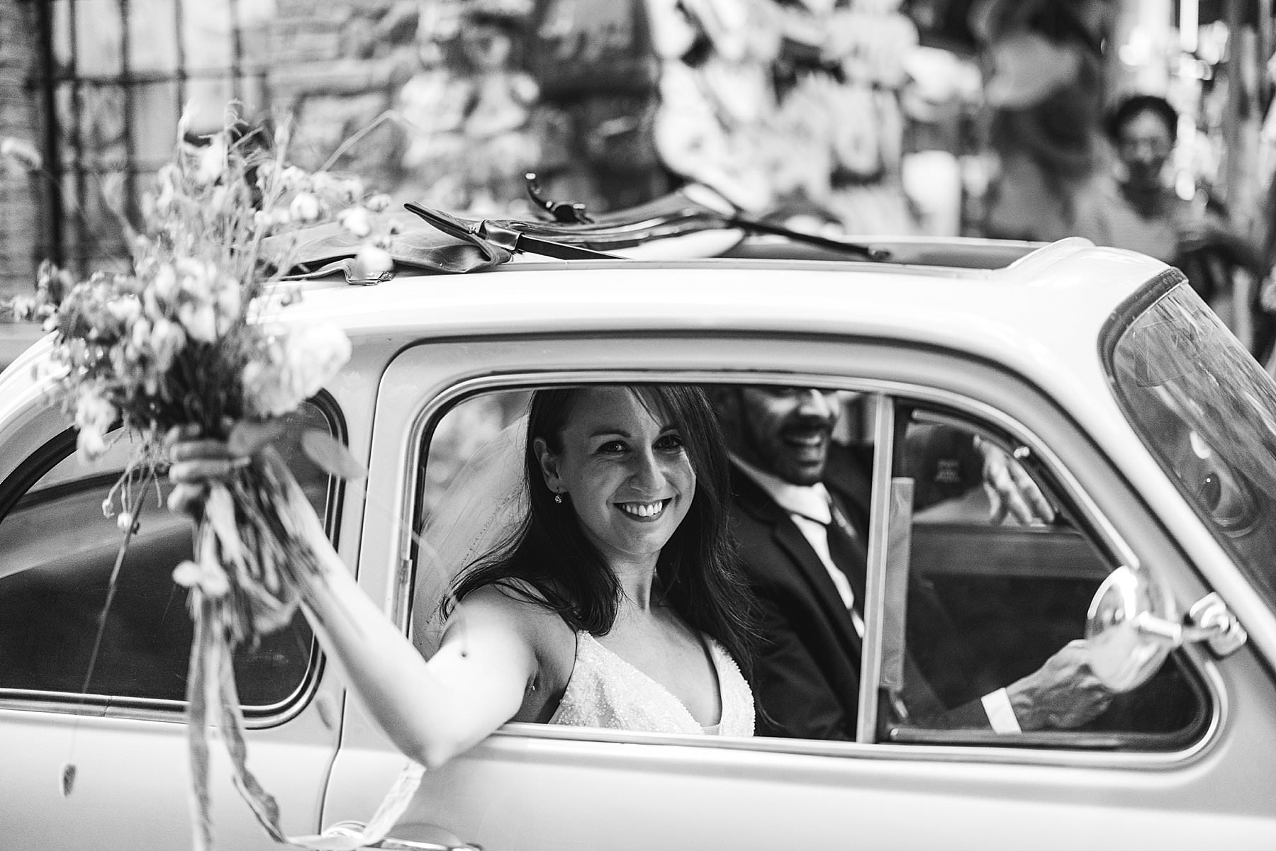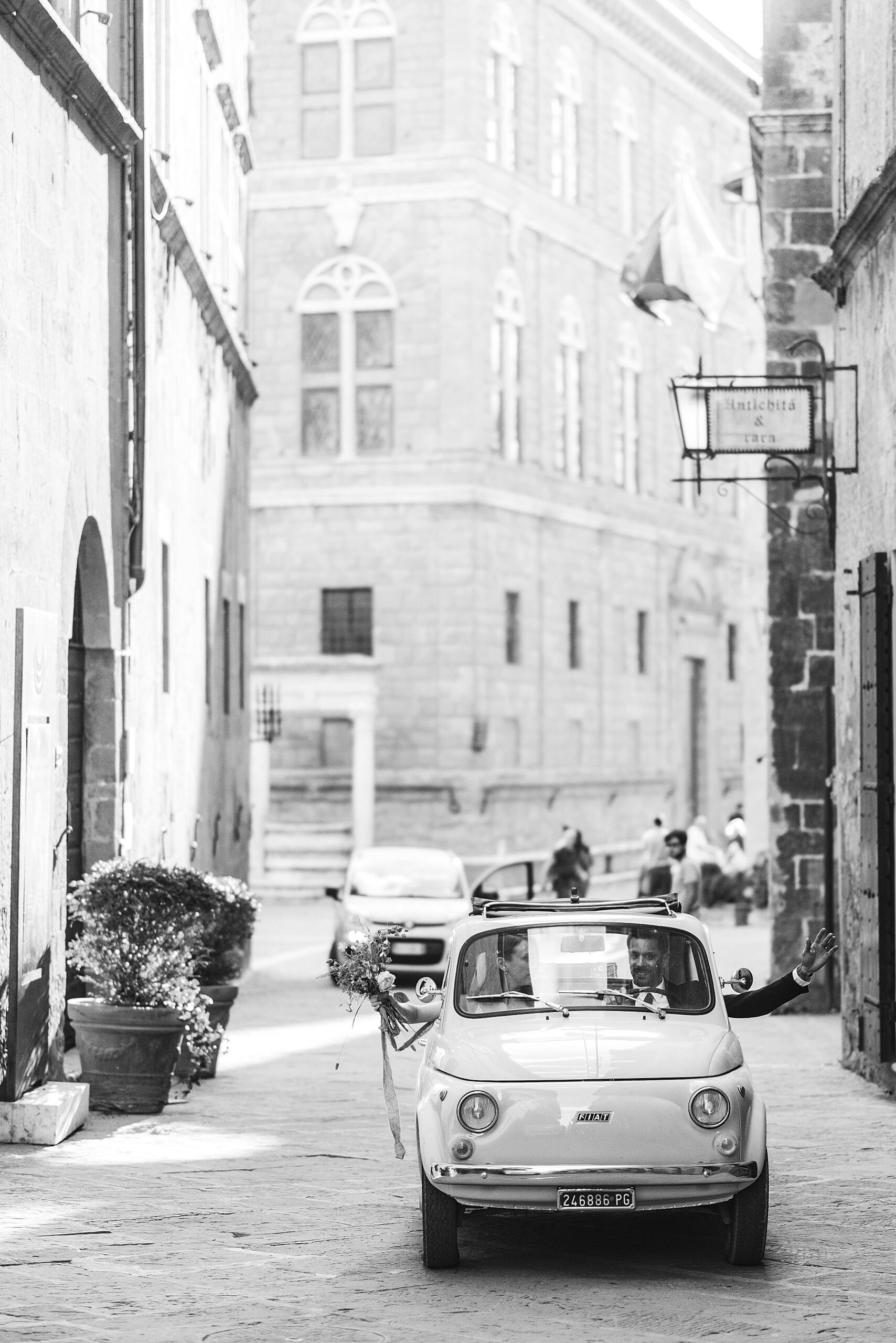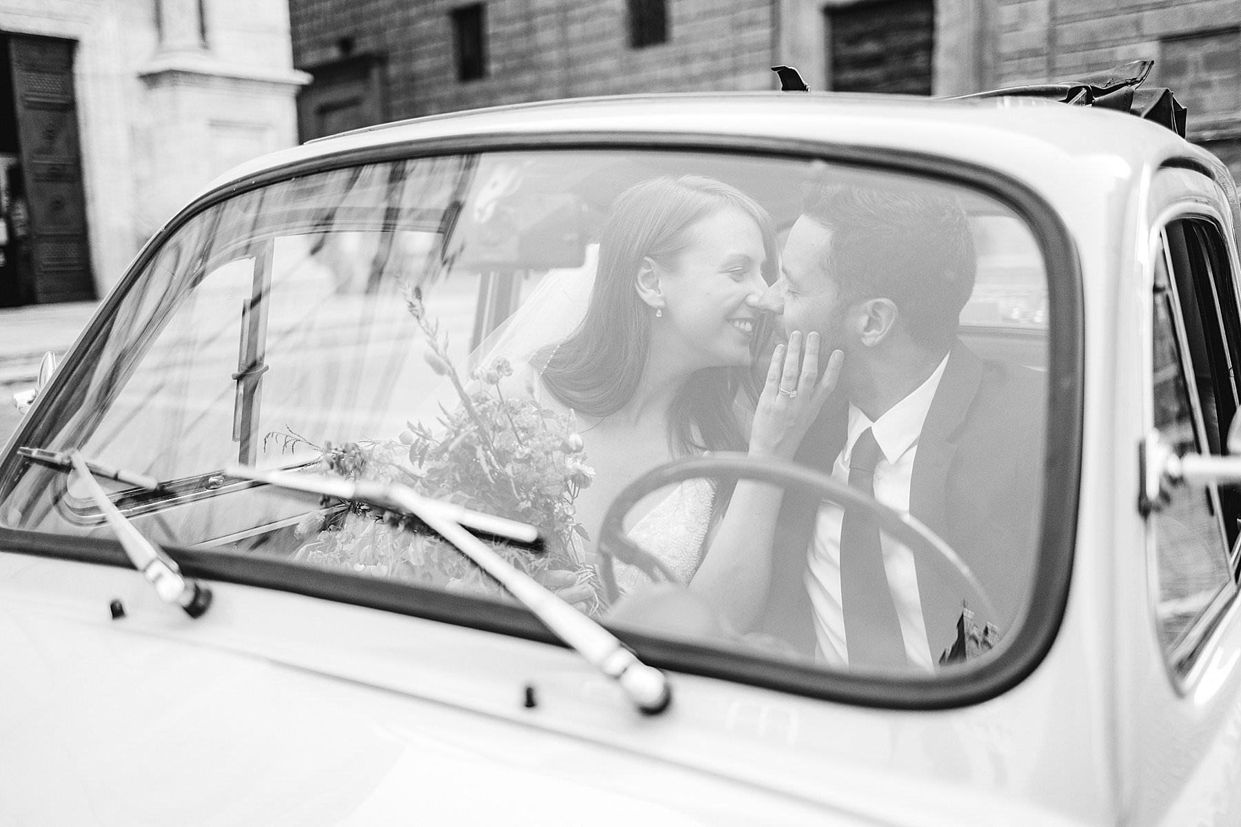 Bride and groom candid wedding photo while driving in the town of Pienza with their Fiat500. Photo by the Italian elegant wedding photographer in Tuscany based Florence Gabriele Fani