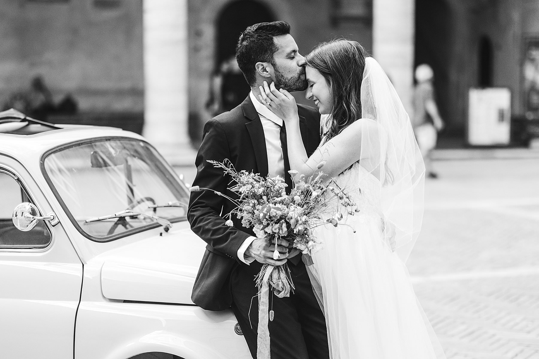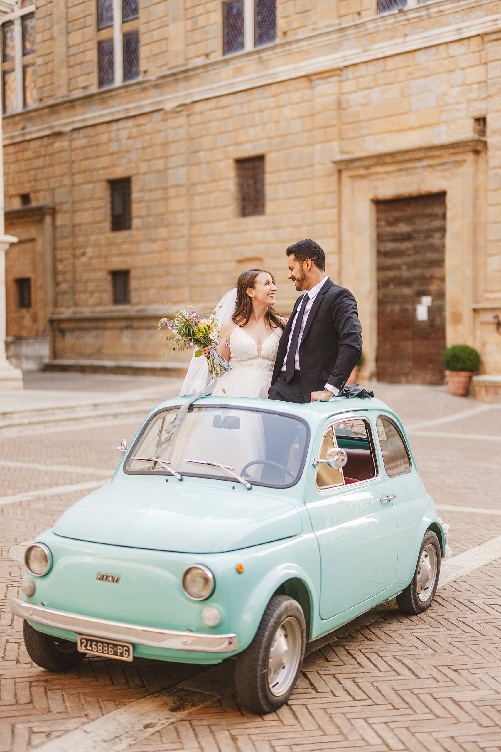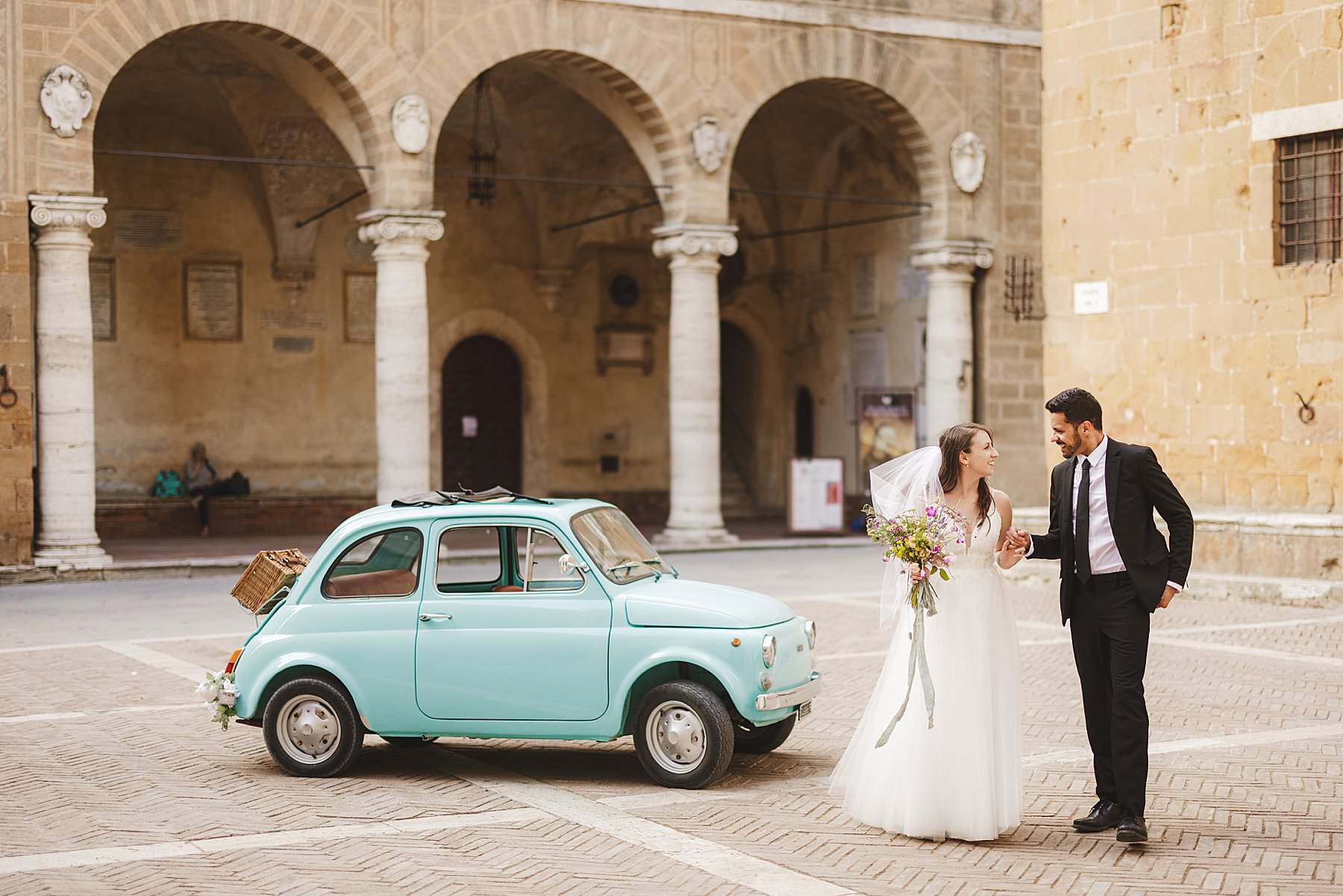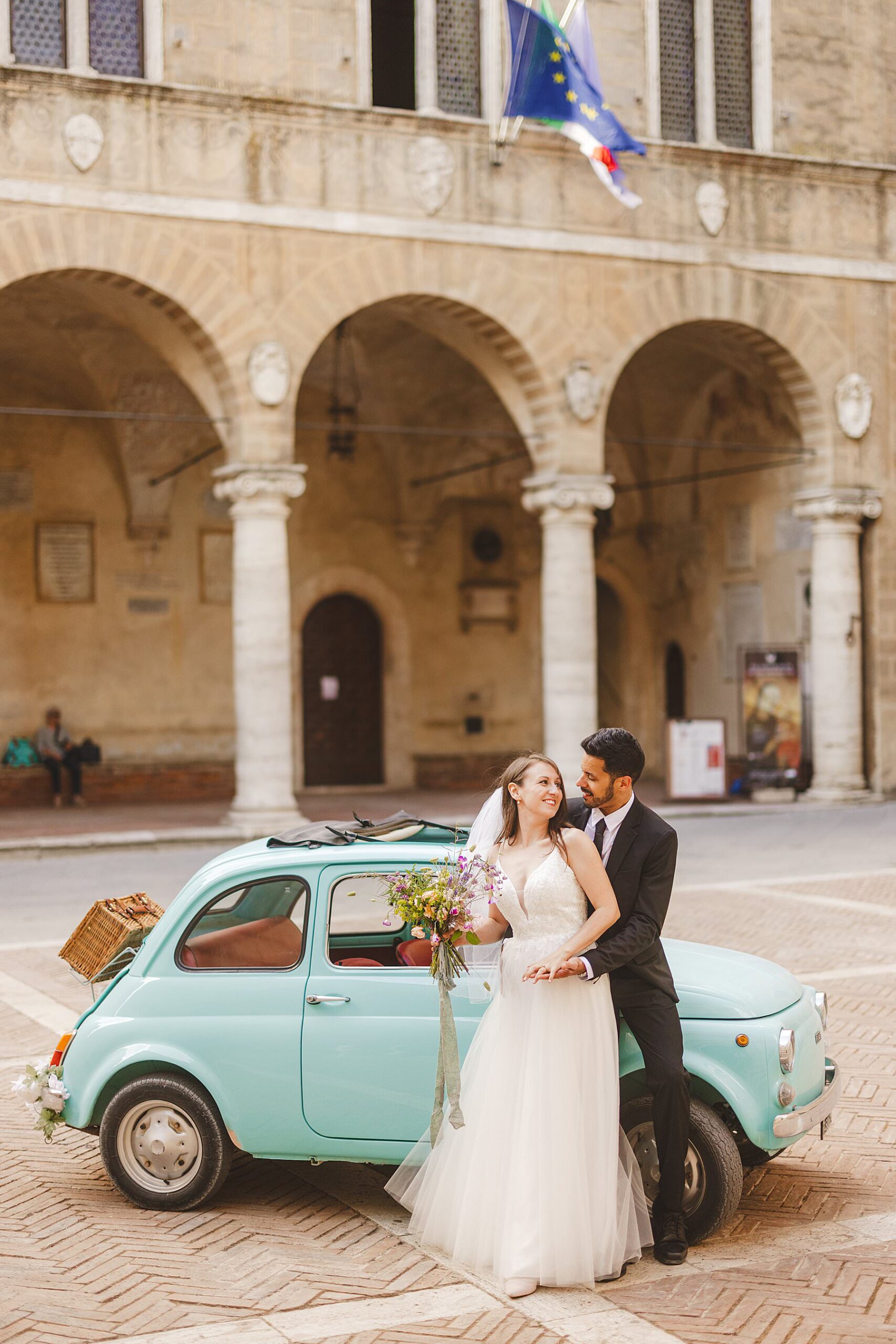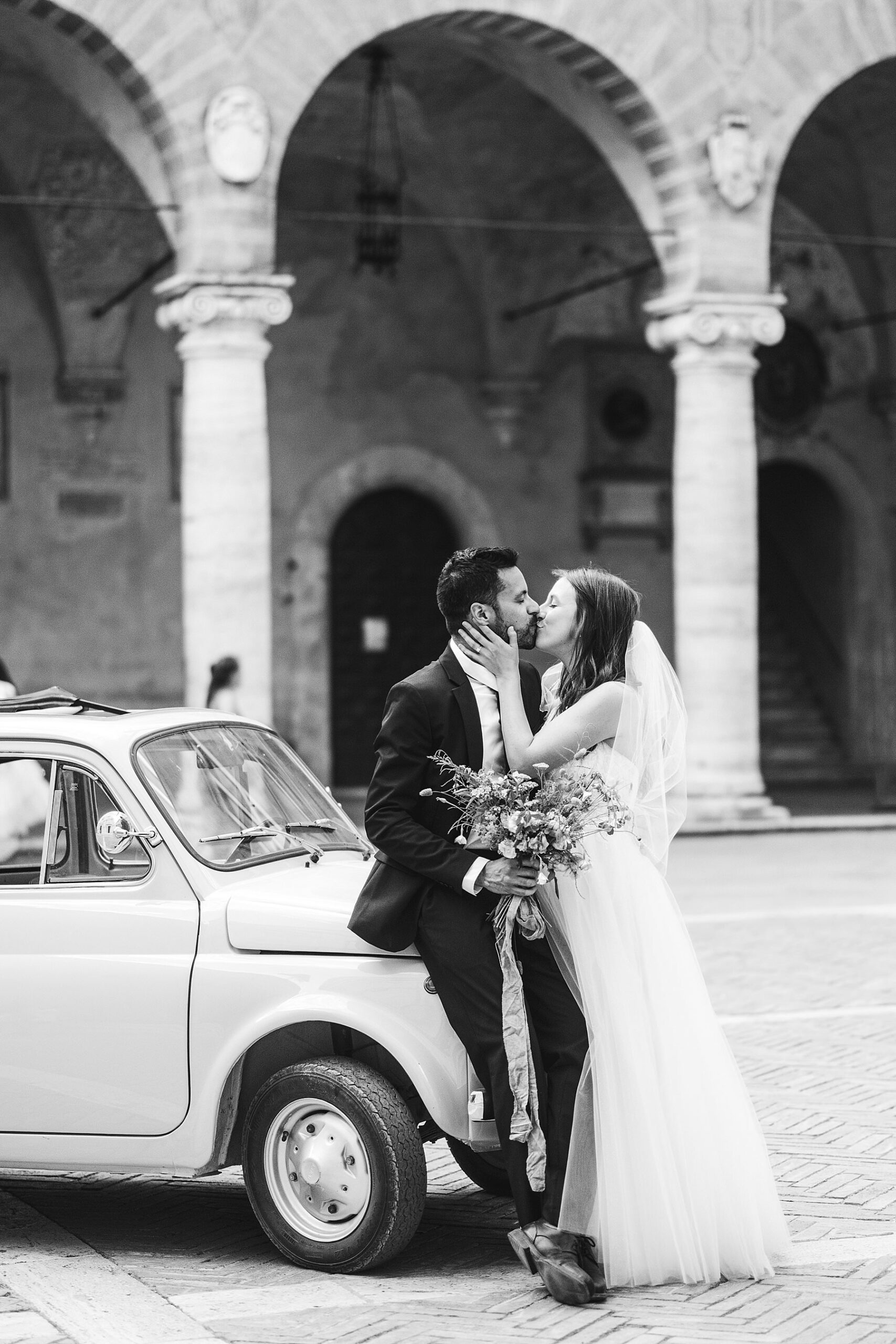 Bride and groom elopement portrait photo with Fiat 500 in the charming streets of Pienza, Tuscany. Photo by the Italian elegant wedding photographer in Tuscany based Florence Gabriele Fani