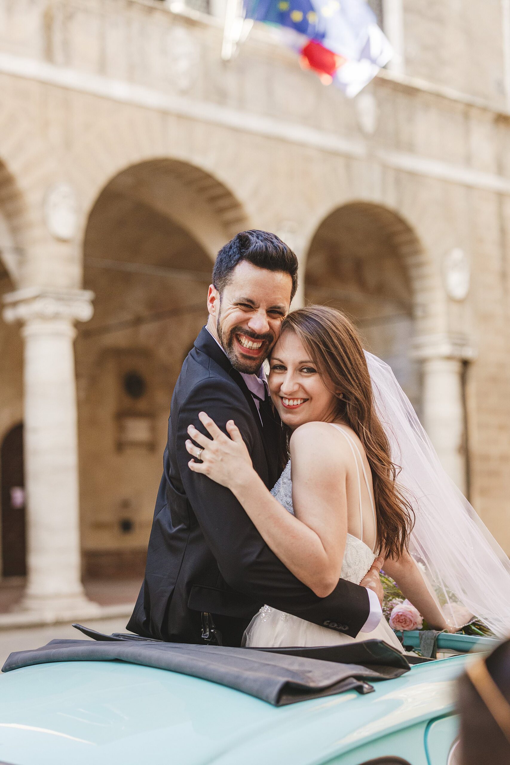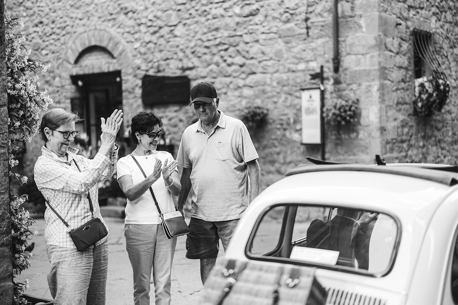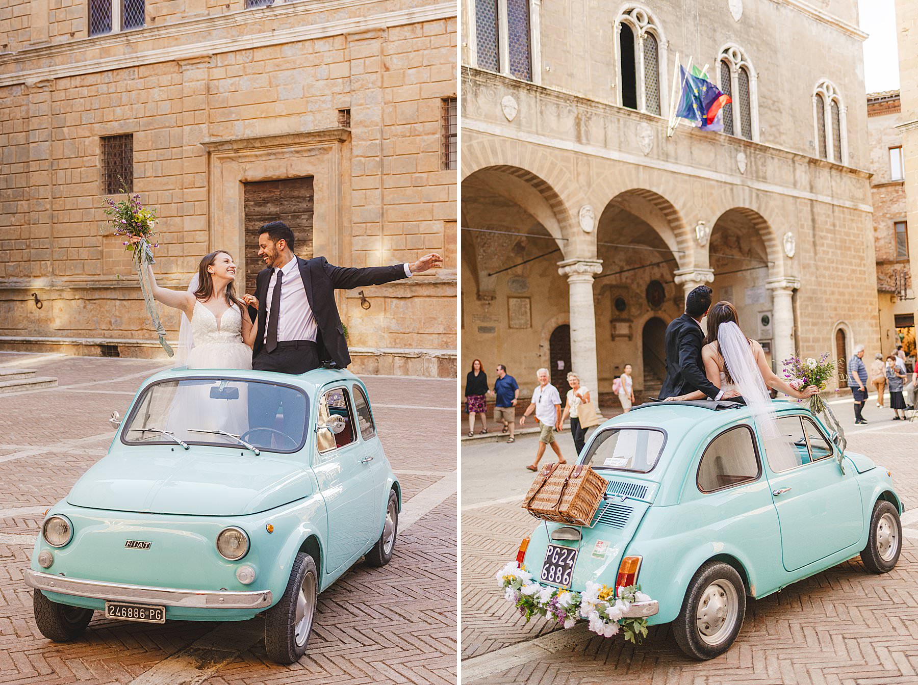 After the ritual, we took some portraits of the newlyweds around the charming streets of Pienza. Yves, an airline pilot, had the desire to drive something special… so they rented a convertible Fiat 500: ideal for a wedding, with its vintage touch and Tiffany color! It was fun and sweet to photograph them in the main square of the town, with residents and tourists cheering them as they drove by.