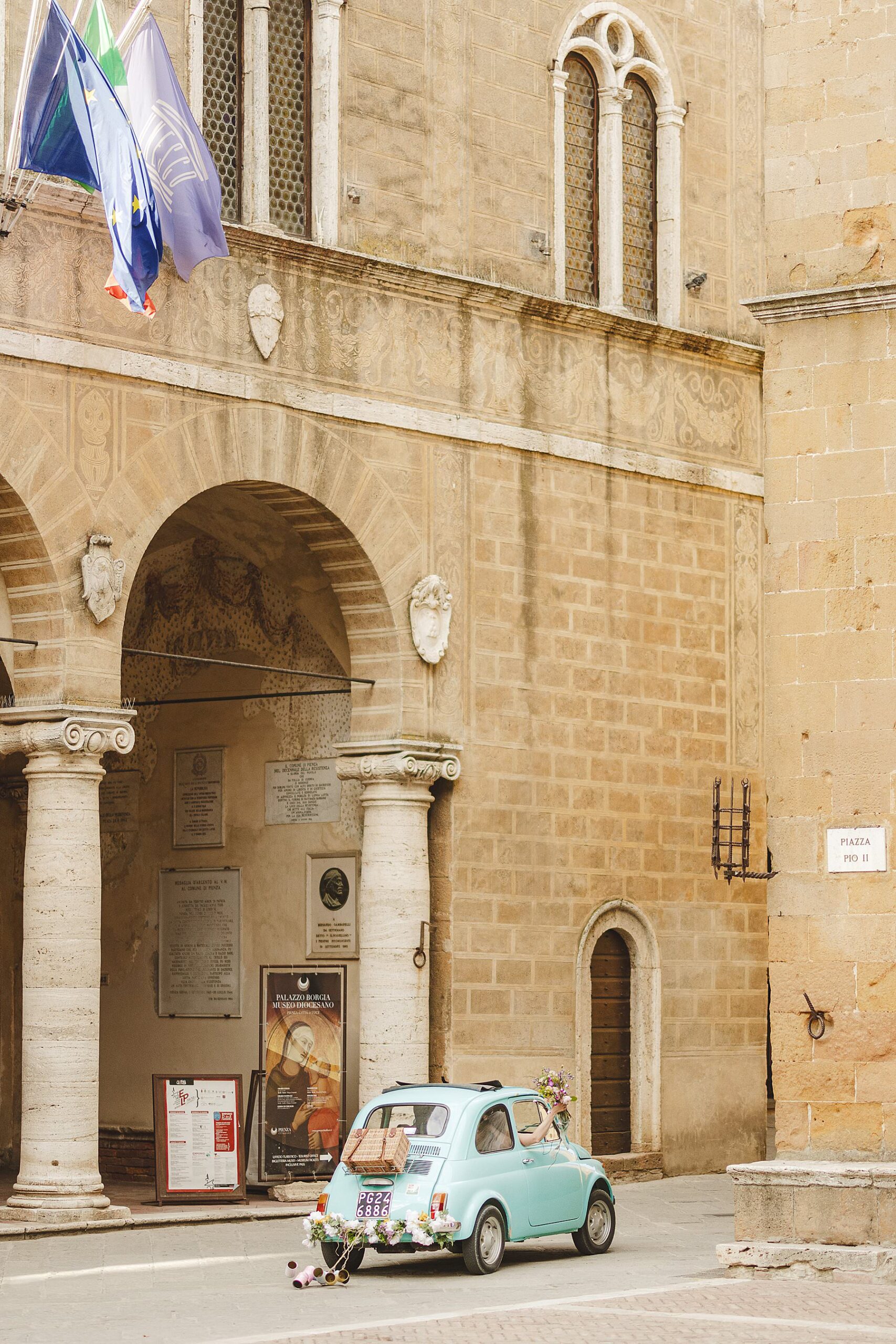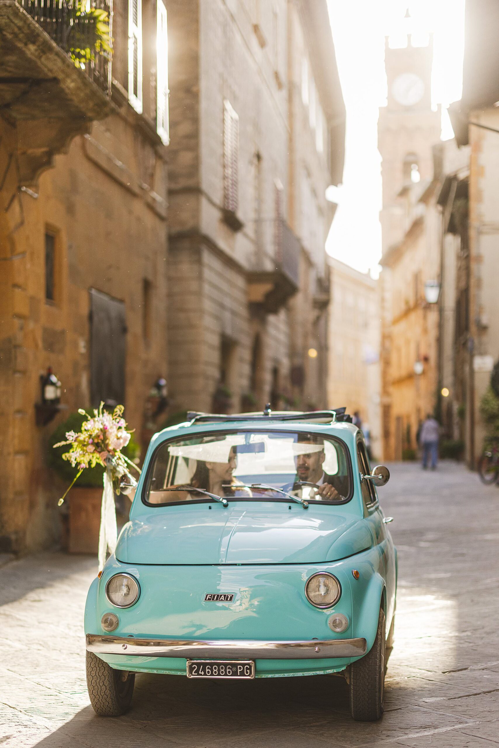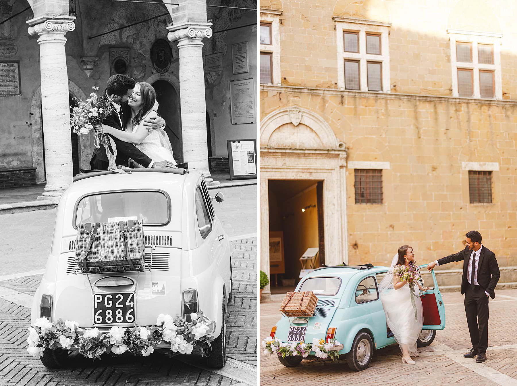 Intimate and romantic elopement in Pienza heart of Tuscany with Fiat 500. Photo by the Italian elegant wedding photographer in Tuscany based Florence Gabriele Fani