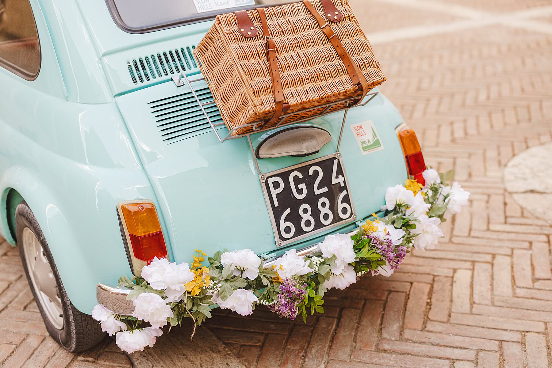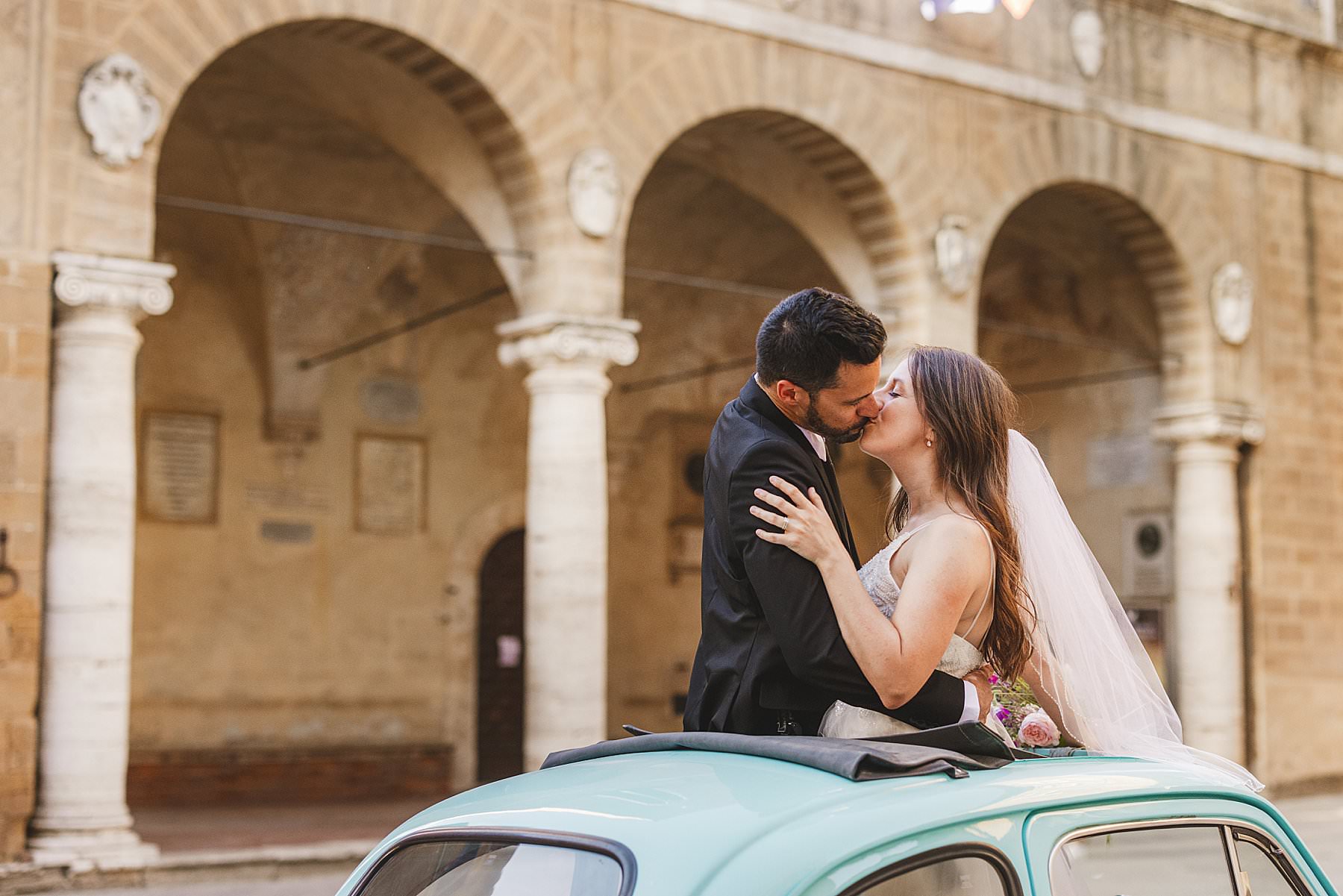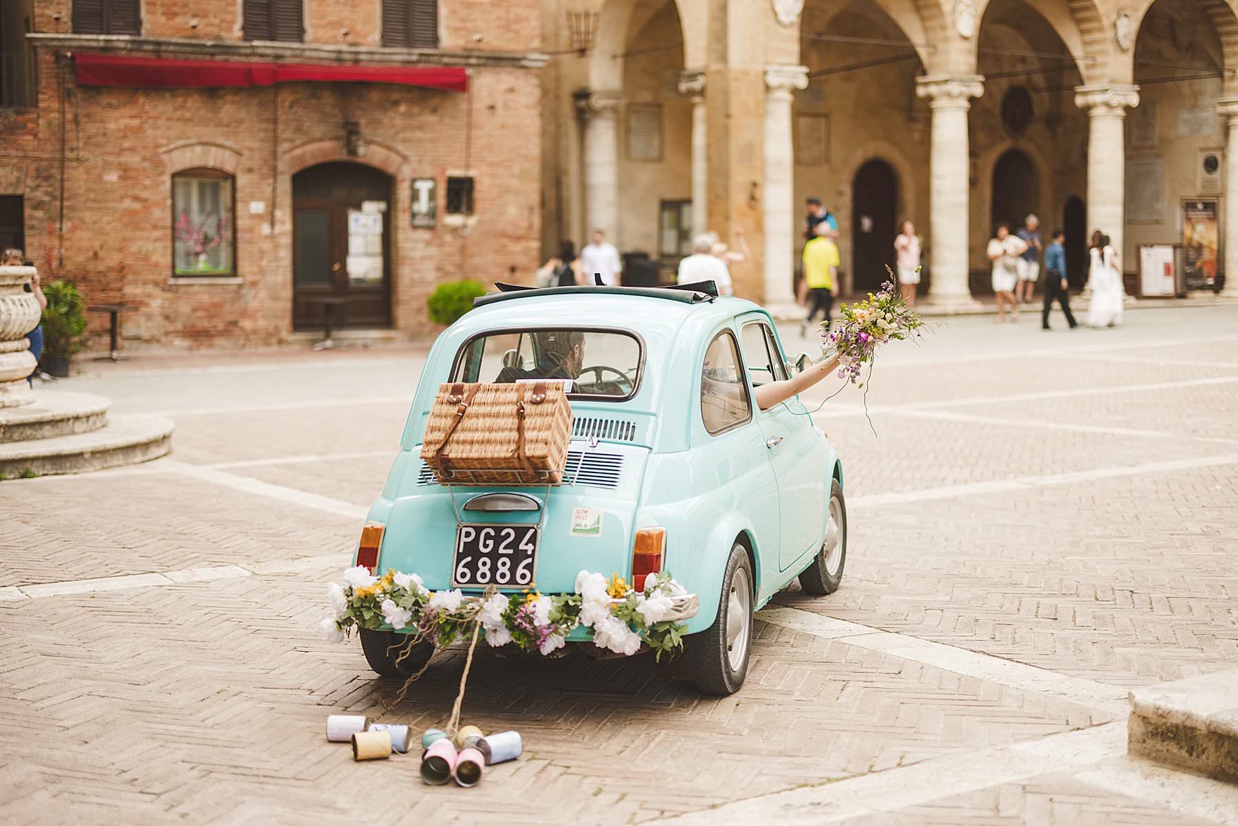 Intimate and romantic elopement in Pienza heart of Tuscany with Fiat 500. Photo by the Italian elegant wedding photographer in Tuscany based Florence Gabriele Fani