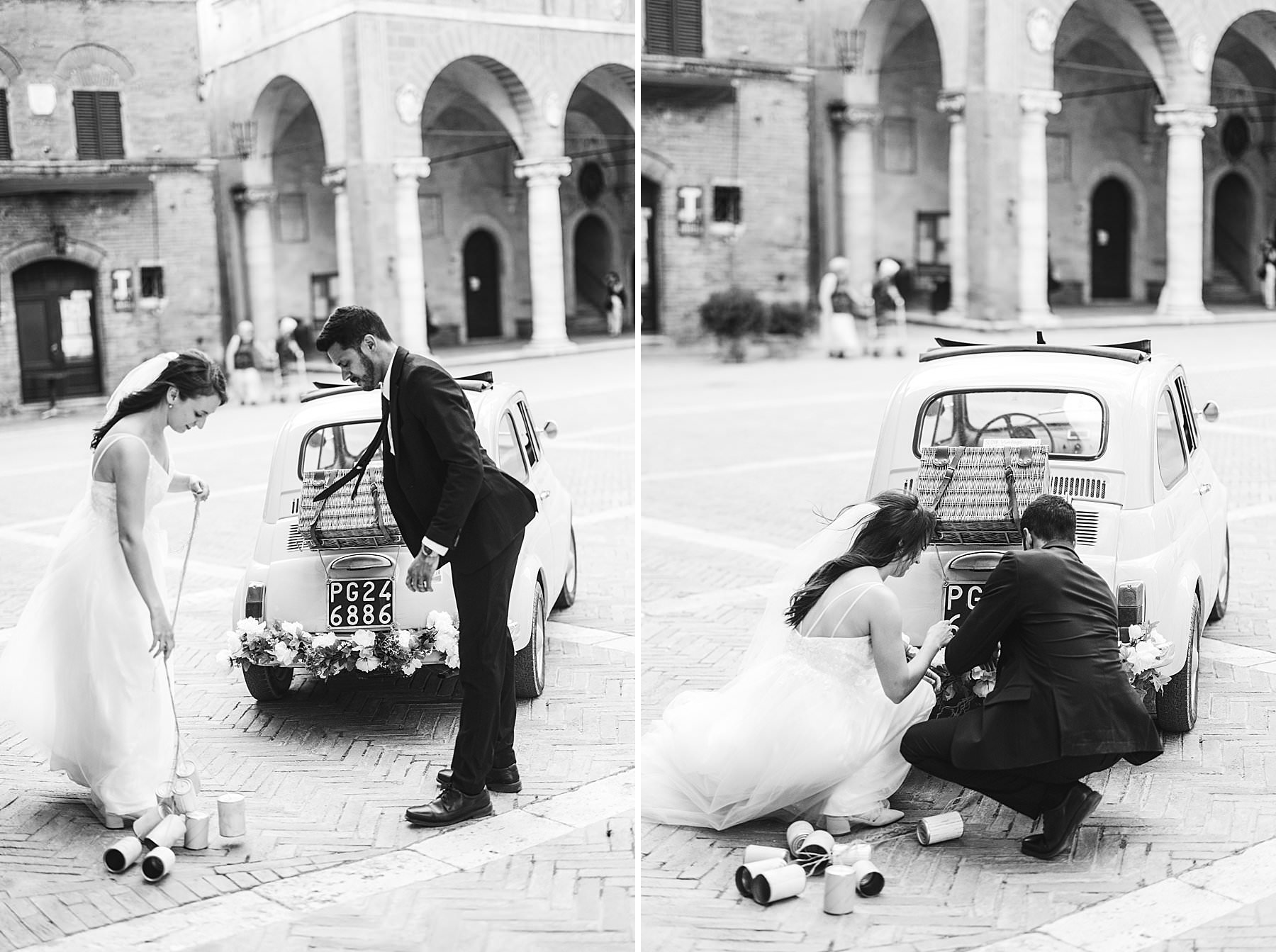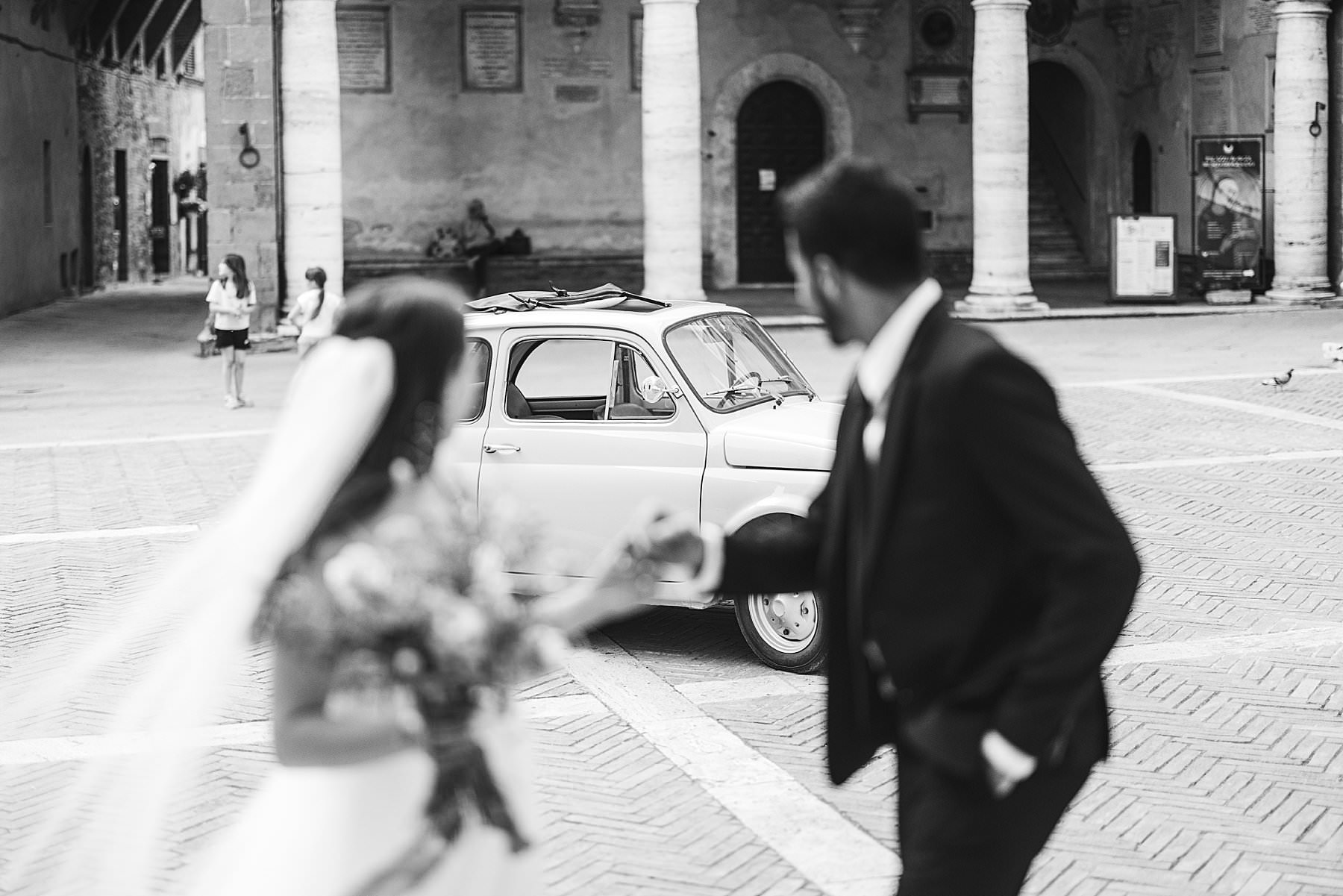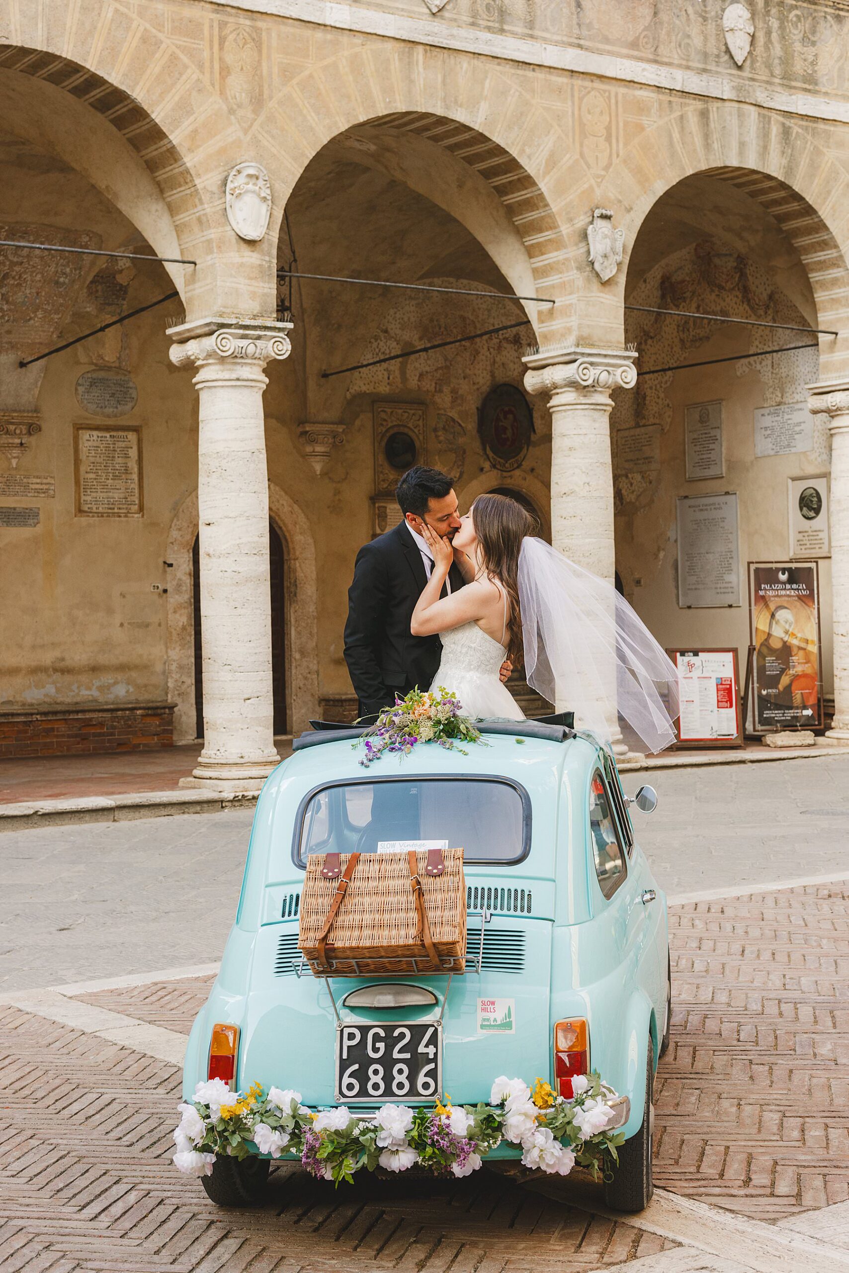 Bride and groom wedding photo with Fiat 500 in the charming streets of Pienza, Tuscany. Photo by the Italian elegant wedding photographer in Tuscany based Florence Gabriele Fani