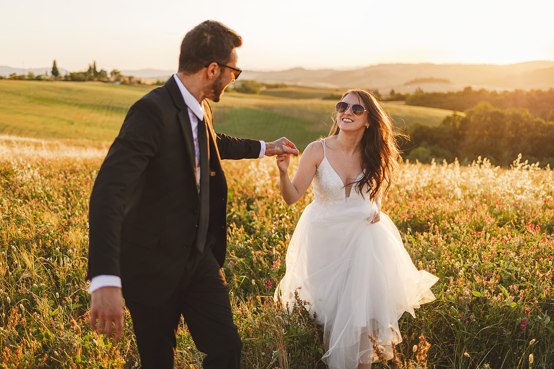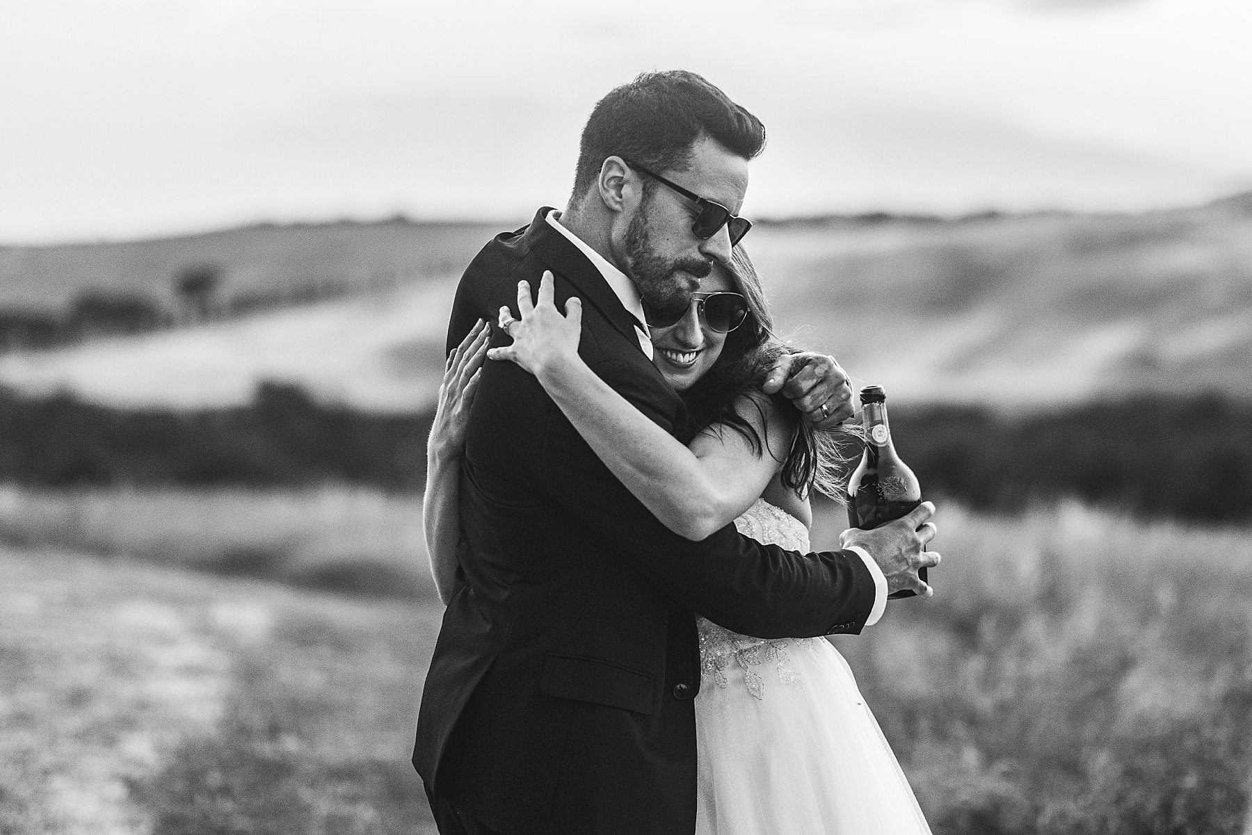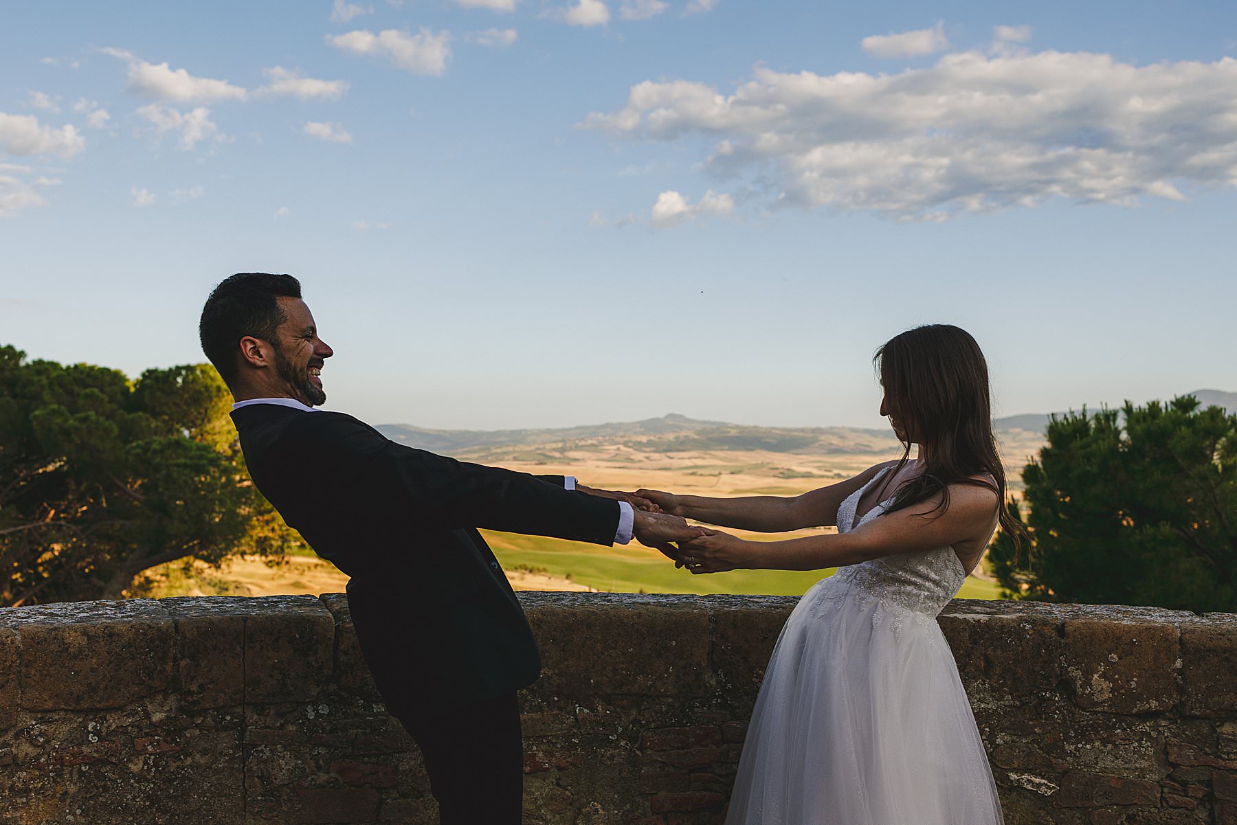 Exciting bride and groom elopement wedding portrait in the golden hour light in the heart of Tuscany countryside near Pienza. Photo by the Italian elegant wedding photographer in Tuscany based Florence Gabriele Fani