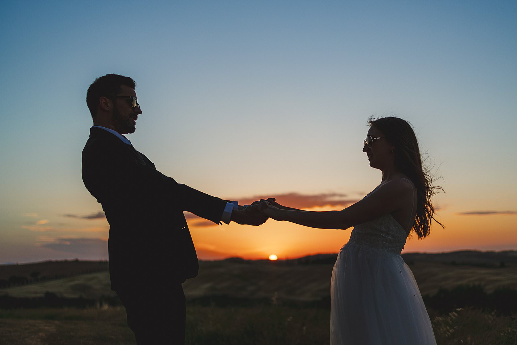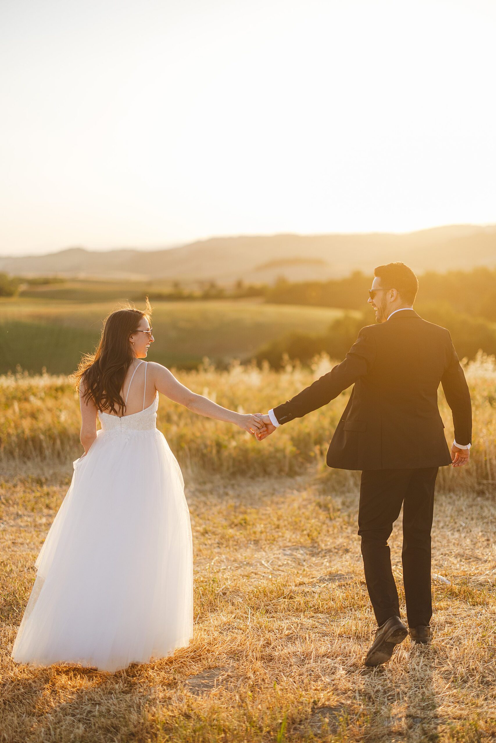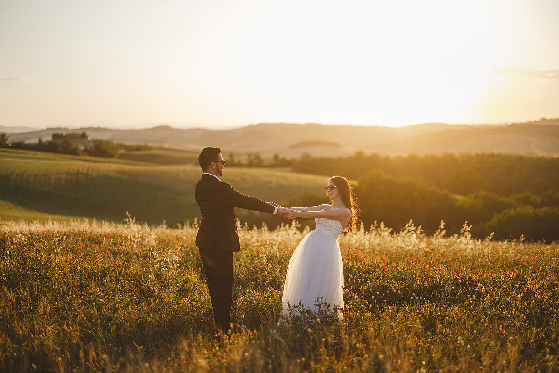 Exciting bride and groom elopement wedding portrait in the golden hour light in the heart of Tuscany countryside near Pienza. Photo by the Italian elegant wedding photographer in Tuscany based Florence Gabriele Fani