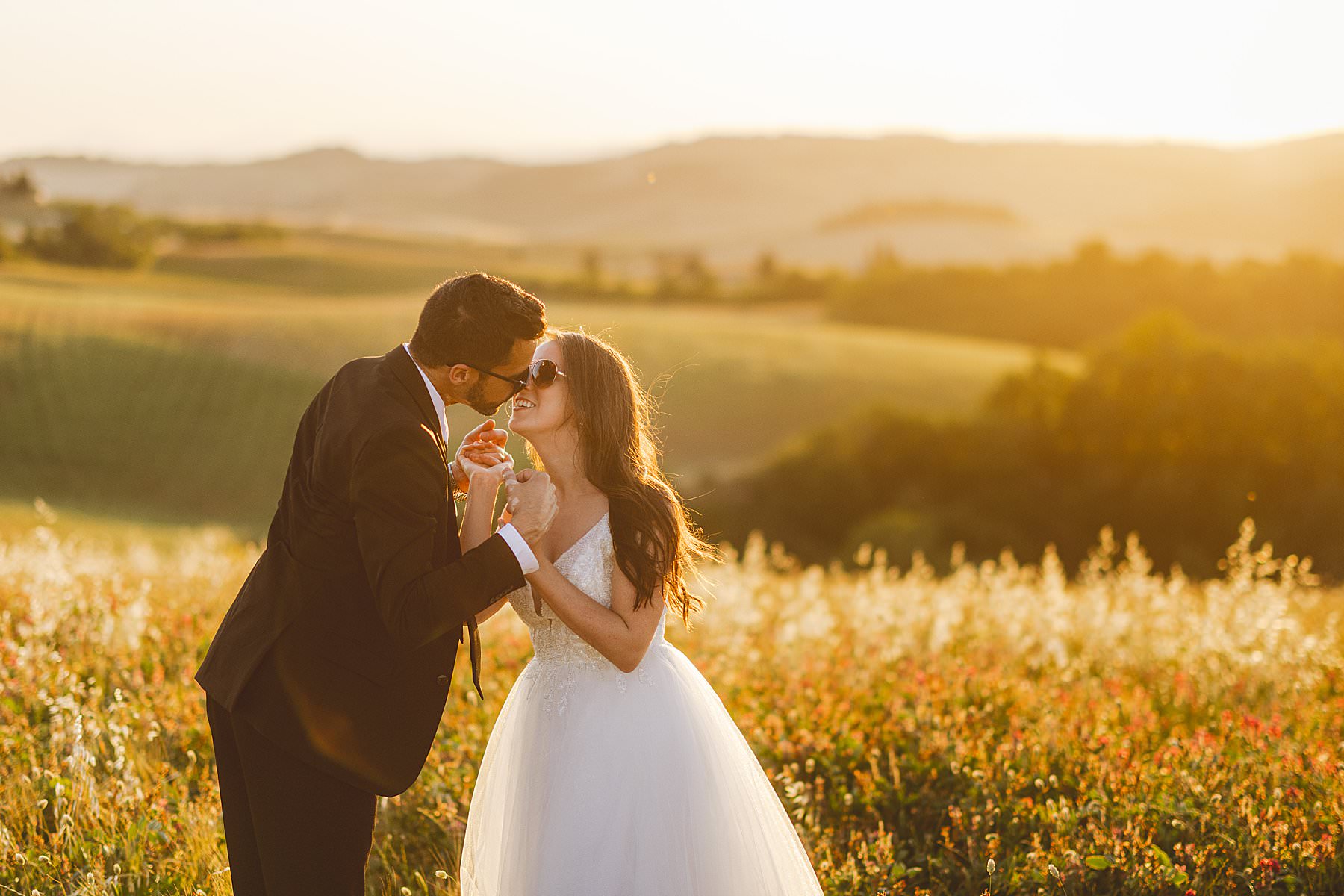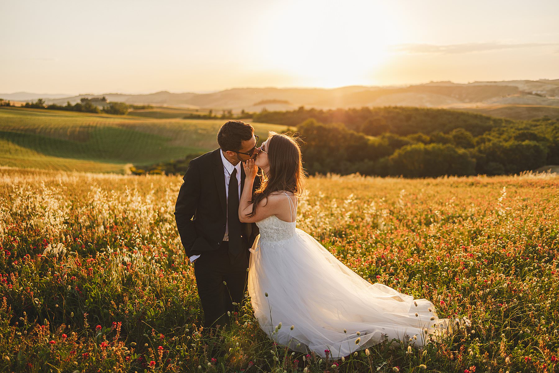 Bride and groom wedding portrait in the golden hour light heart of Val d’Orcia near Pienza. Photo by the Italian elegant wedding photographer in Tuscany based Florence Gabriele Fani