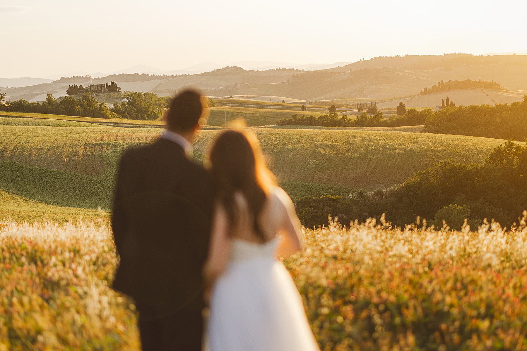 Bride and groom elopement wedding photo in the golden hour light in the heart of Val d’Orcia near Pienza. Photo by the Italian elegant wedding photographer in Tuscany based Florence Gabriele Fani