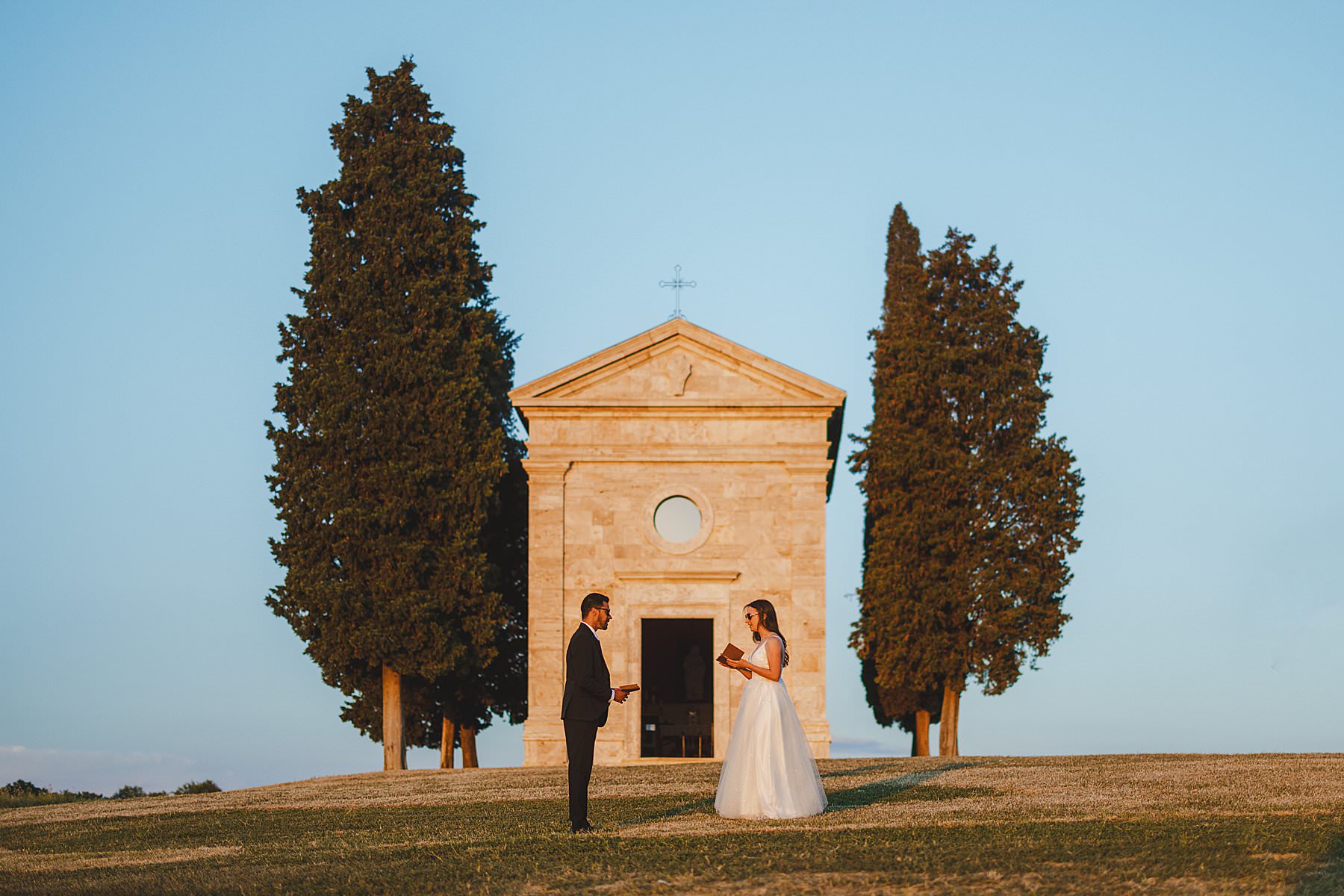 Exchanging vows rolling hills of Val d’Orcia, at the little Chapel of the Madonna di Vitaleta. Photo by the Italian elegant wedding photographer in Tuscany based Florence Gabriele Fani