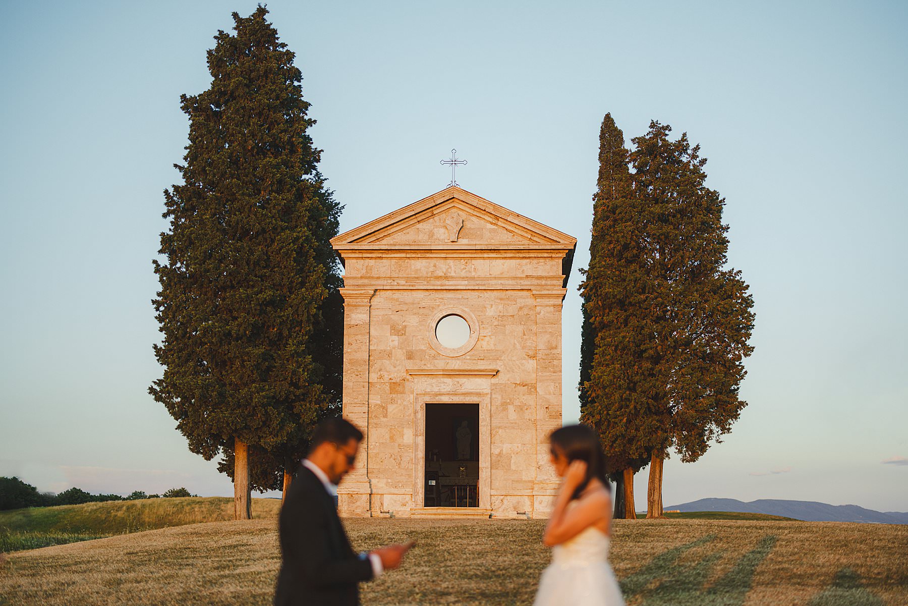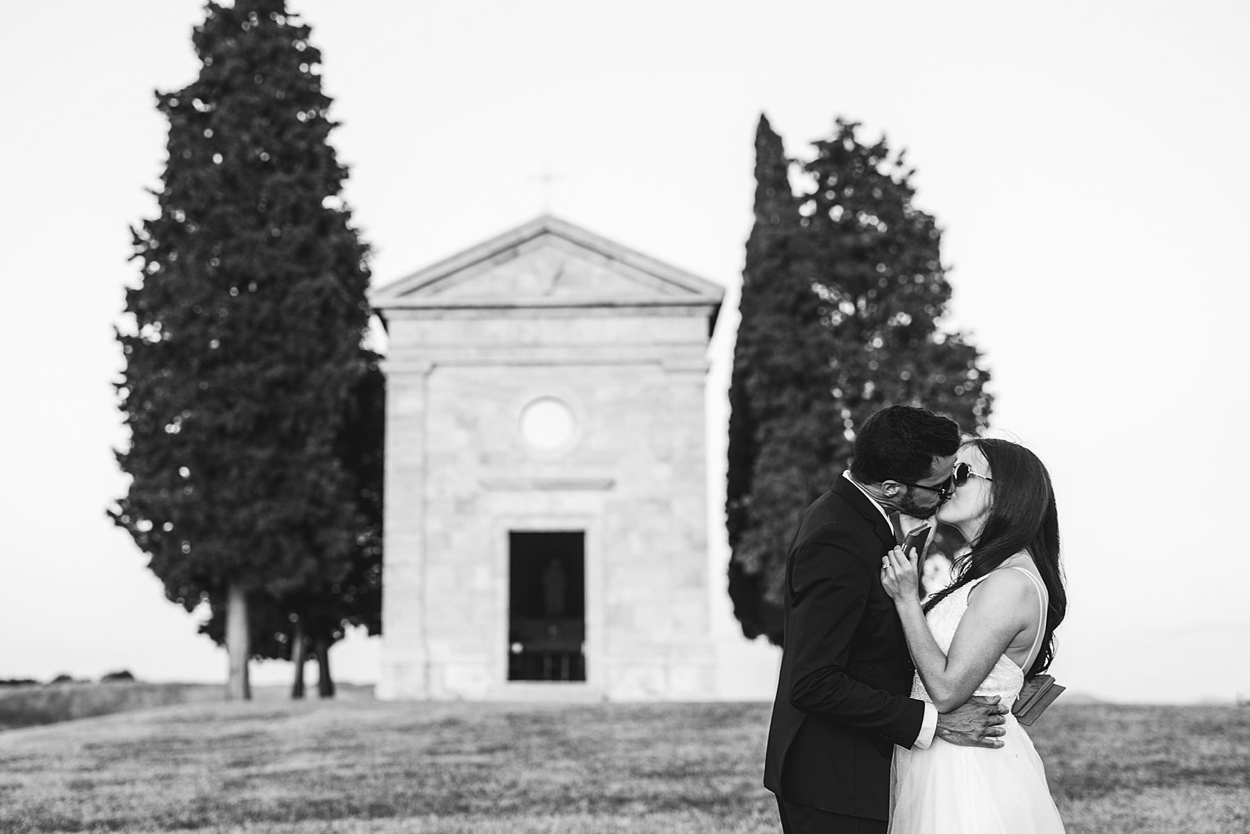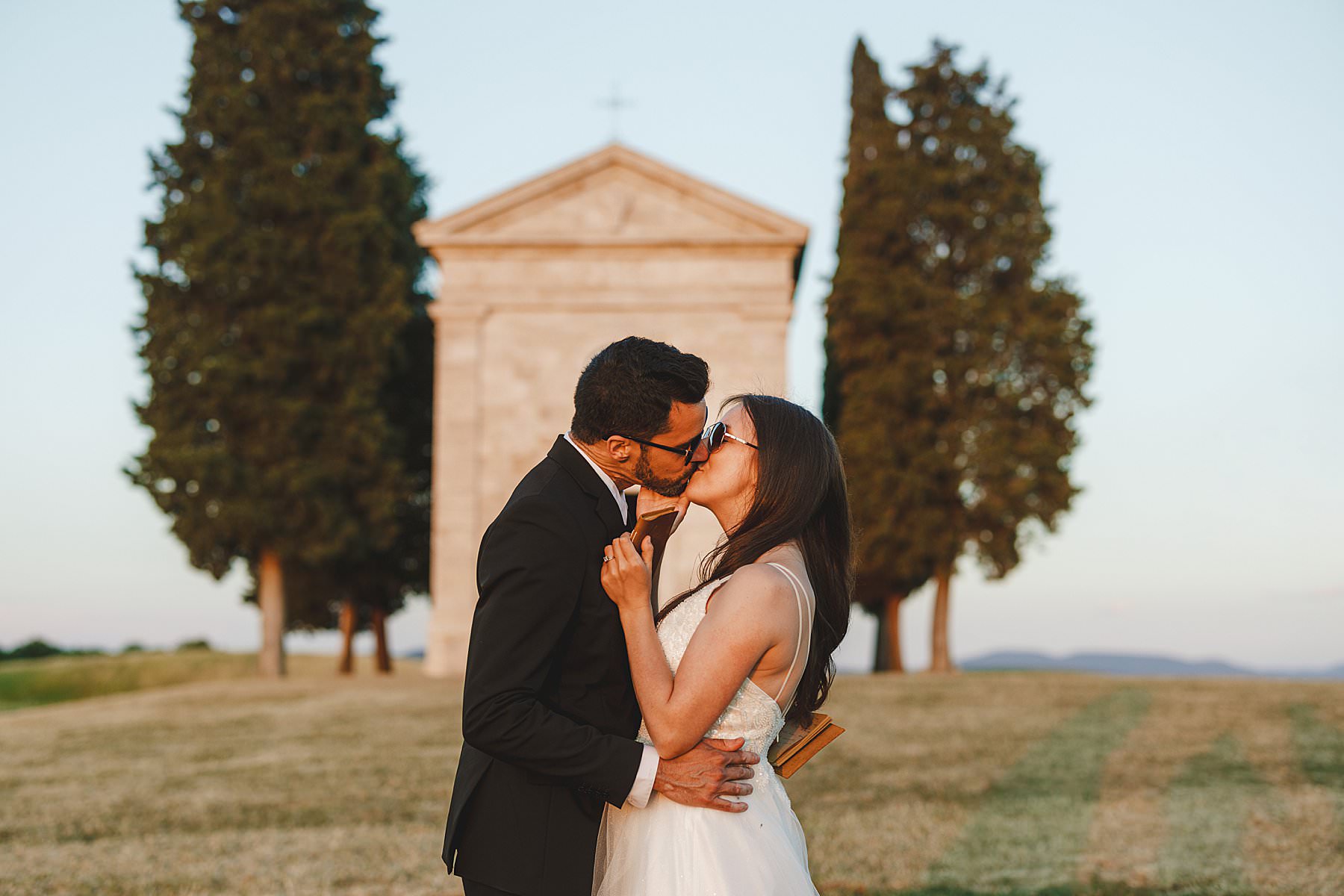 Unforgettable bride and groom elopement photo at Vitaleta Chapel near Pienza in the Val d’Orcia Tuscany with gorgeous sunset. Photo by the Italian elegant wedding photographer in Tuscany based Florence Gabriele Fani