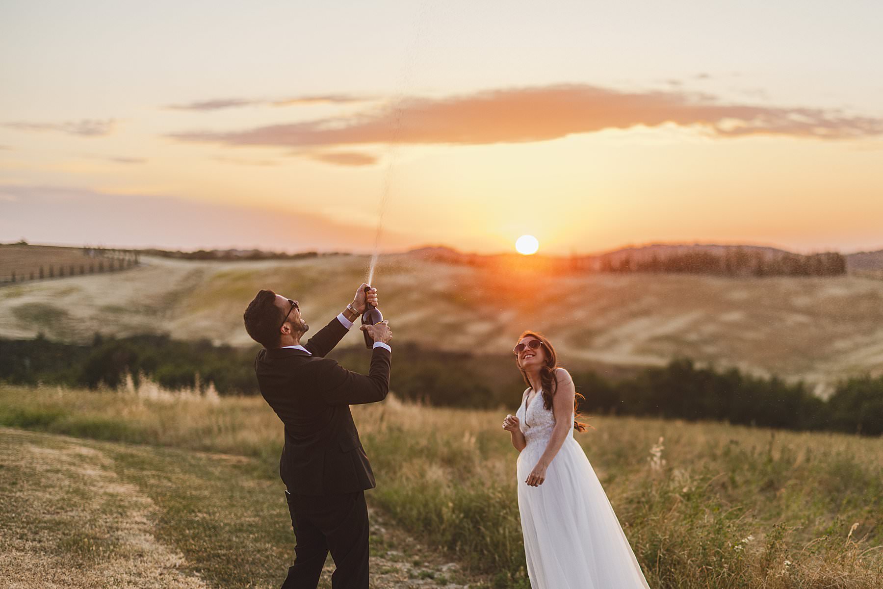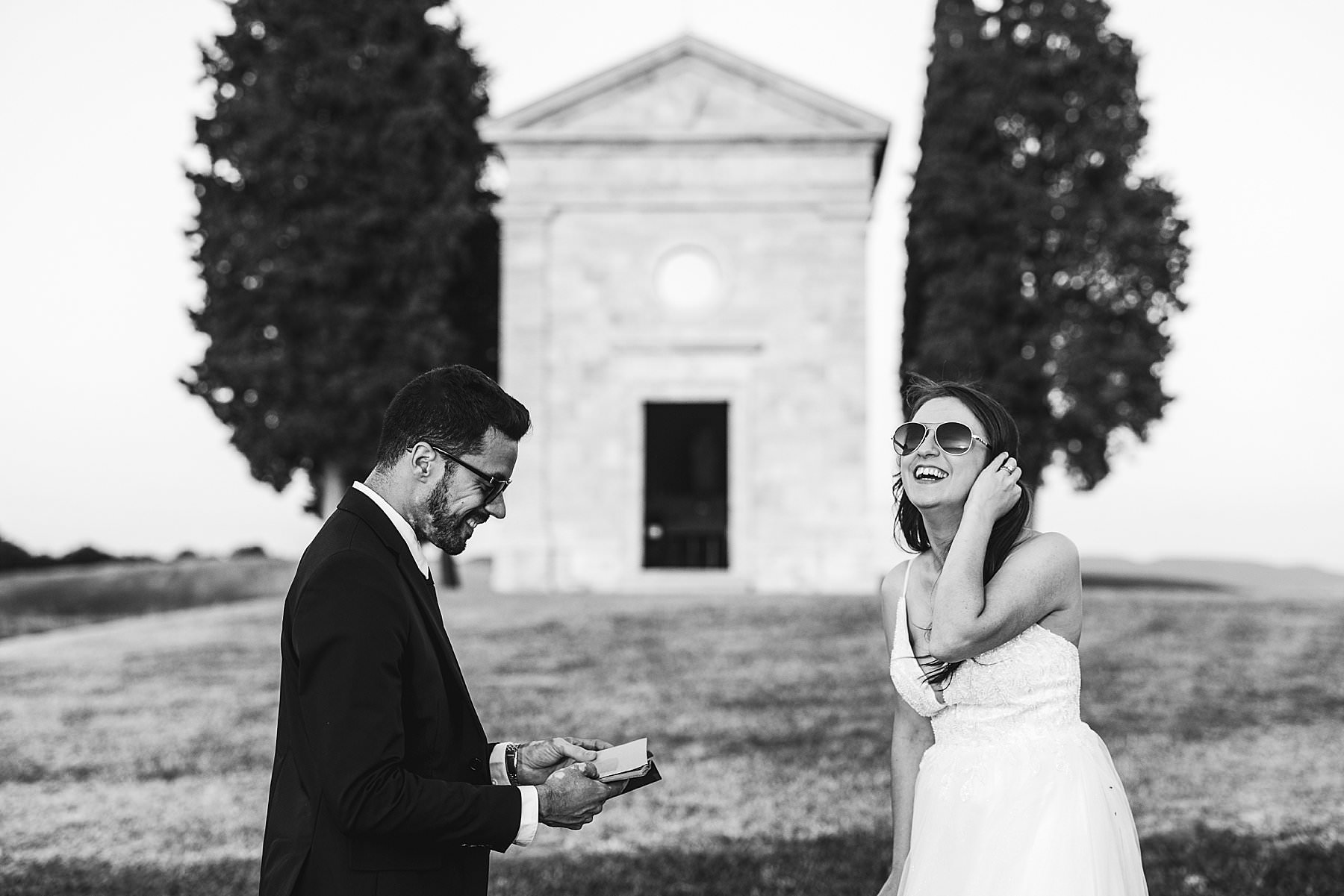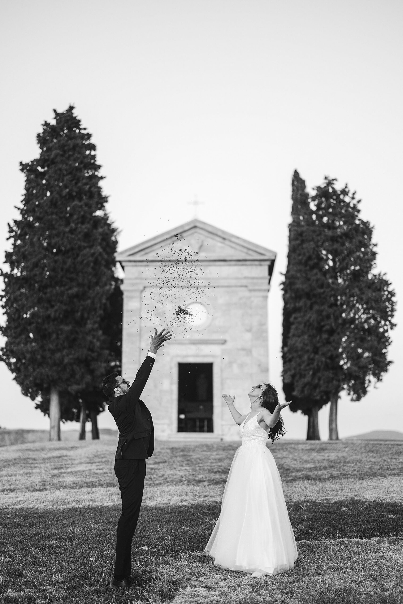 Exciting bride and groom elopement celebration in the golden hour light in the countryside of Tuscany at Vitaleta Chapel near Pienza. Photo by the Italian elegant wedding photographer in Tuscany based Florence Gabriele Fani
