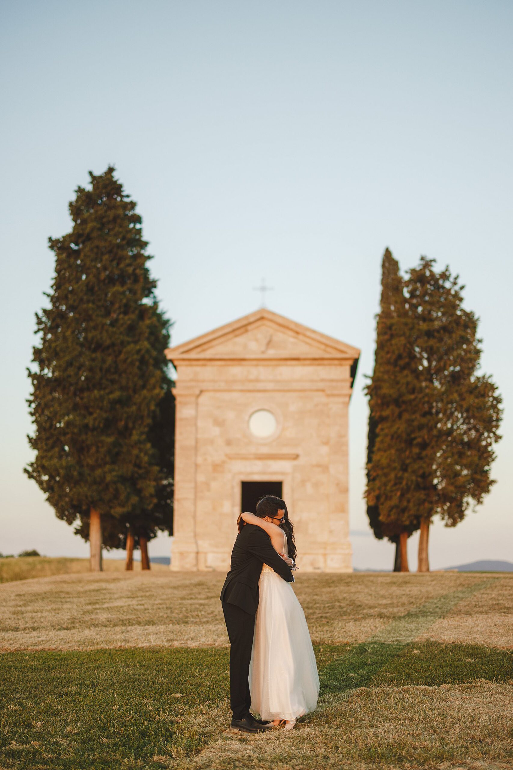 Bride and groom elopement wedding photo in Val d’Orcia, at the little Chapel of the Madonna di Vitaleta. Photo by the Italian elegant wedding photographer in Tuscany based Florence Gabriele Fani