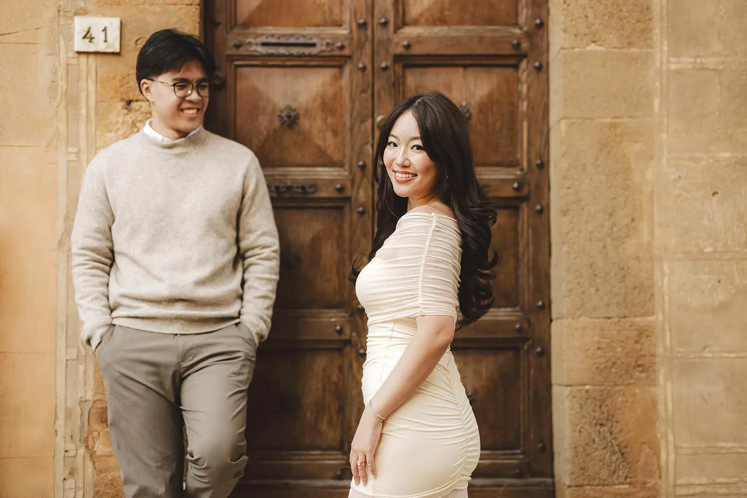 Classic and creative engagement photo shoot in the streets of Pienza. Photo by the Italian elegant and classic proposal photographer in Tuscany Gabriele Fani