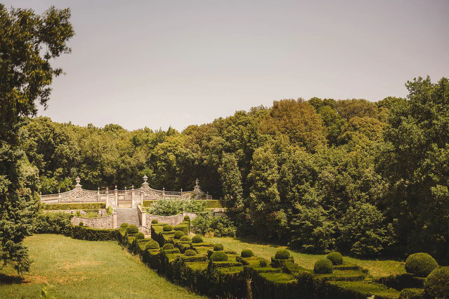Timeless bride and groom wedding photos in the Italian garden of Castello di Celsa luxury venue. Photo by the Italian elegant wedding photographer in Tuscany Gabriele Fani
