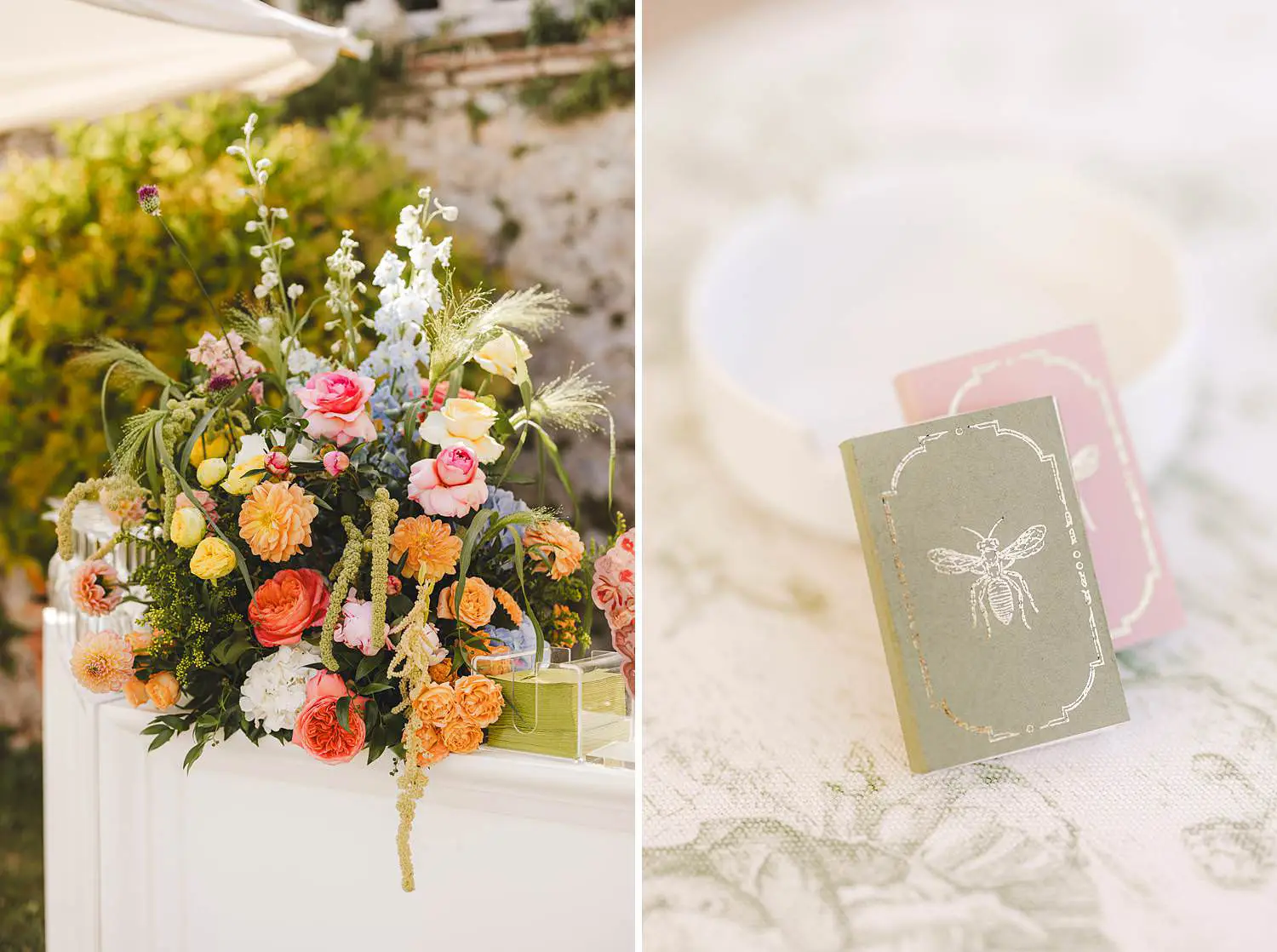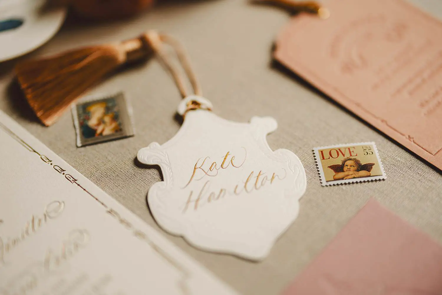 A luxury and elegant stationery in rose, orange, white and blue colours at Castello di Celsa wedding in Tuscany. Photo by the Italian elegant wedding photographer in Tuscany Gabriele Fani