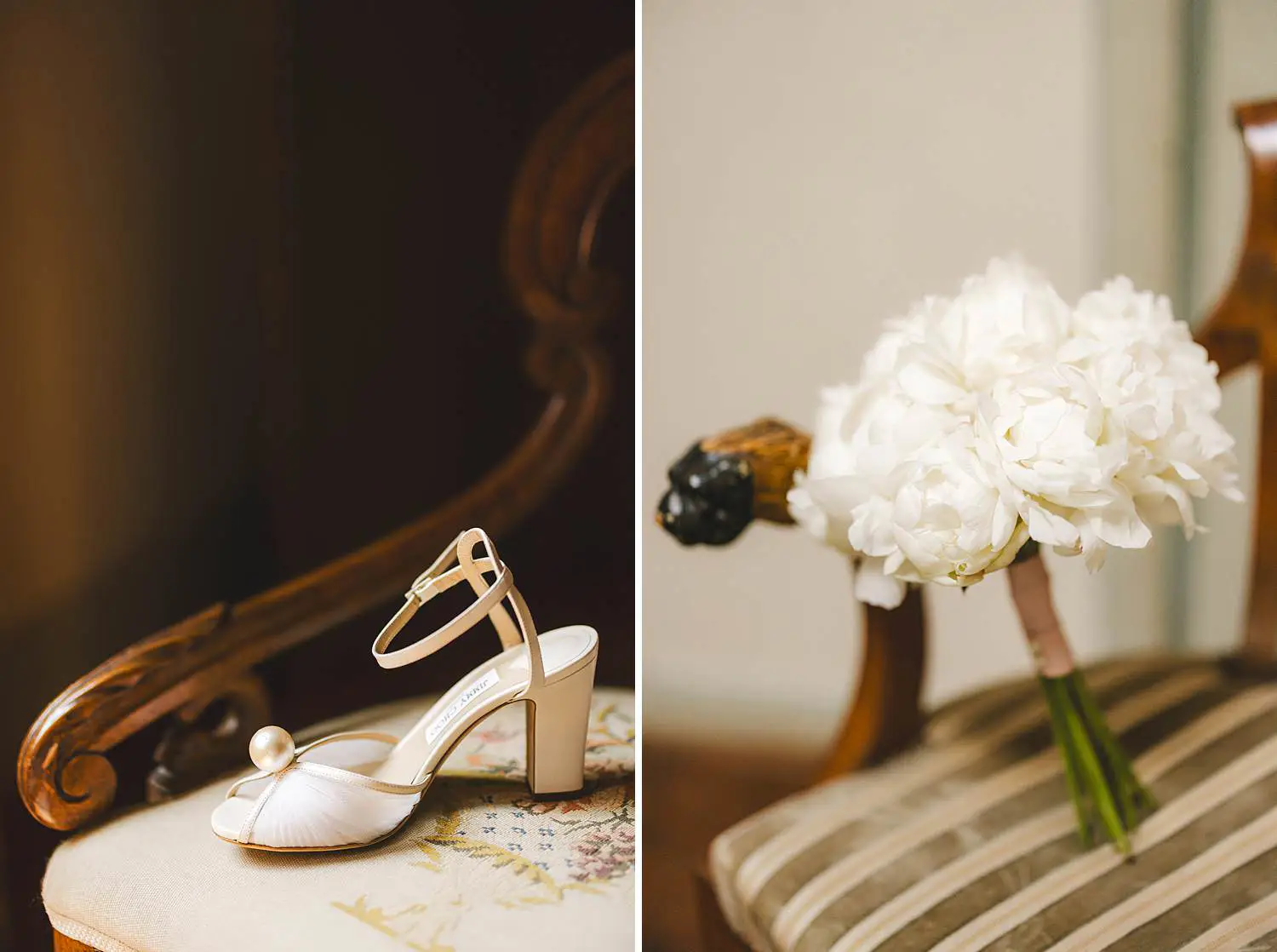 Bridesmaids are helping the bride to wear wedding shoes at luxury Castello di Celsa before the first look. Photo by the Italian elegant wedding photographer in Tuscany Gabriele Fani