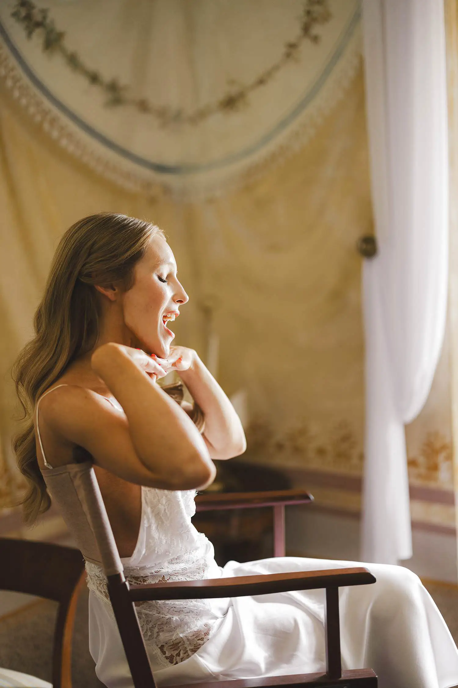 Gorgeous bride in her gown almost ready for her luxury wedding ceremony at Castello di Celsa in Tuscany. Photo by the Italian elegant wedding photographer in Tuscany Gabriele Fani